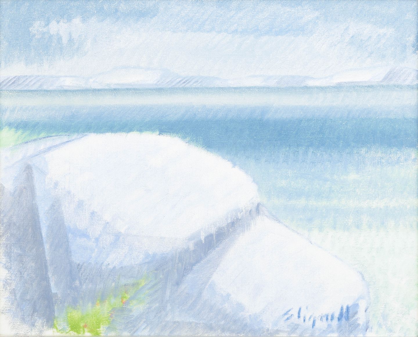 Sven Lignell, oliemaleri på lærred, svensk modernist.Landskabsmotiv udført i dæmpede, lyse farvetoner med en stiliseret gengivelse af klippeformationer i forgrunden og vand samt fjern horisont i baggrunden. Kompositionen er karakteriseret ved en rolig, næsten grafisk opbygning og en reduceret farvepalet typisk for nordisk modernistisk landskabsmaleri fra midten af det 20. århundrede.