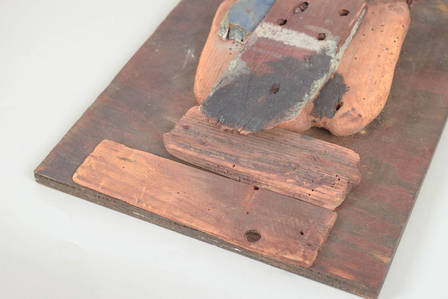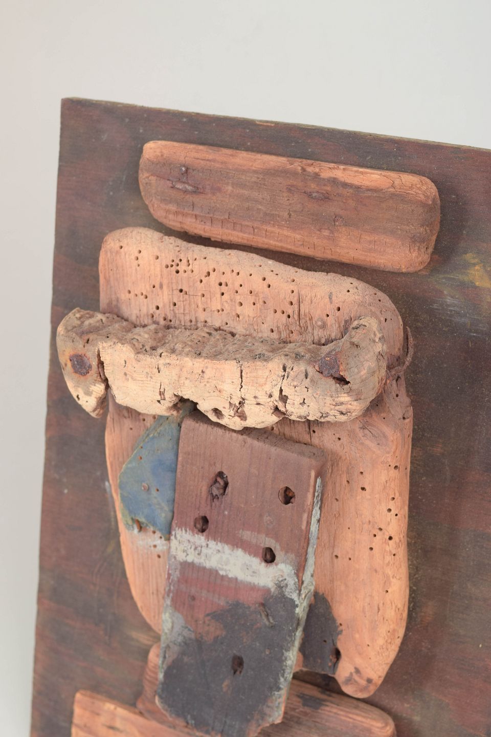 Johan Andersen, trærelief.Abstrakt vægrelief udført som collage af forskellige træstykker monteret på træplade. Kompositionen består af drivtømmer-lignende fragmenter og groft bearbejdede træelementer med tydelige naturlige strukturer, patina og spor efter alder.