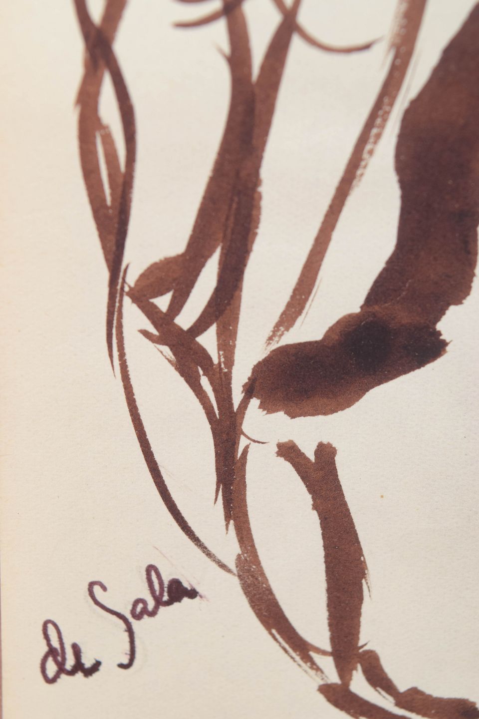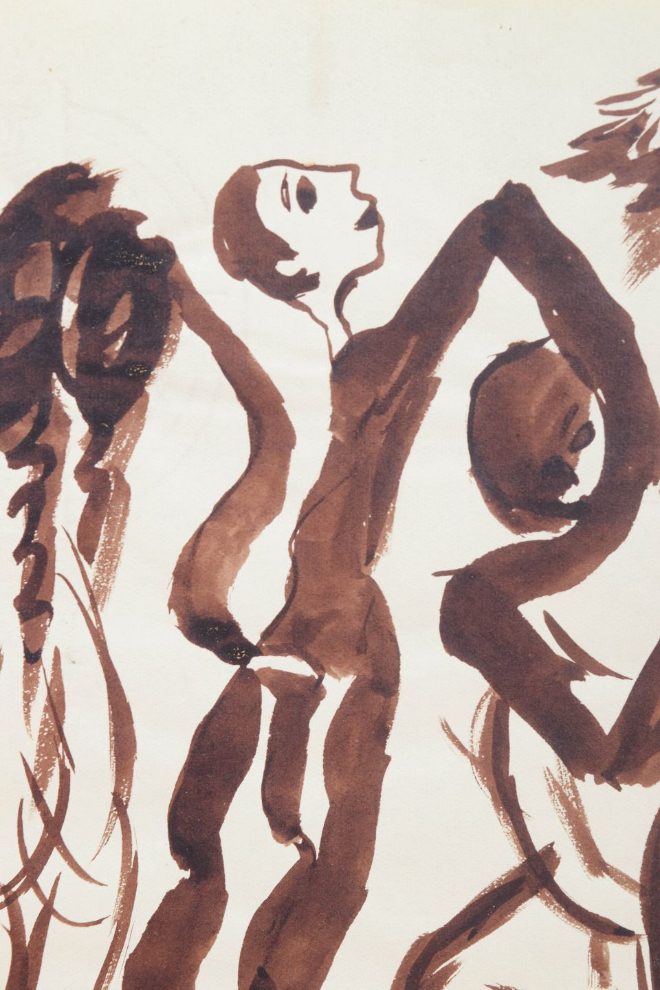 Eugène de Sala, tegning.Art deco figurtegning udført på papir med fri og ekspressiv penselstreg i brun tone. Kompositionen viser flere stiliserede menneskefigurer i bevægelse, gengivet med en dynamisk og rytmisk linjeføring karakteristisk for 1930’ernes avantgardistiske tegnekunst. Signeret i blyant nederst.