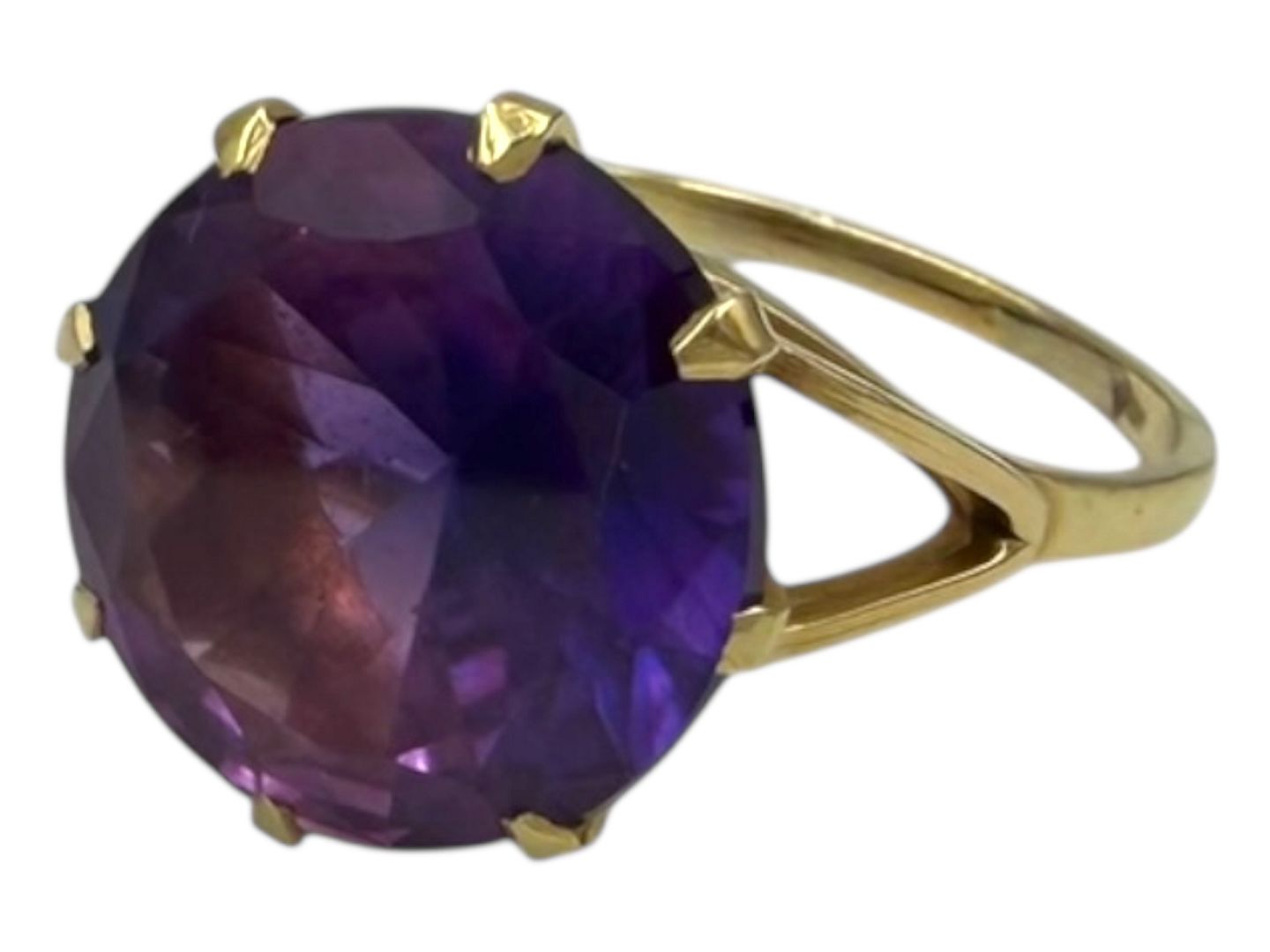 Herman Siersbøl, 14 karat guld ring med stor lilla ametyst.Stemplet "HS 585". Herman Siersbøl var sølv- og guldsmed i Kastrup fra 1948 til ca 2000. Denne er fra omkring 1960.