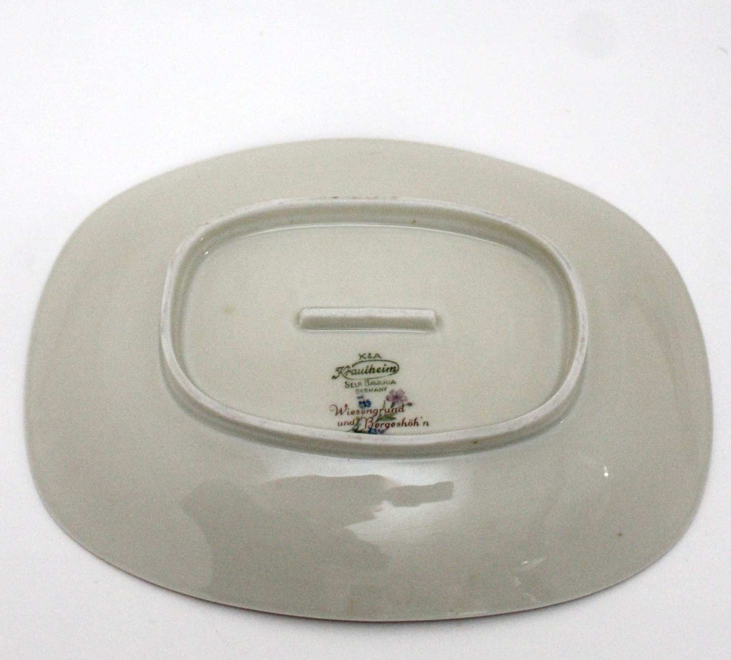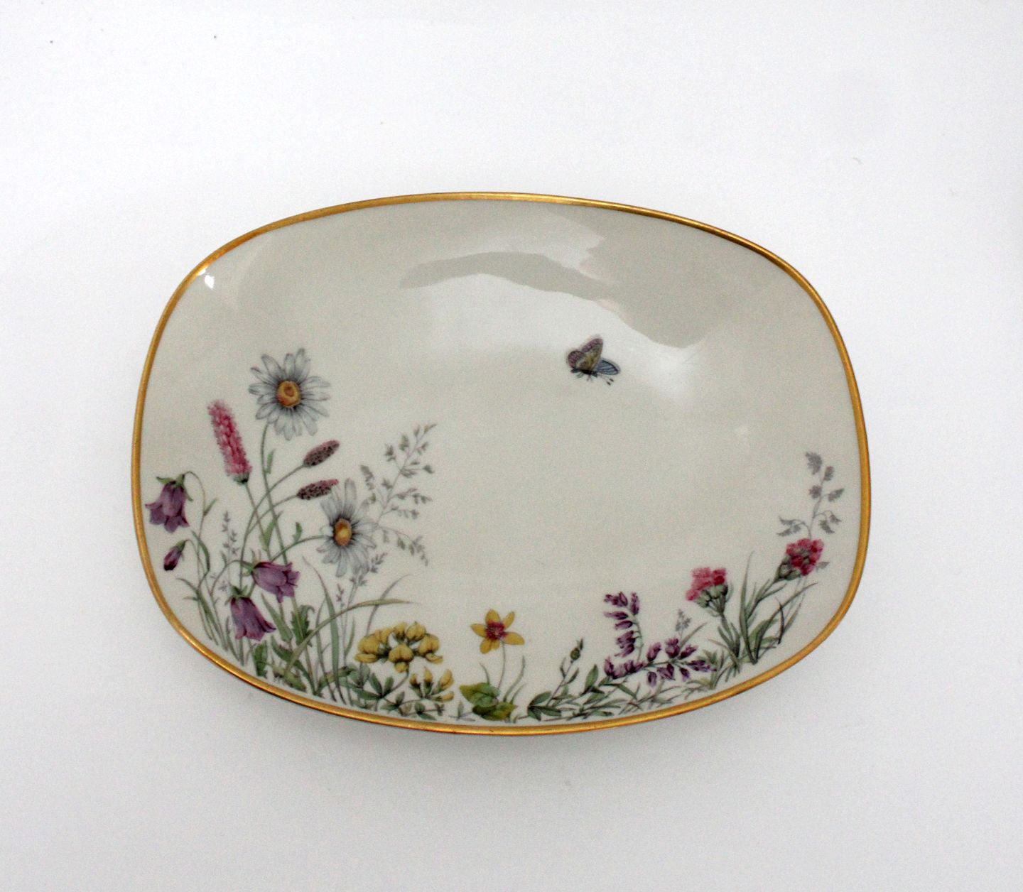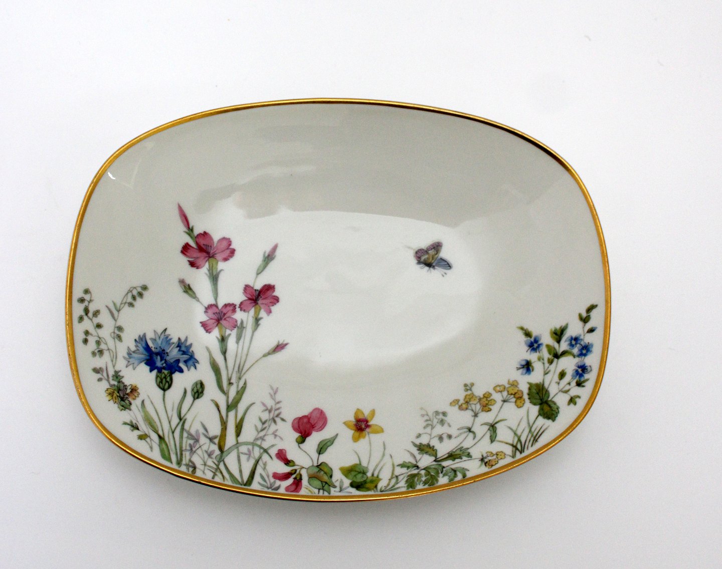 Krautheim, Selb Bavaria, Germany, Danmarks Flora cremet stel med guldkanter motiv Danmarks flora.Rektangulært fad på fod, 2 forskellige motiver. Længde 22 cm. Bredde 17,5 cm. Højde 4 cm. Pris: 175 kr. stk. Lager: 2