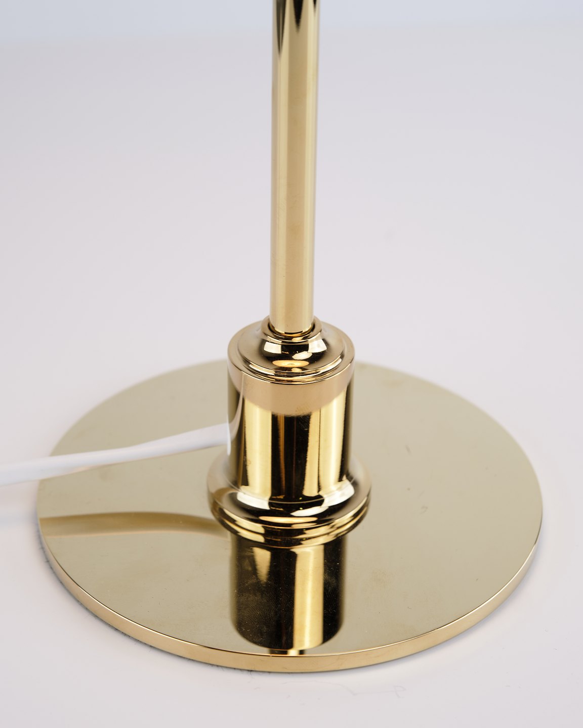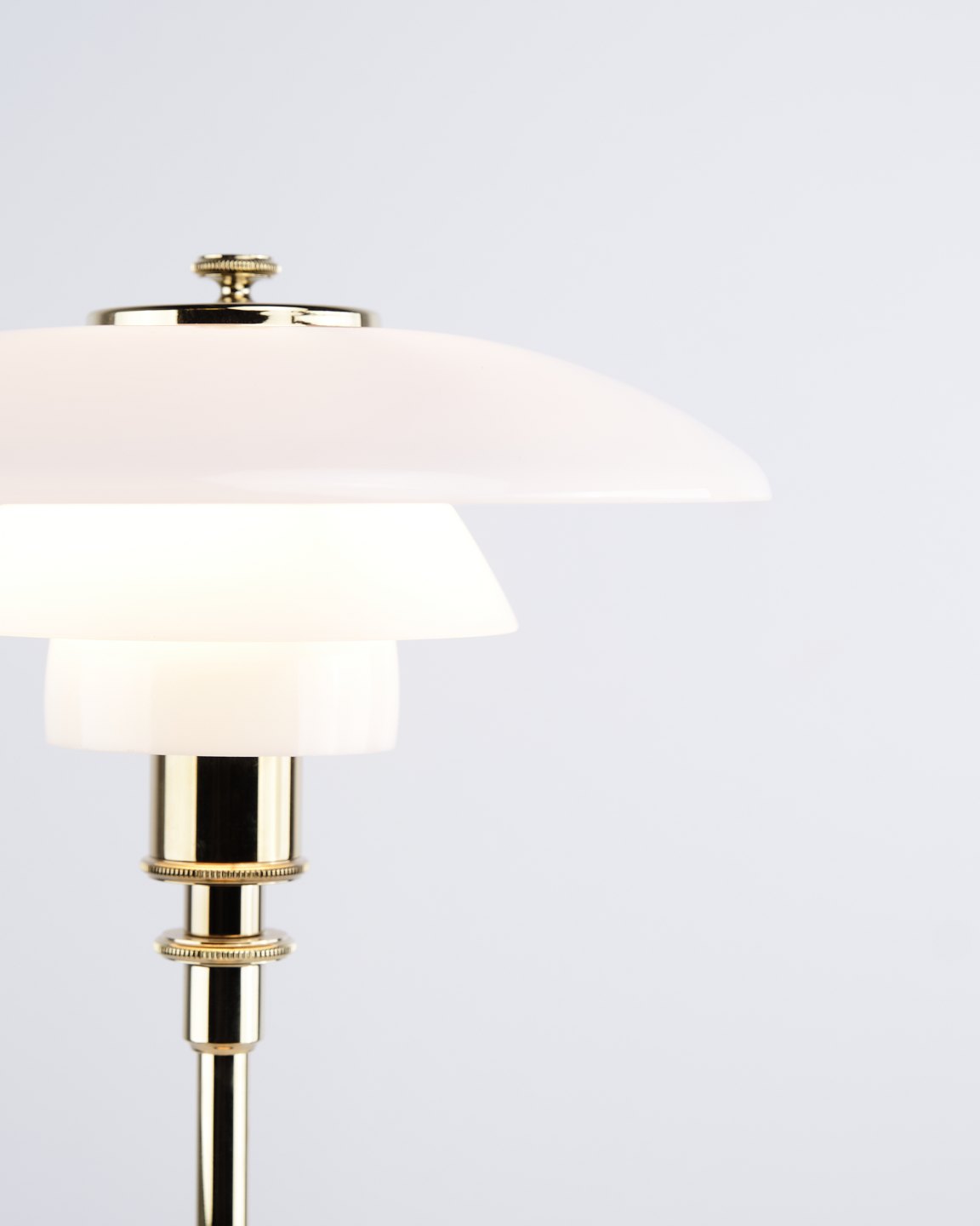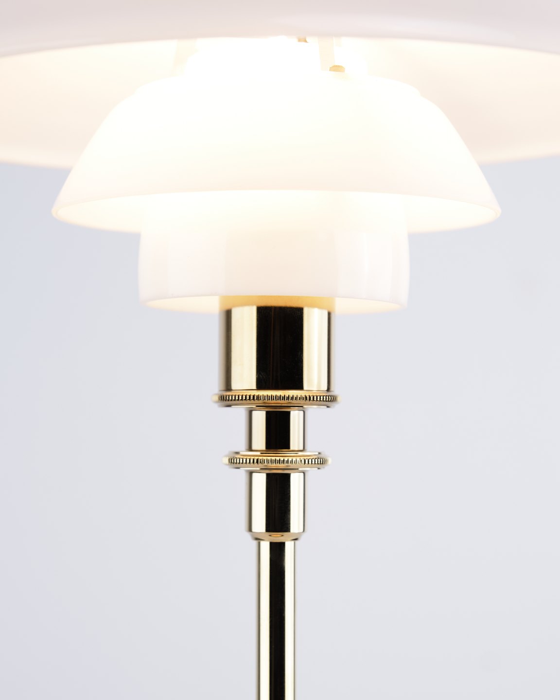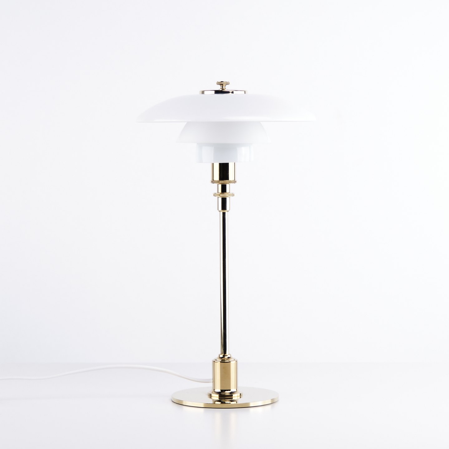 PH 2/1 Tischlampe, entworfen von Poul Henningsen und in dieser Version im Jahr 2019 von Louis Poulsen eingeführt. Die Lampe ist mit einem Fuß aus Messing und Schirmen aus weißem Opalglas ausgeführt, die ein weiches und angenehmes Licht erzeugen. Das ikonische Dreischirmsystem wurde entwickelt, um eine optimale Lichtverteilung zu gewährleisten und Blendung zu minimieren.— Herkunft: Dänemark