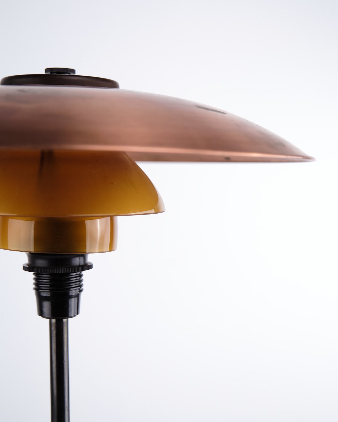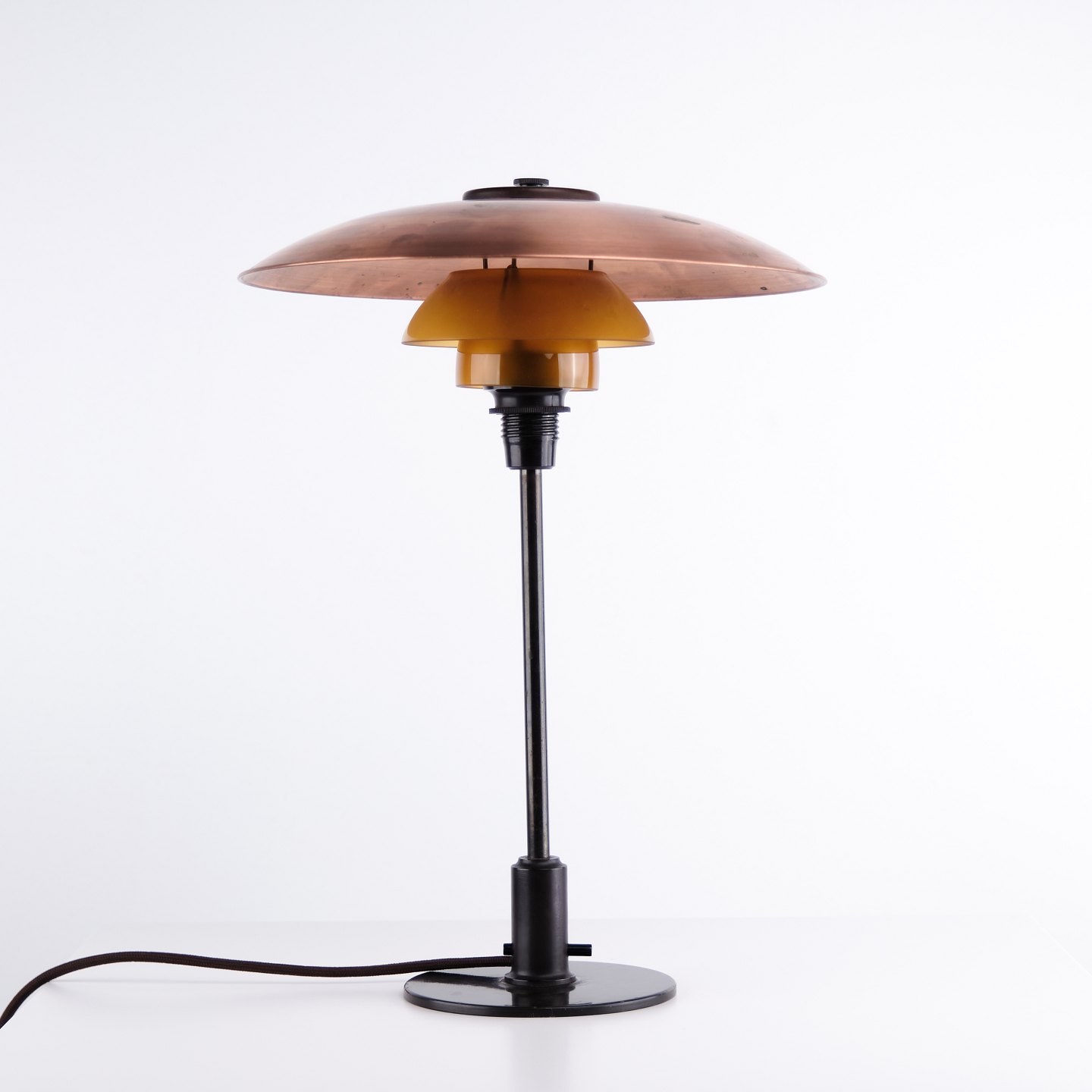 Poul Henningsen Tischlampe Modell PH 3,5/2 aus Kupfer mit bernsteinfarbenen Schirmen und Fuß aus brüniertem Messing, Louis Poulsen 1930er Jahre