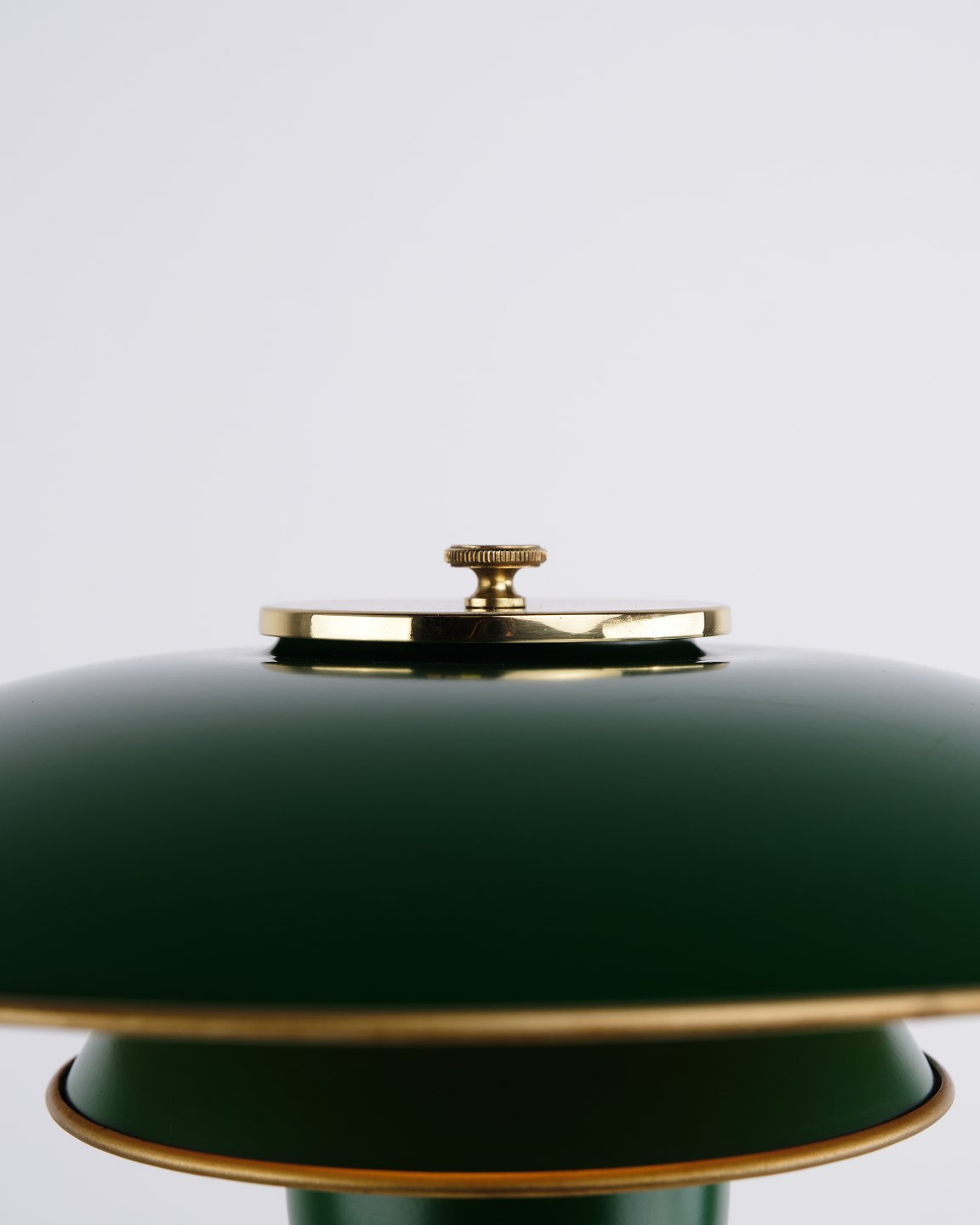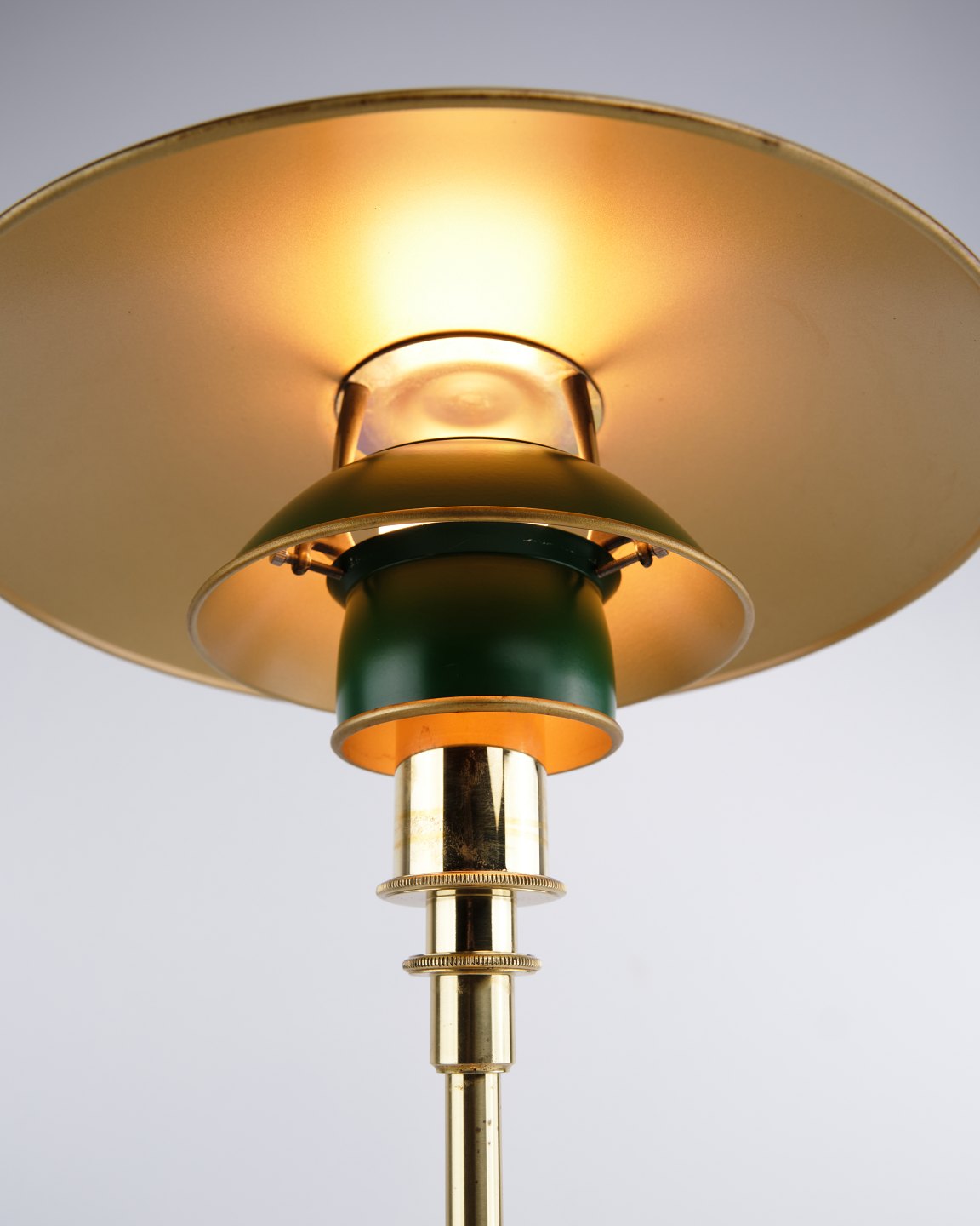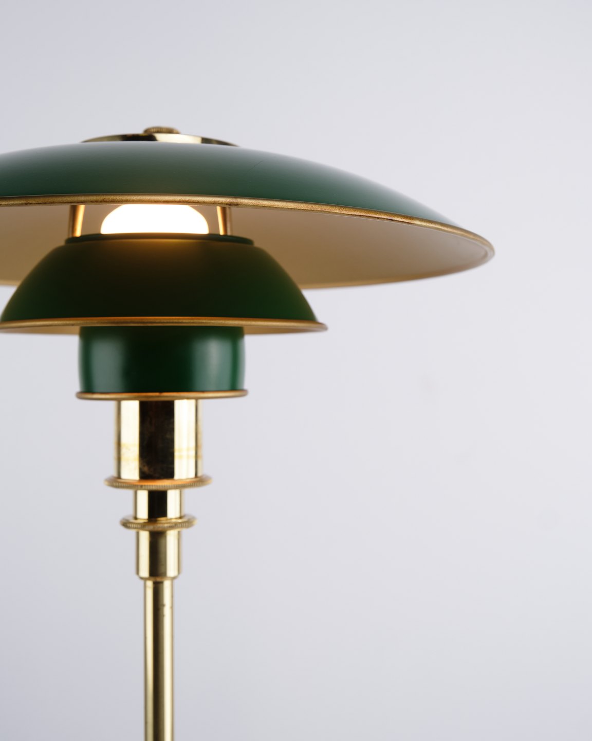 Poul Henningsen Tischlampe Modell PH 3/2 Jubiläumsausgabe aus Messing mit grünen Metallschirmen für Louis Poulsen