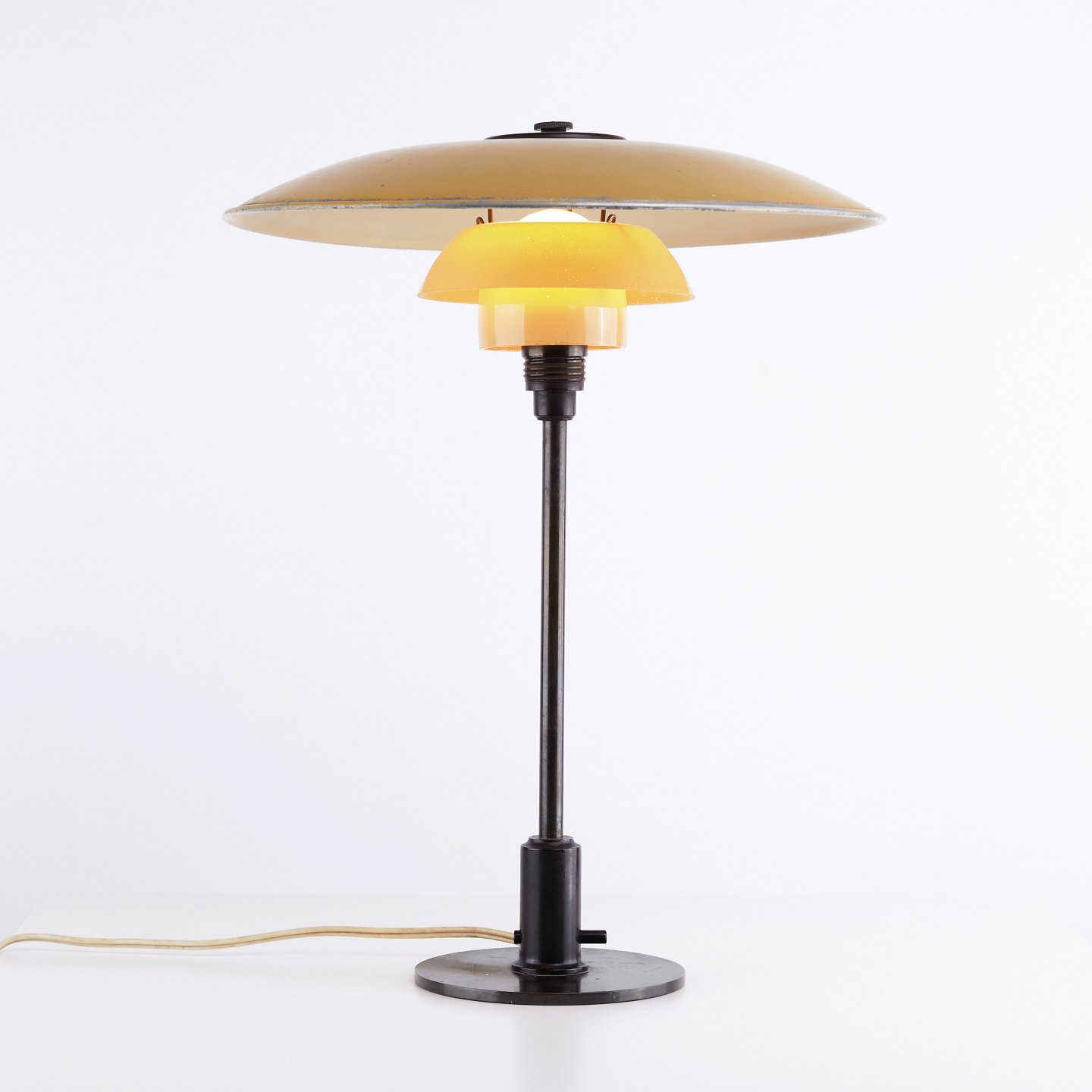 Seltene PH 3,5/2,5 Tischlampe, entworfen von Poul Henningsen und hergestellt von Louis Poulsen in den 1930er Jahren. Die Lampe verfügt über einen gelb lackierten Metall-Oberschirm mit Gestell aus brüniertem Messing sowie Mittel- und Unterschirme aus einlagigem gelb lackiertem Opalglas.— Herkunft: Dänemark