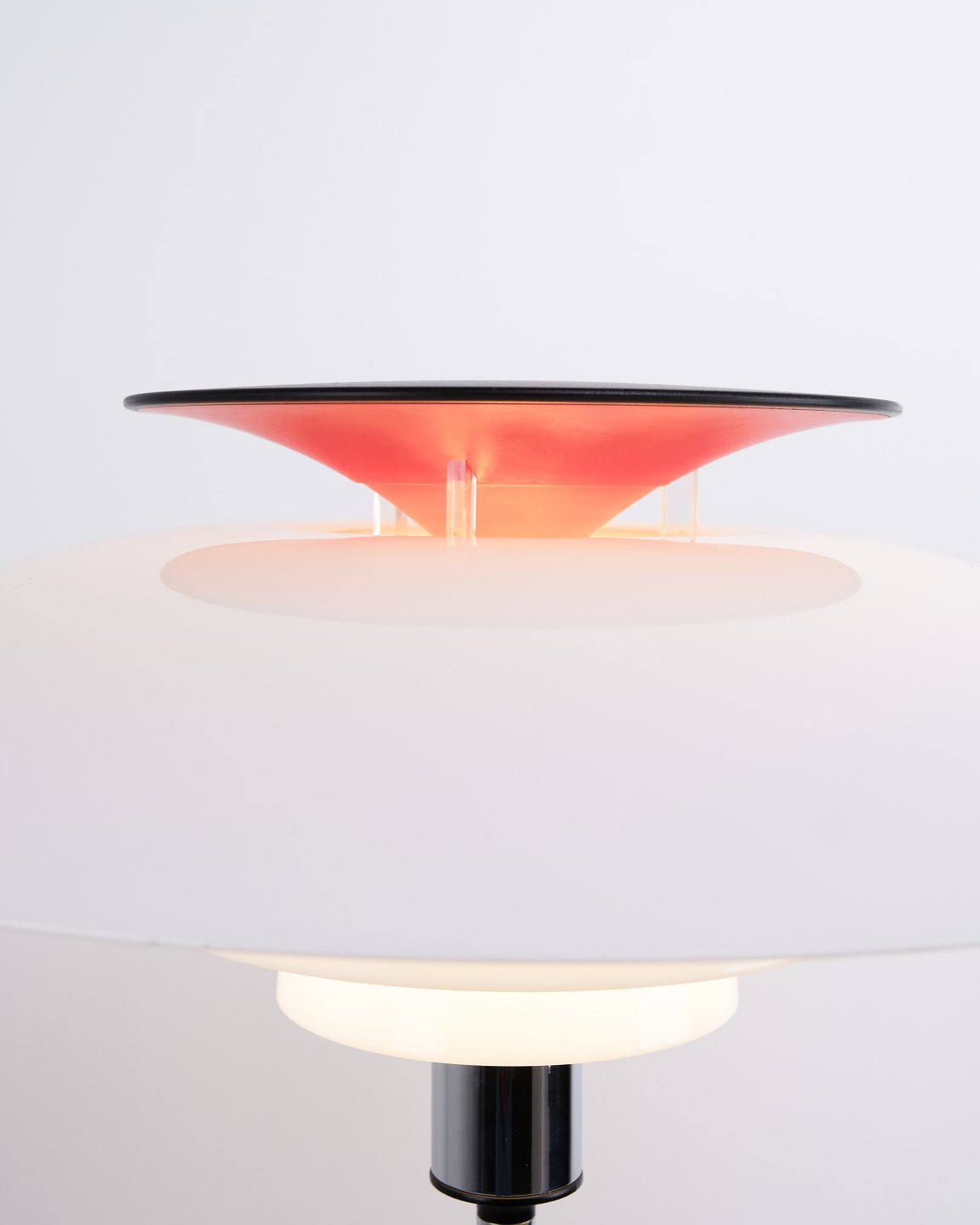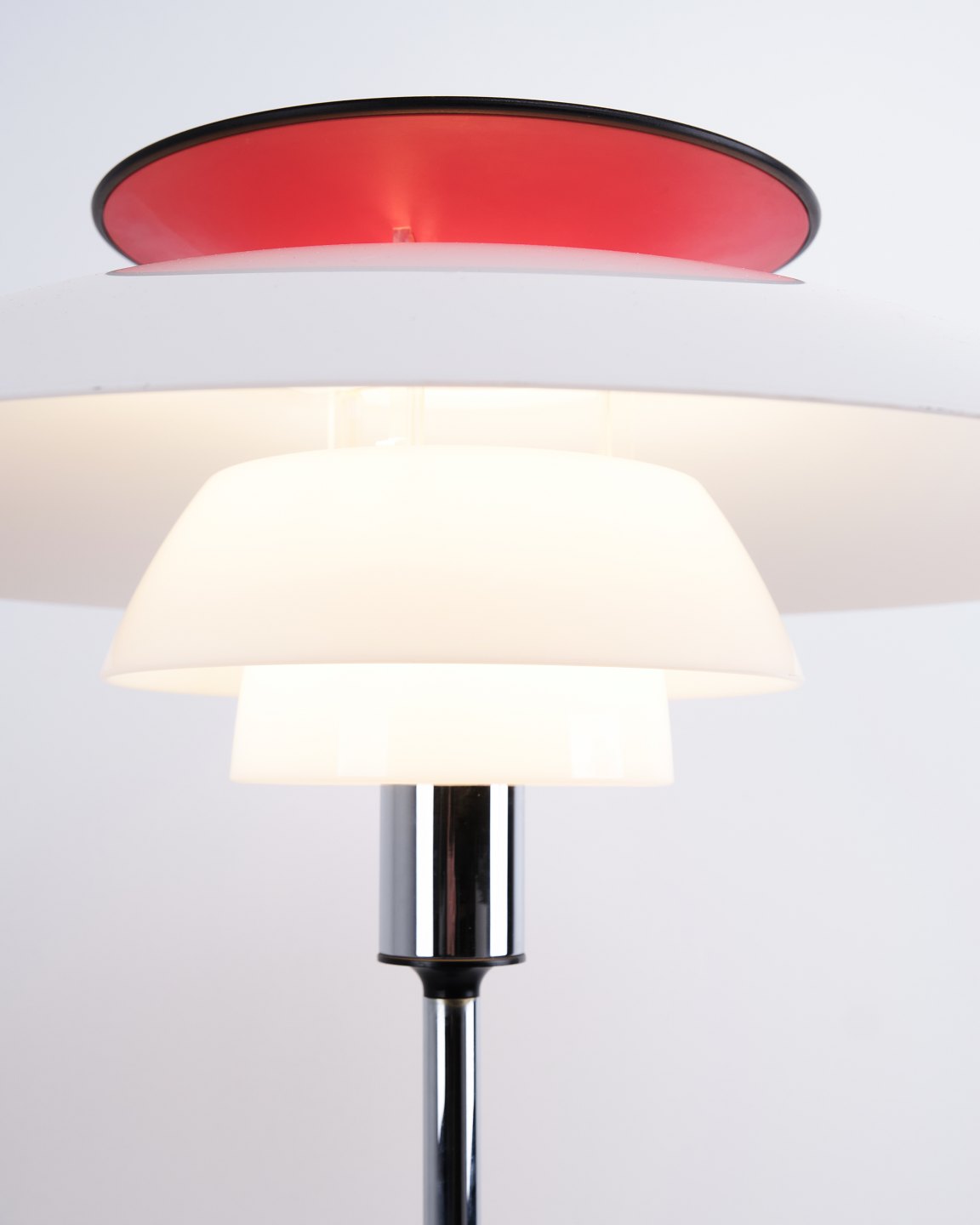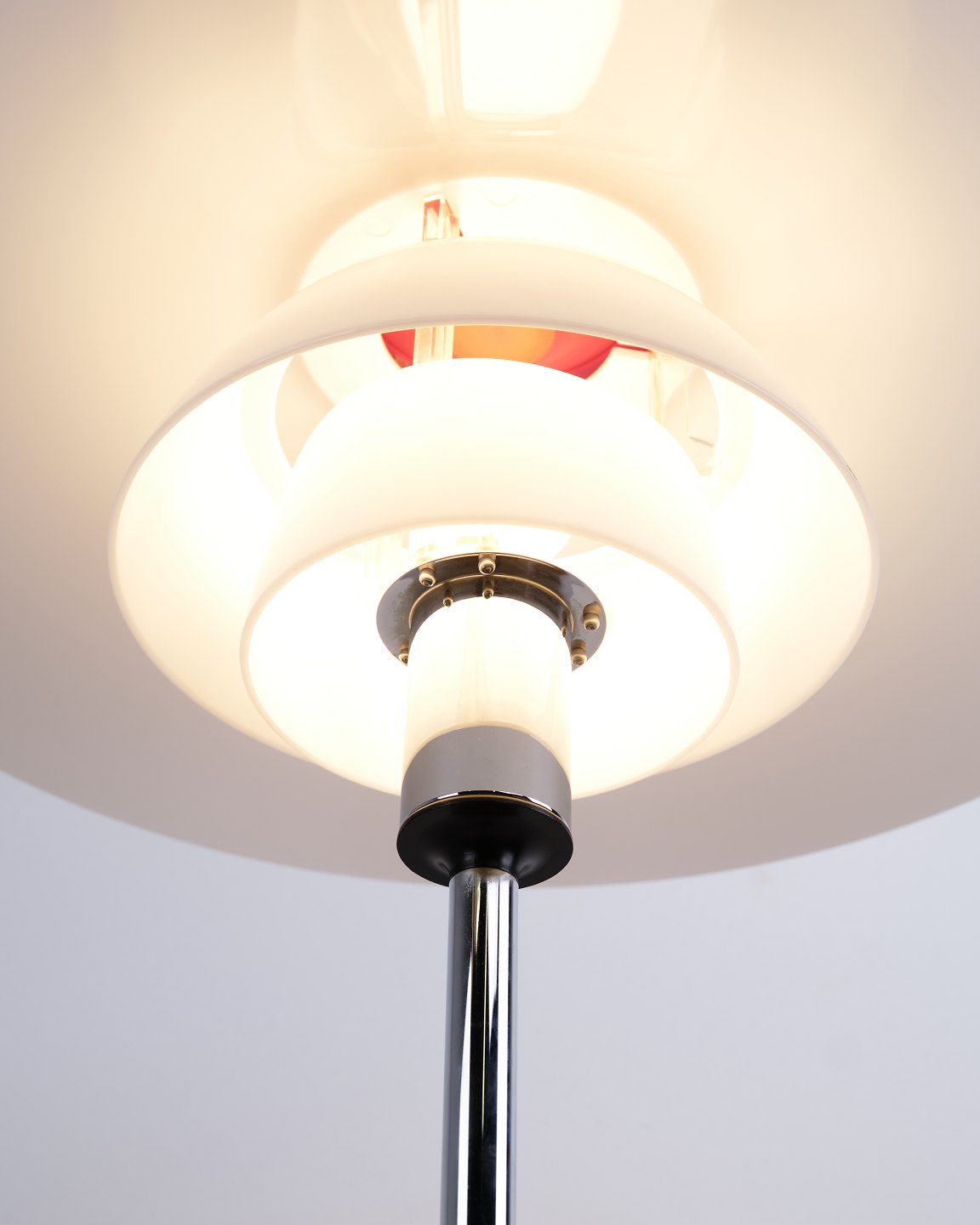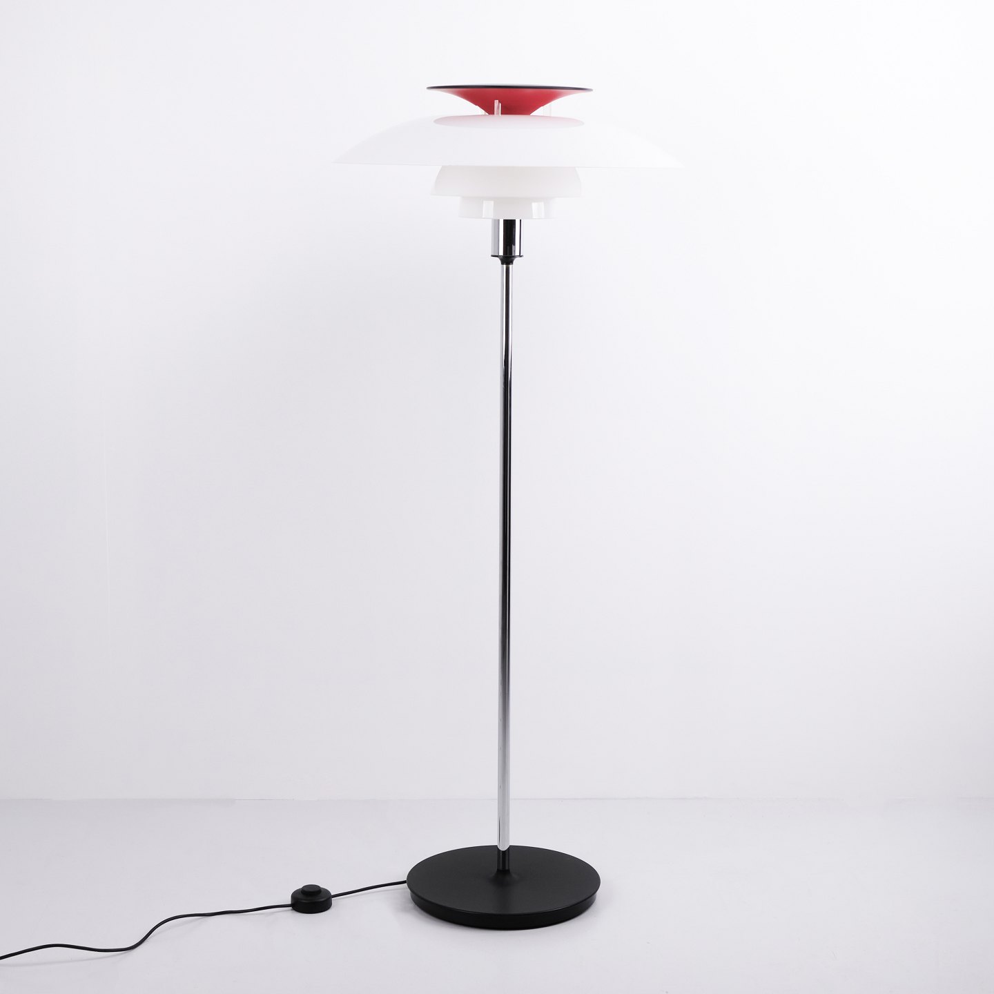 PH 80 Stehlampe, entworfen von Poul Henningsen und hergestellt von Louis Poulsen. Die Lampe wurde 1974 anlässlich des 80. Geburtstags von Poul Henningsen eingeführt. Sie ist mit Schirmen aus weißem Opal-Acryl und einem Gestell aus Chrom ausgeführt, was ihr einen leichten und modernen Ausdruck verleiht.