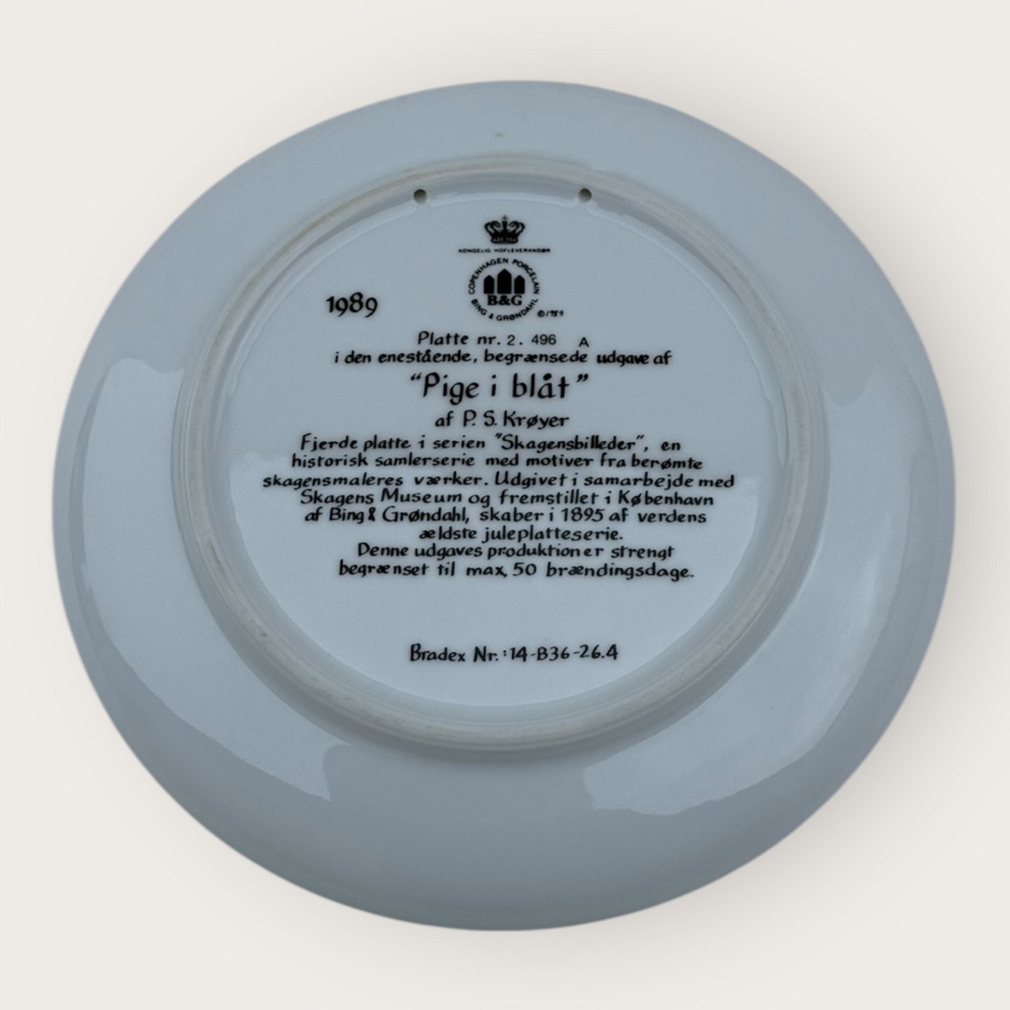 Bing & Gröndahl, Skagensmalerne, 1986, Plattennr. 2, # 496A, „Mädchen in Blau“ P.S. Krøyer, 21 cm Durchmesser *Perfekter Zustand*