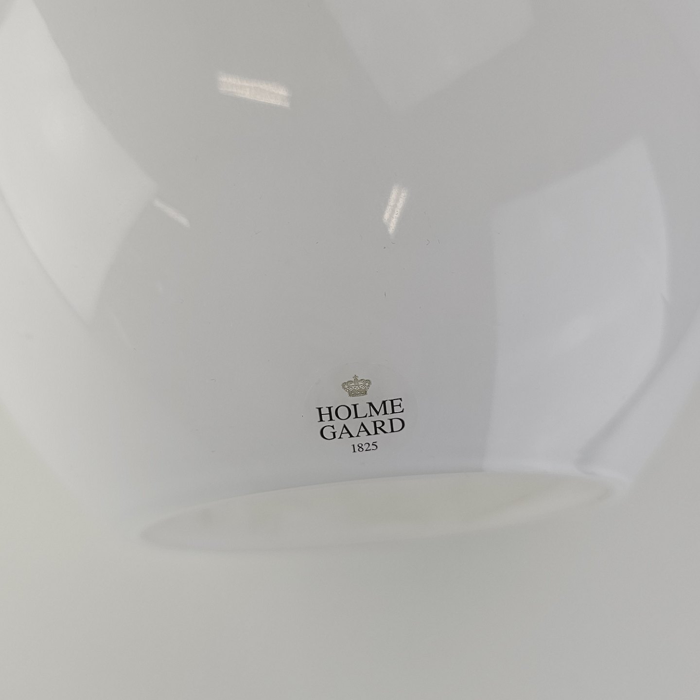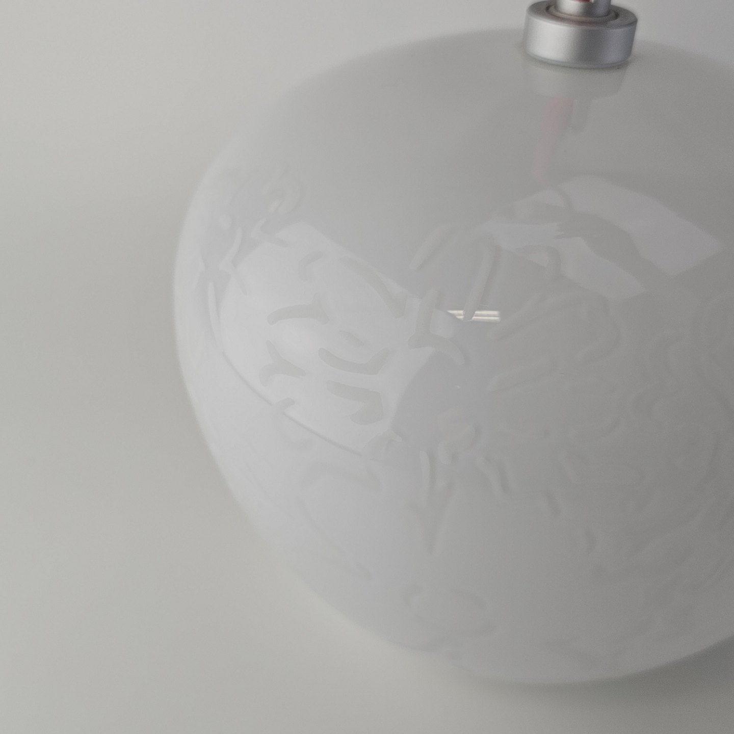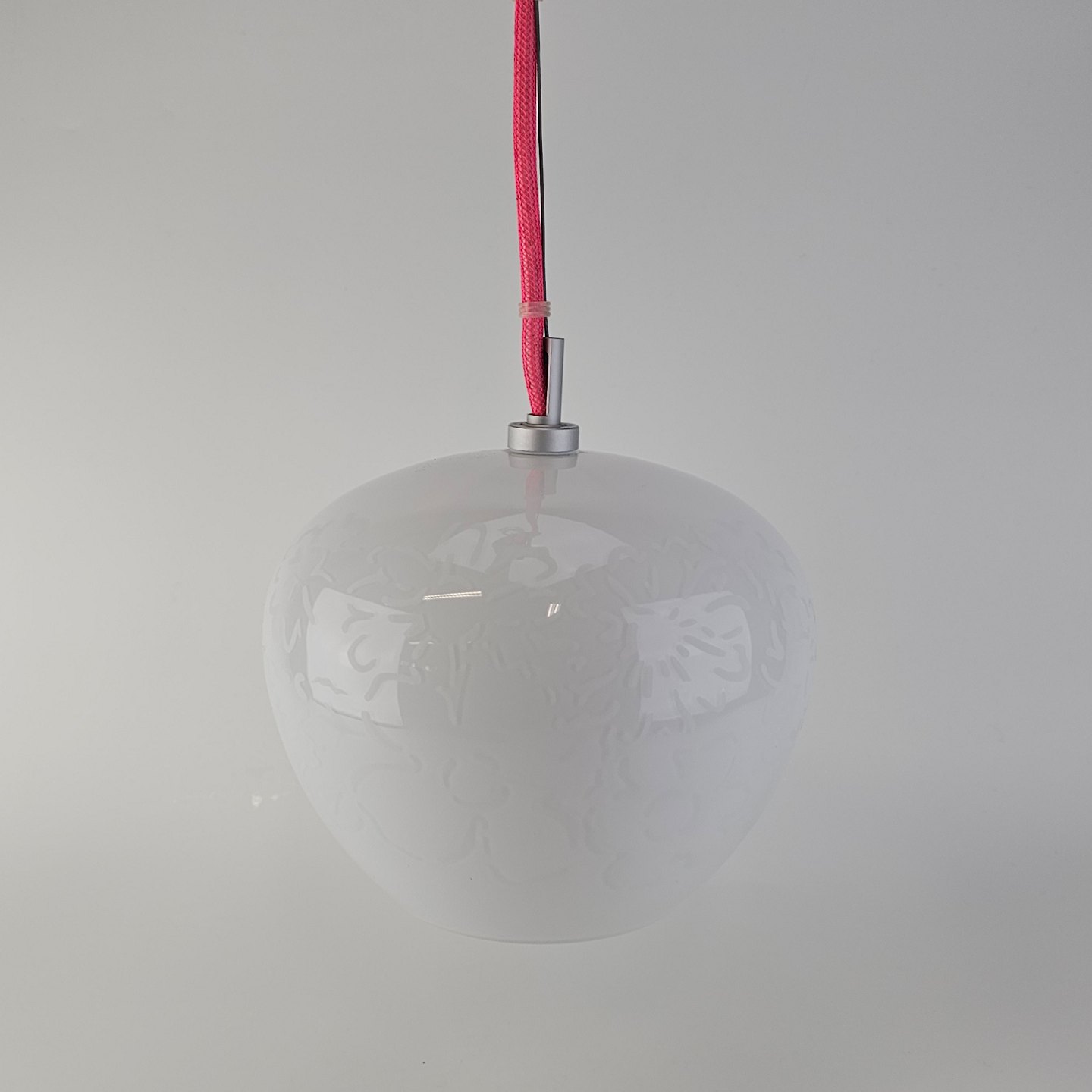Pendel i hvidt mundblæst glas med blomstermotiver og monteret med lyserød ledningModel Organics