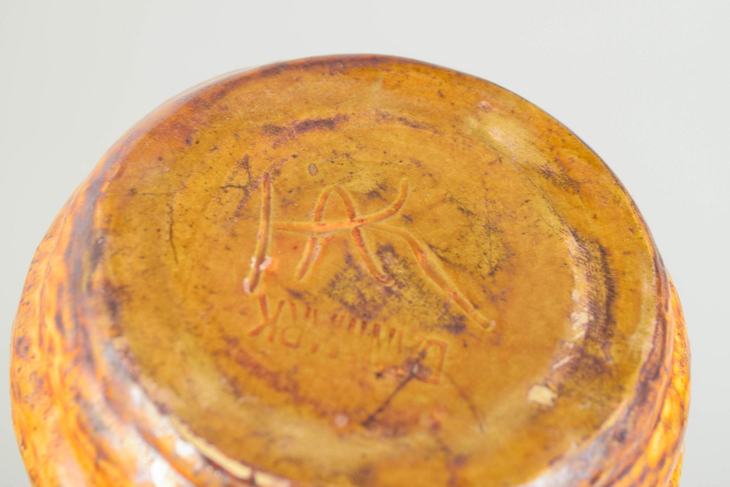 Karl Hansen Reistrup for Kähler, krukke med slange.Dekorativ krukke i glaseret lertøj med modellering af slange langs randen. Udført i kraftig gul/orange krakeléglasur med levende spil i overfladen. Signeret HAK i bunden. Fremstår med produktionsfejl i form af revne ved randen, opstået under brænding.