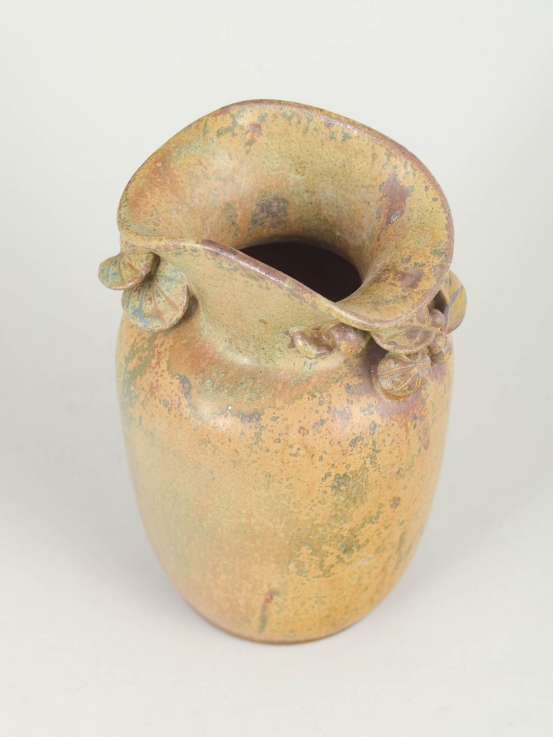 Arne Bang, vase med blade.Hånddrejet stentøjsvase med modelnummer 16, udført i organisk form med reliefdekoration af blade ved halsen og dækket af levende glasur i varme jordfarver med nuancerede overgange.