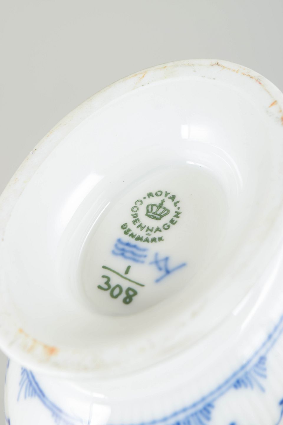 Royal Copenhagen blev grundlagt i 1775 og er en af Danmarks mest betydningsfulde porcelænsfabrikker. Fabrikken er særligt kendt for sine håndmalede dekorationer i underglasur blå, hvor Musselmalet Riflet er blandt de ældste og mest ikoniske stel. Hvert stykke er individuelt dekoreret af porcelænsmalere, hvilket gør hvert objekt unikt.