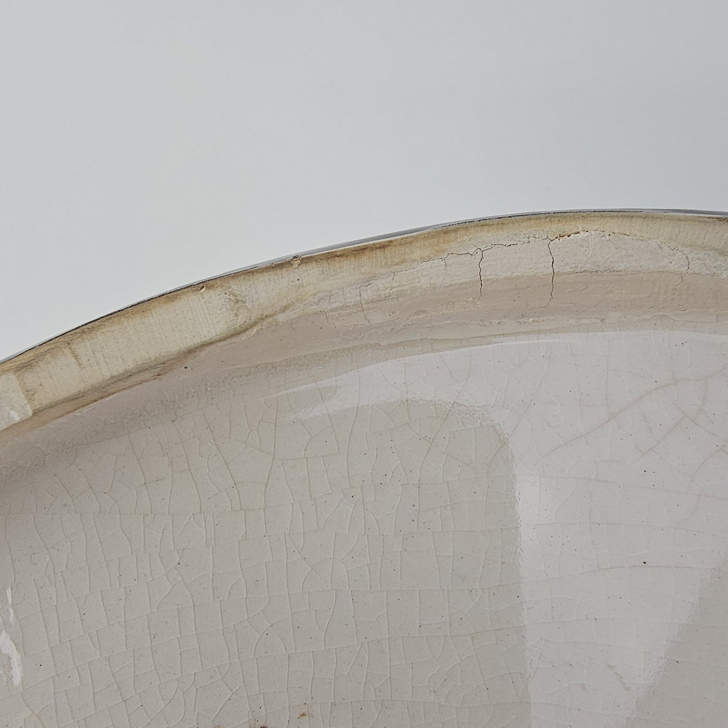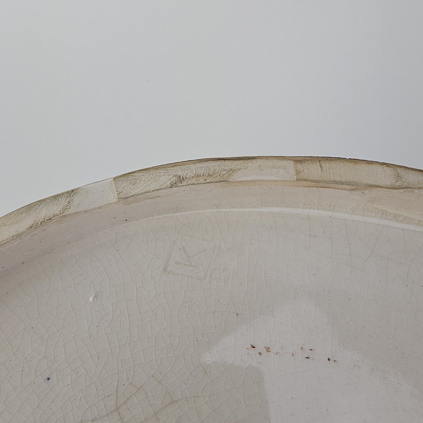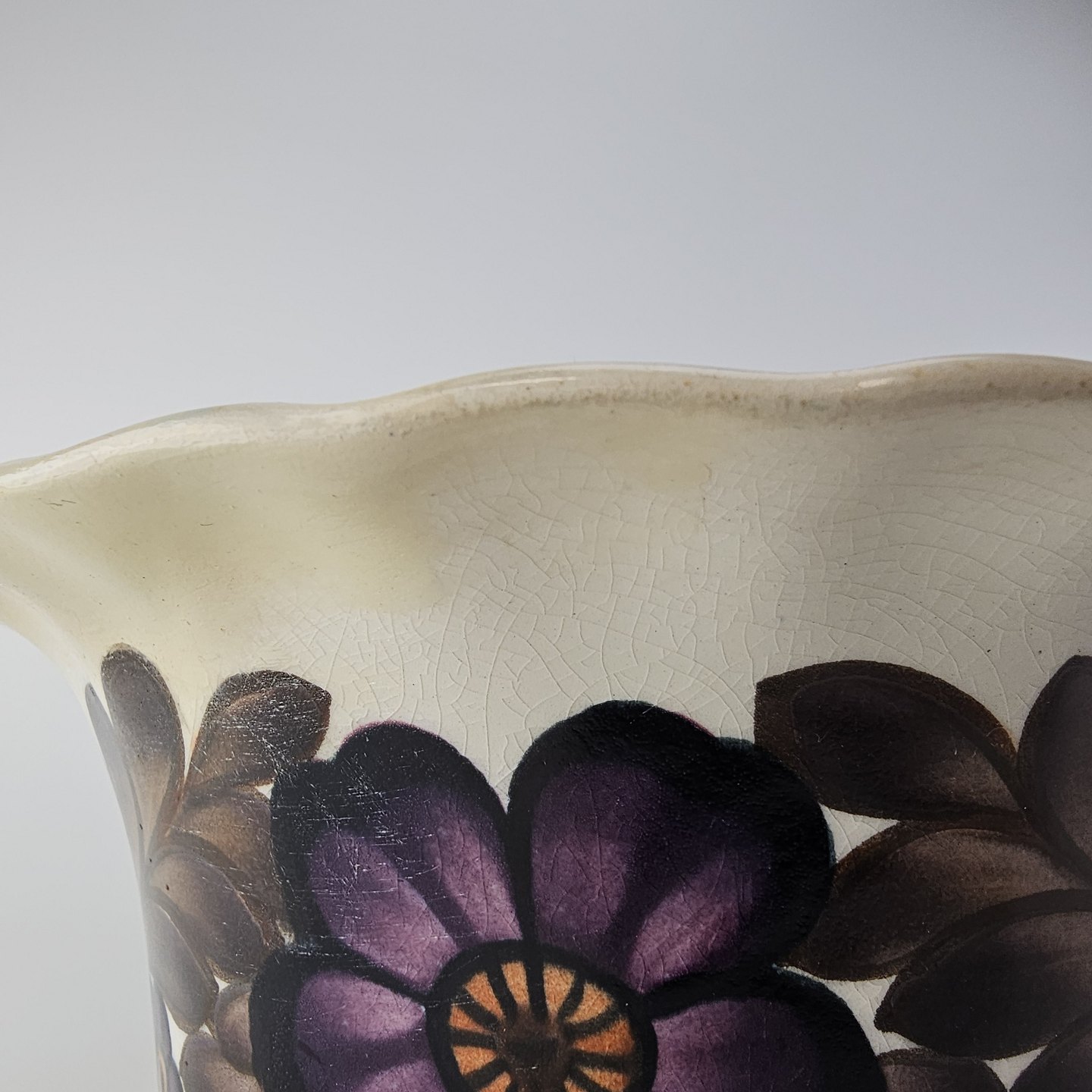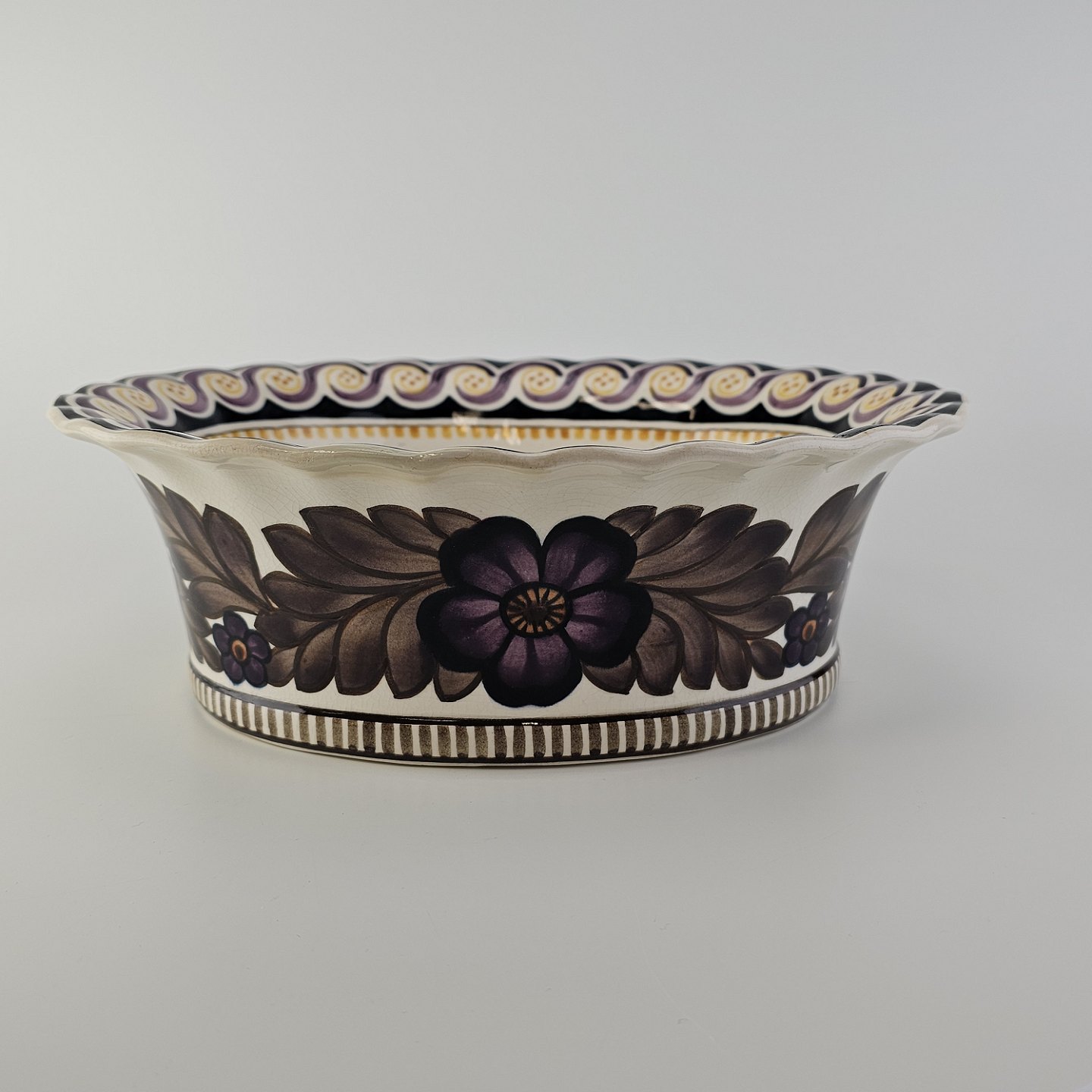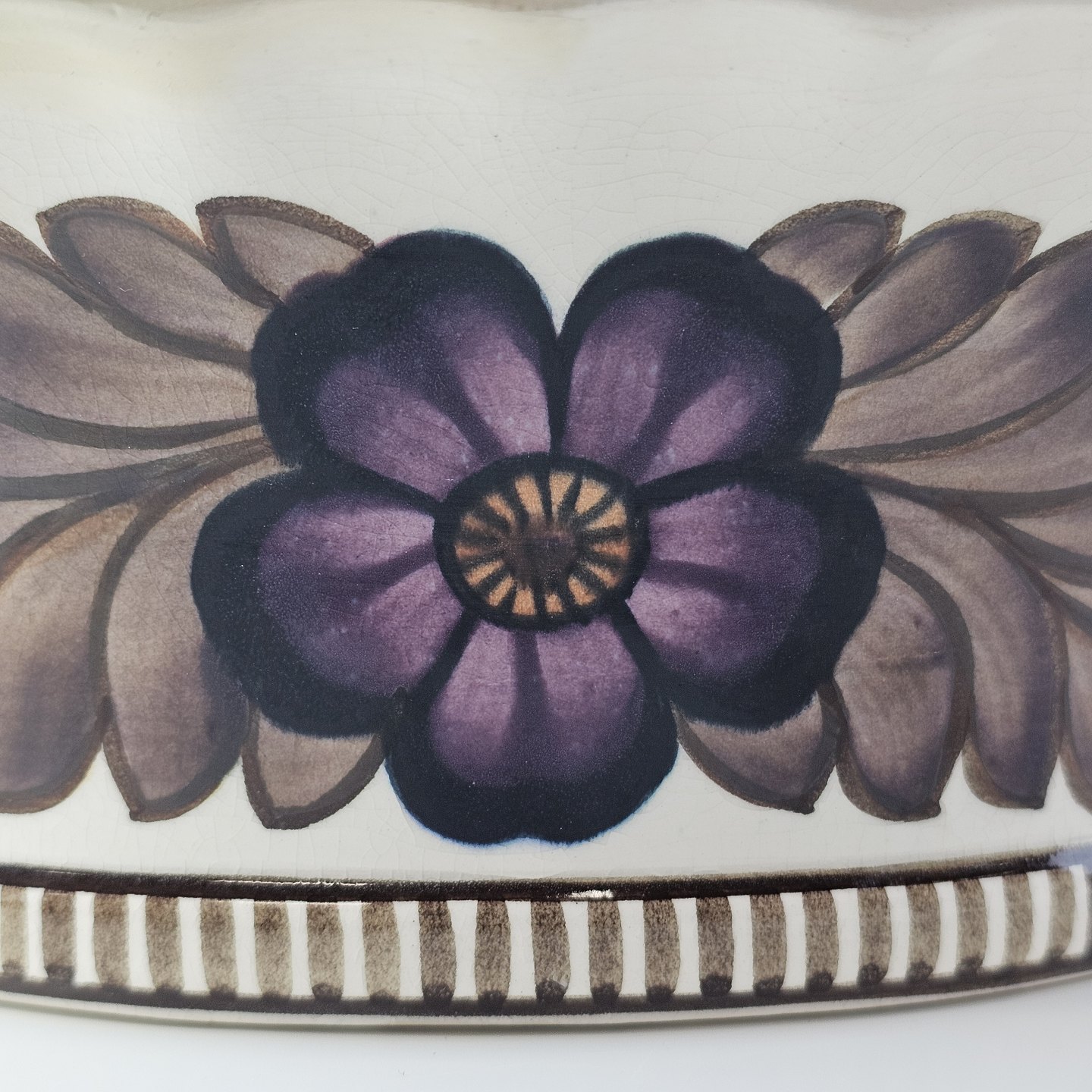 Oval jardiniere i fajance med dekoration af brun og lilla blomsterNr. 863/690