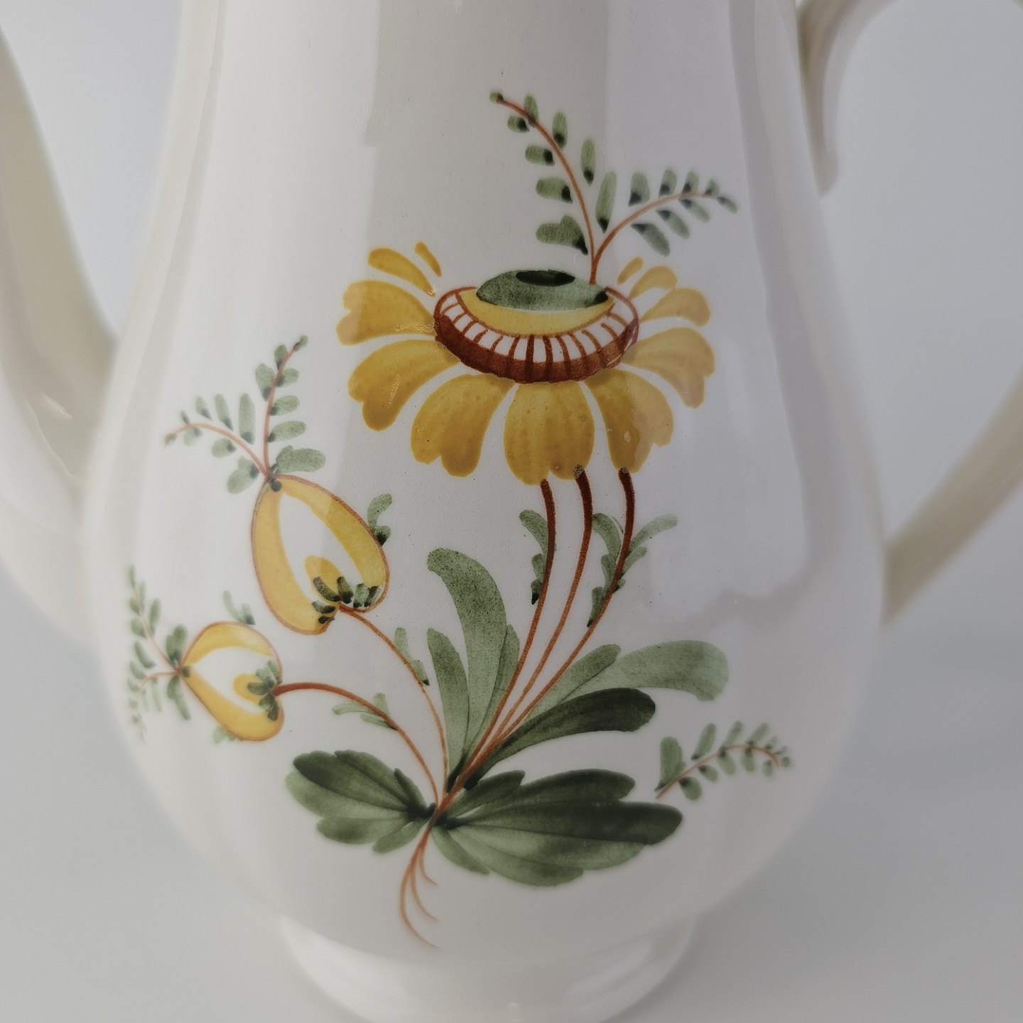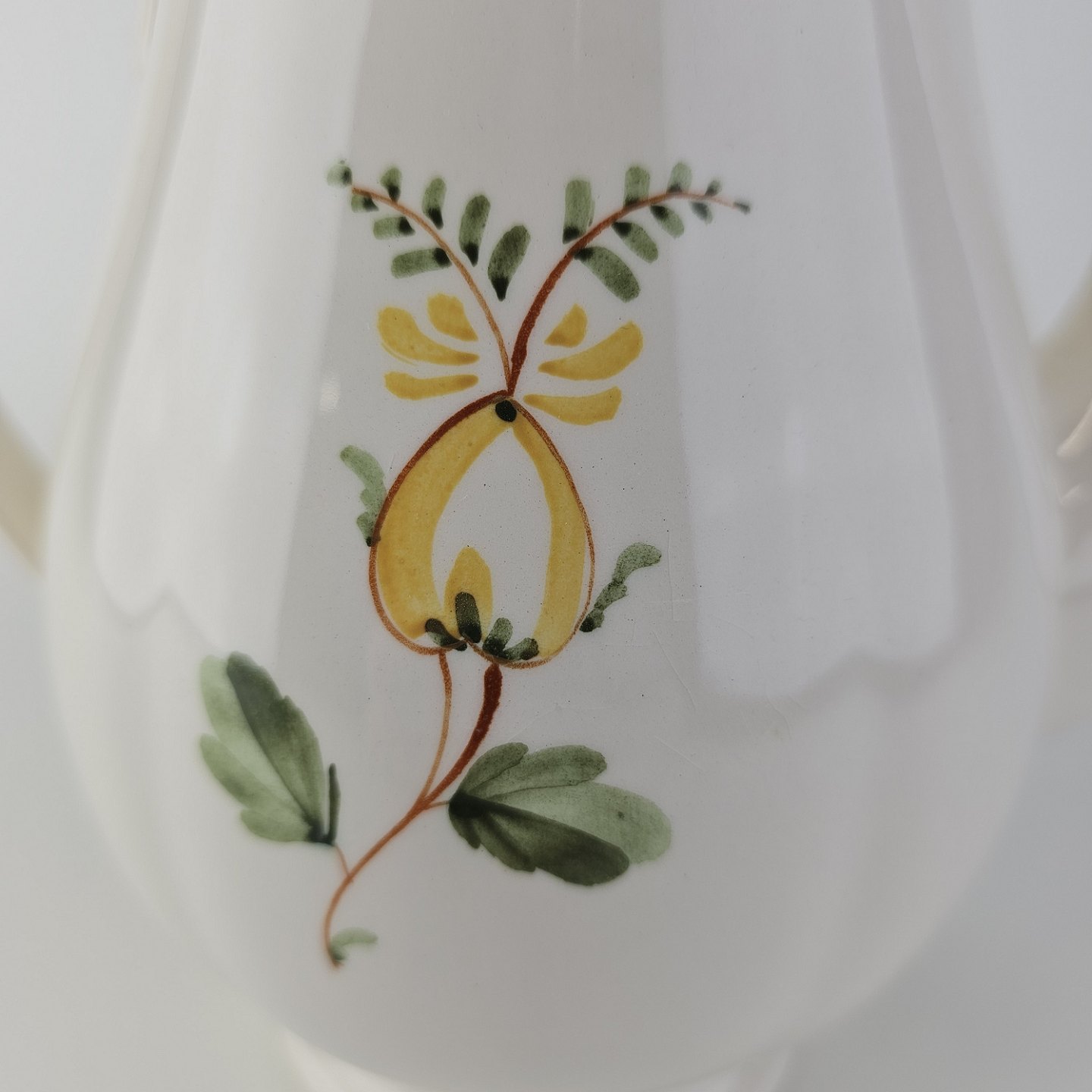 Hvidt fajancestel i stelform Feston/Alma med motiv af gule blomster og grønne blade.