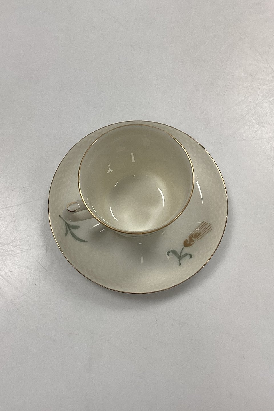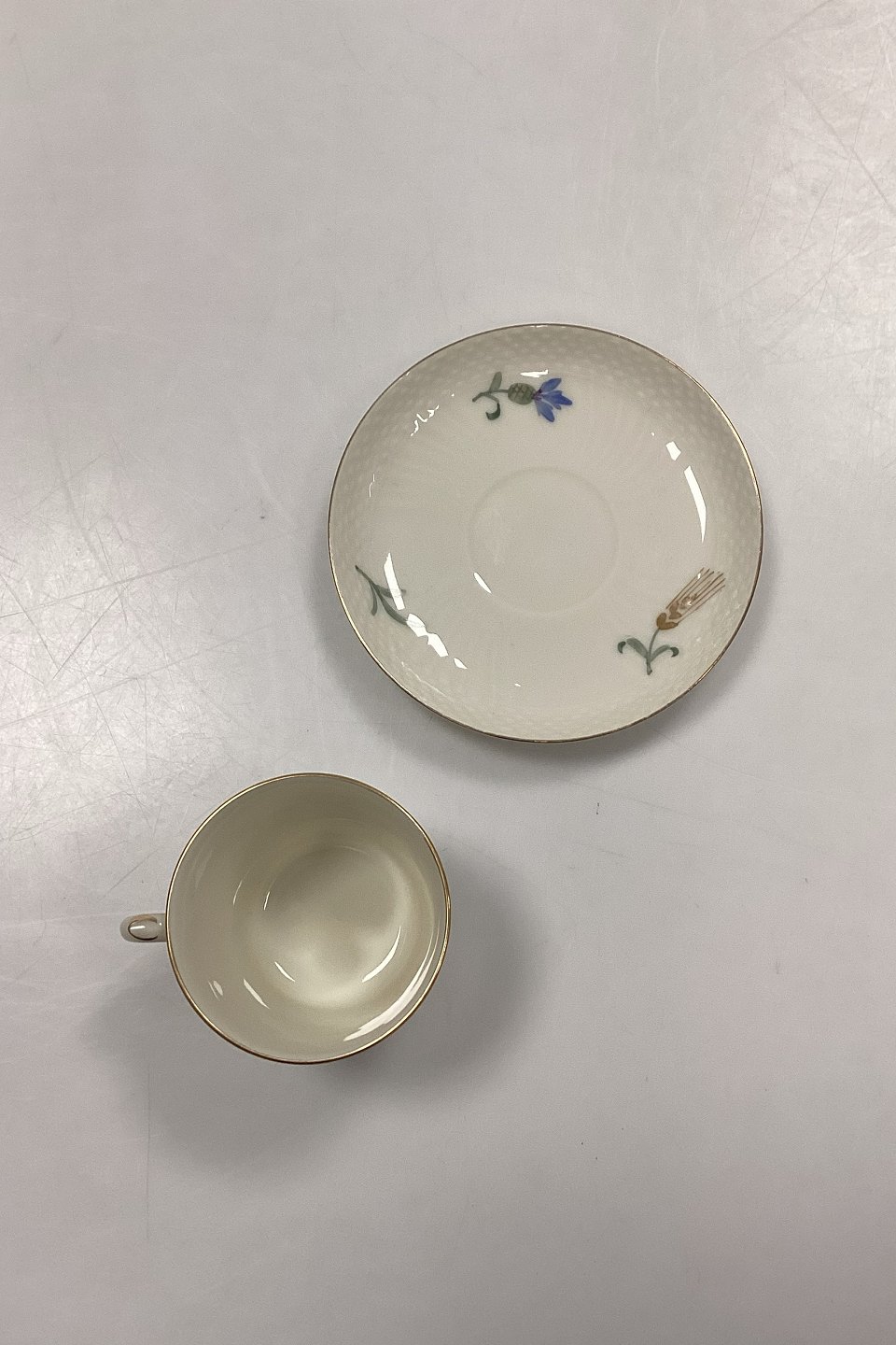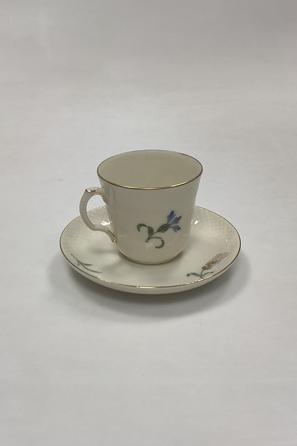 Royal Copenhagen Blå Kornblomst Mokkakop med Underkop No. 1546Cremefarvet stel med Blå kornblomstmotiver og Guldkant