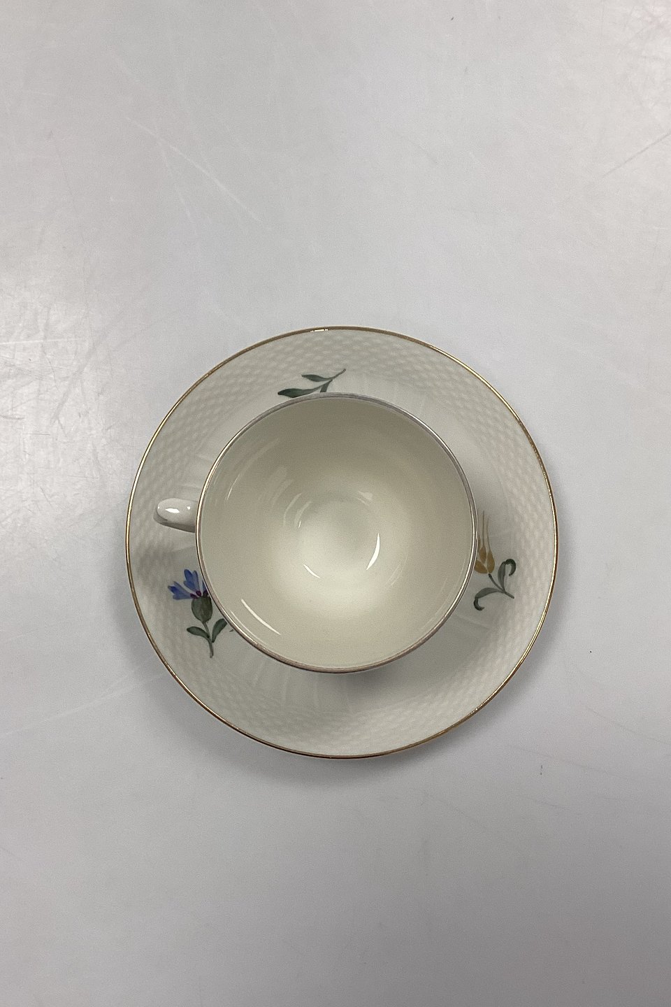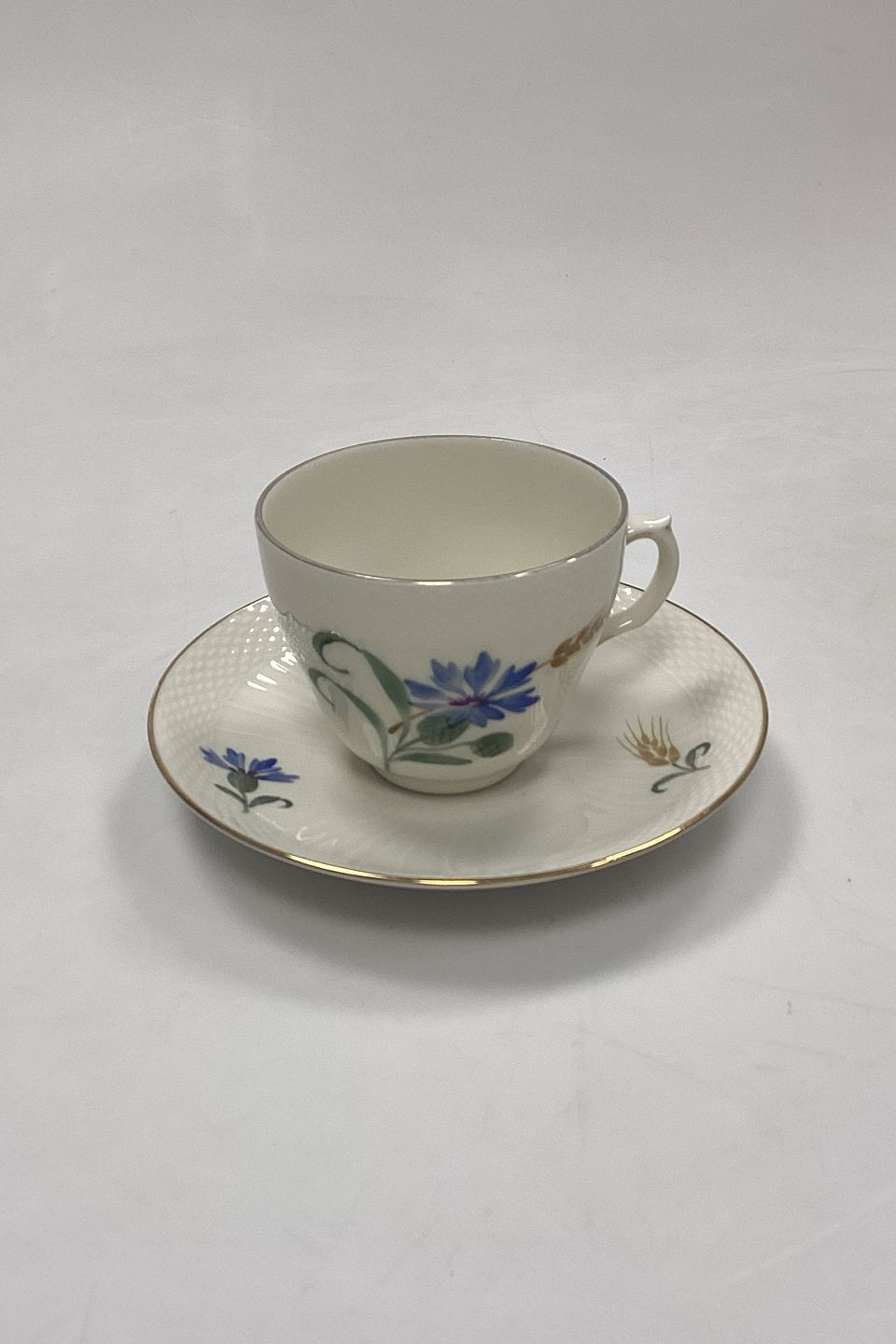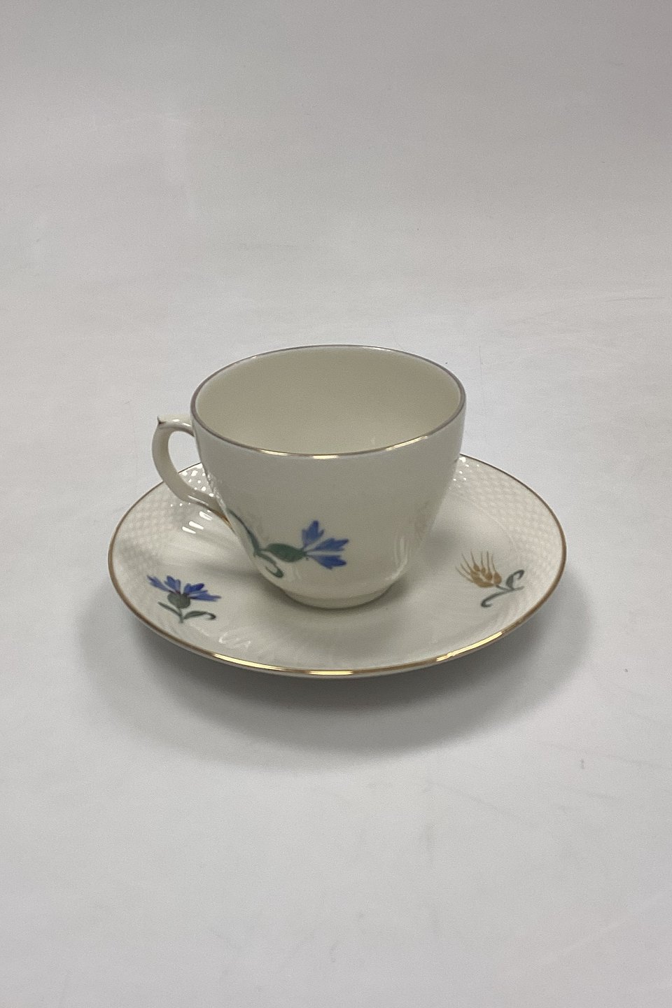 Royal Copenhagen Blå Kornblomst Kaffekop med Underkop No. 1870Cremefarvet stel med Blå kornblomstmotiver og Guldkant