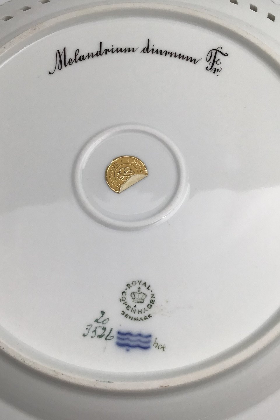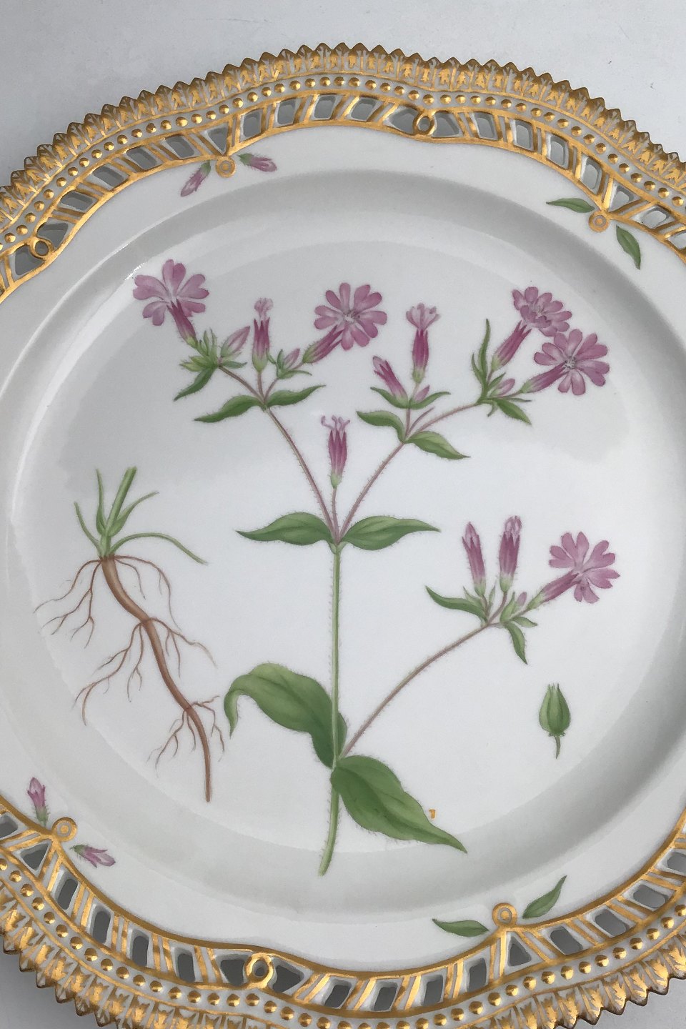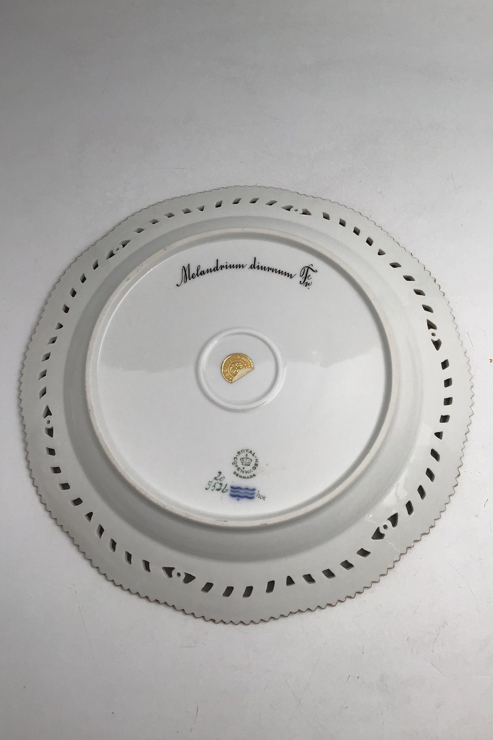 Royal Copenhagen Flora Danica Tallerken med gennembrudt kant No. 20/3526Måler 27cm / 10.63 inch. 1. Sort Latinsk tekst: Melandrium diurnum Fr.