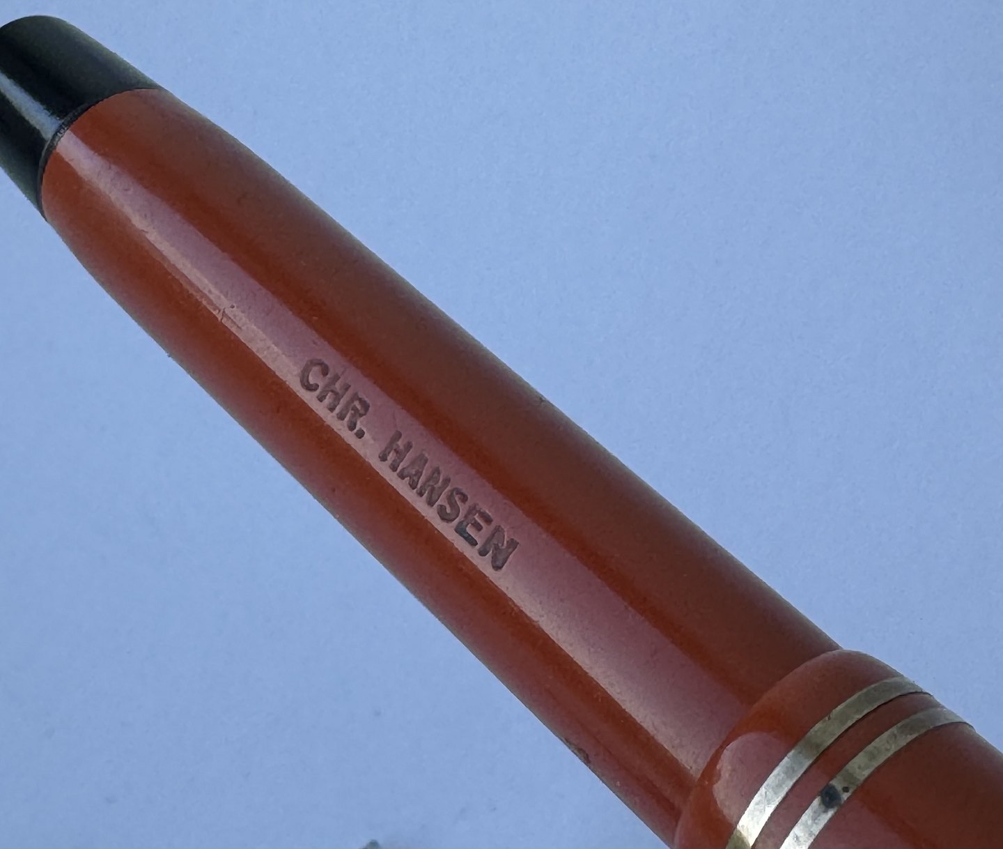 Stor koralrød Parker Duofold Lucky Curve fyldepen fra 1930'erne. Indgraveret personligt navn. Fremstillet i U.S.A. Fremstår I god stand uden skader eller reparationer. Push button blæk-påfylder. Der skal indsættes ny gummisæk før end den fungerer igen. Ny gummisæk kan indsættes for et tillæg på kr. 250,-