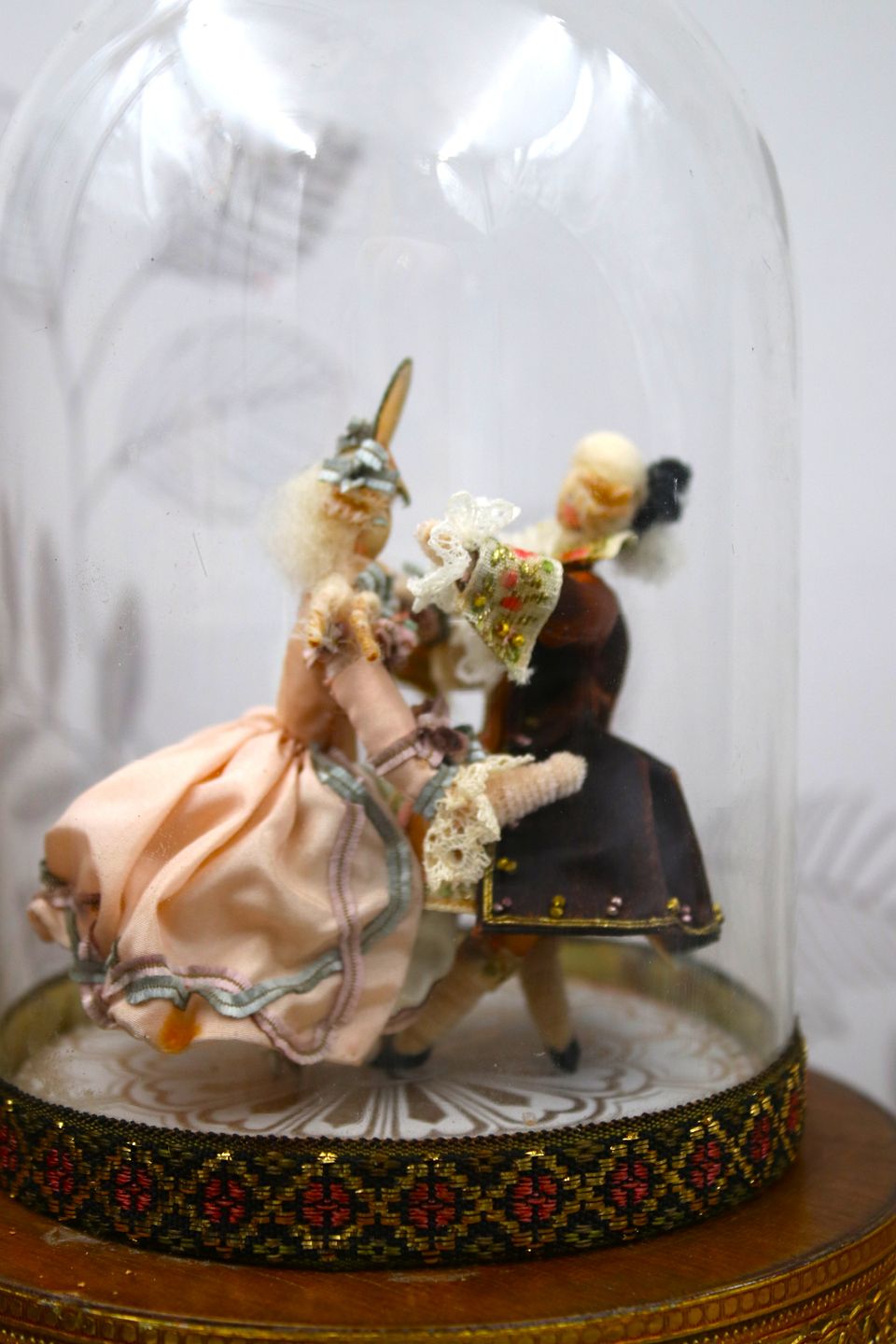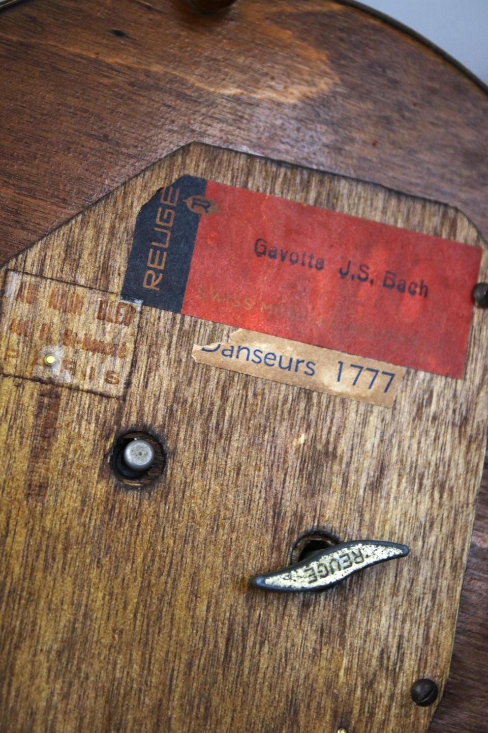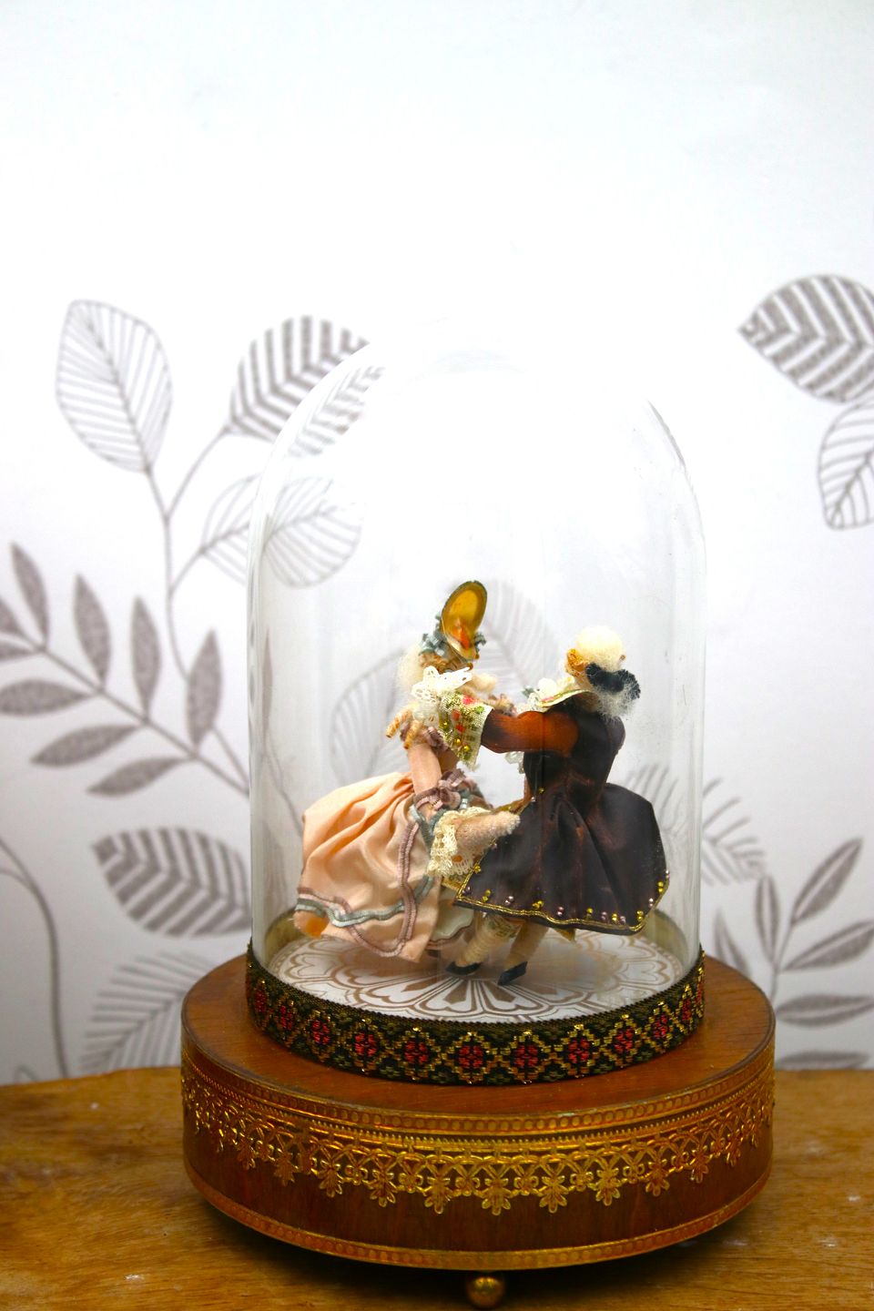 Gammel fransk mekanisk spilledåse med optræk af mærket Reuge, med et rokokopar der danser rundt og bevæger sig op og ned til et musikstykke af Bach under en glas globe.
