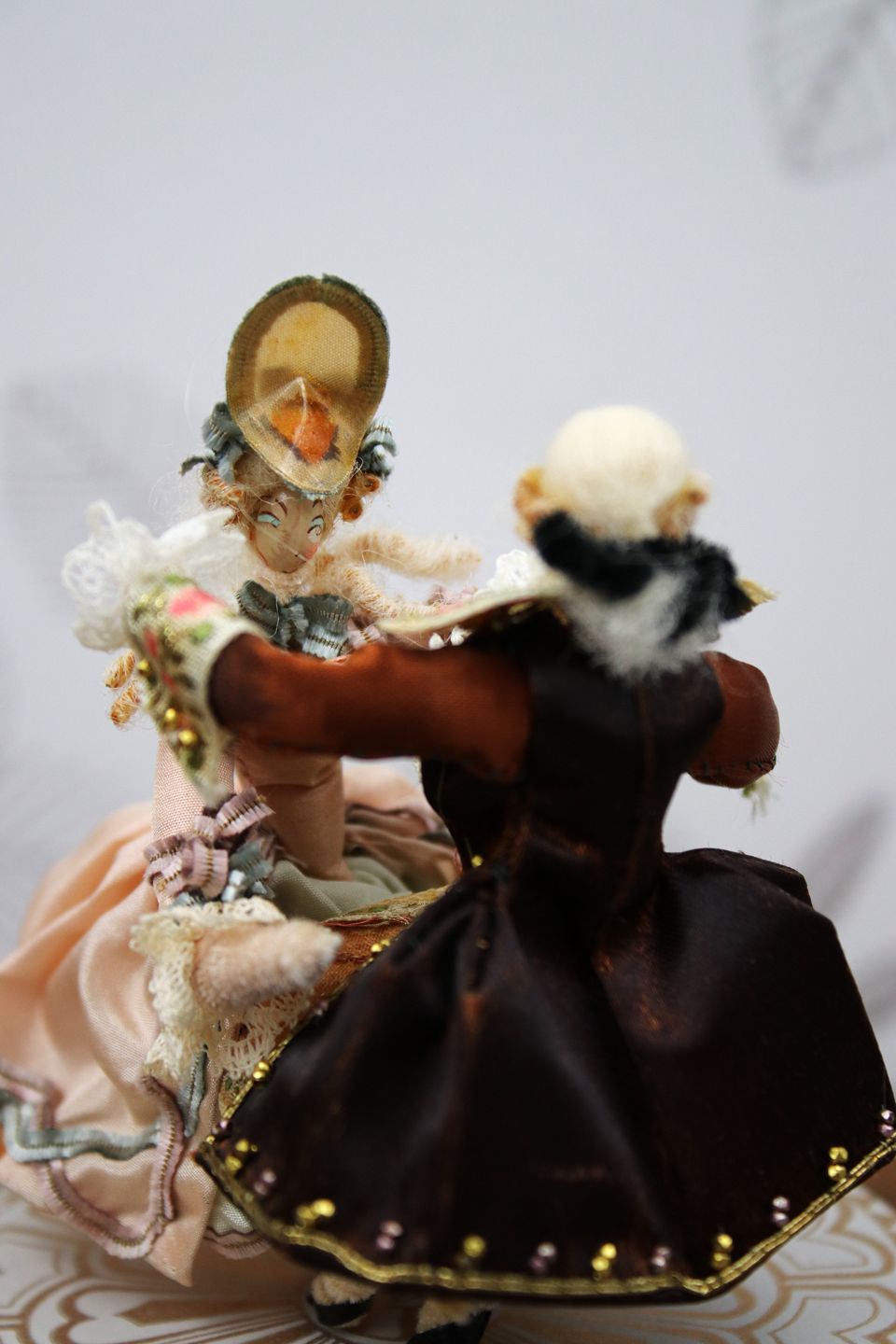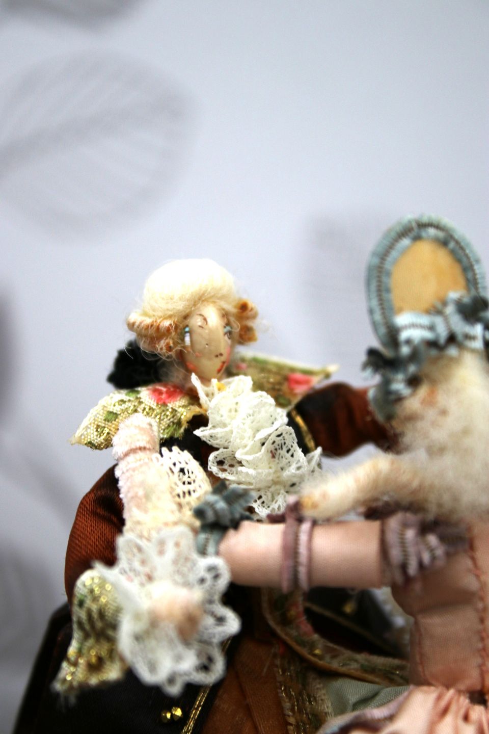 Dukkerne er håndlavet af Marthe Philippart, tøj lavet af silke, gaze, blonder, håret er lavet af fåreuld.