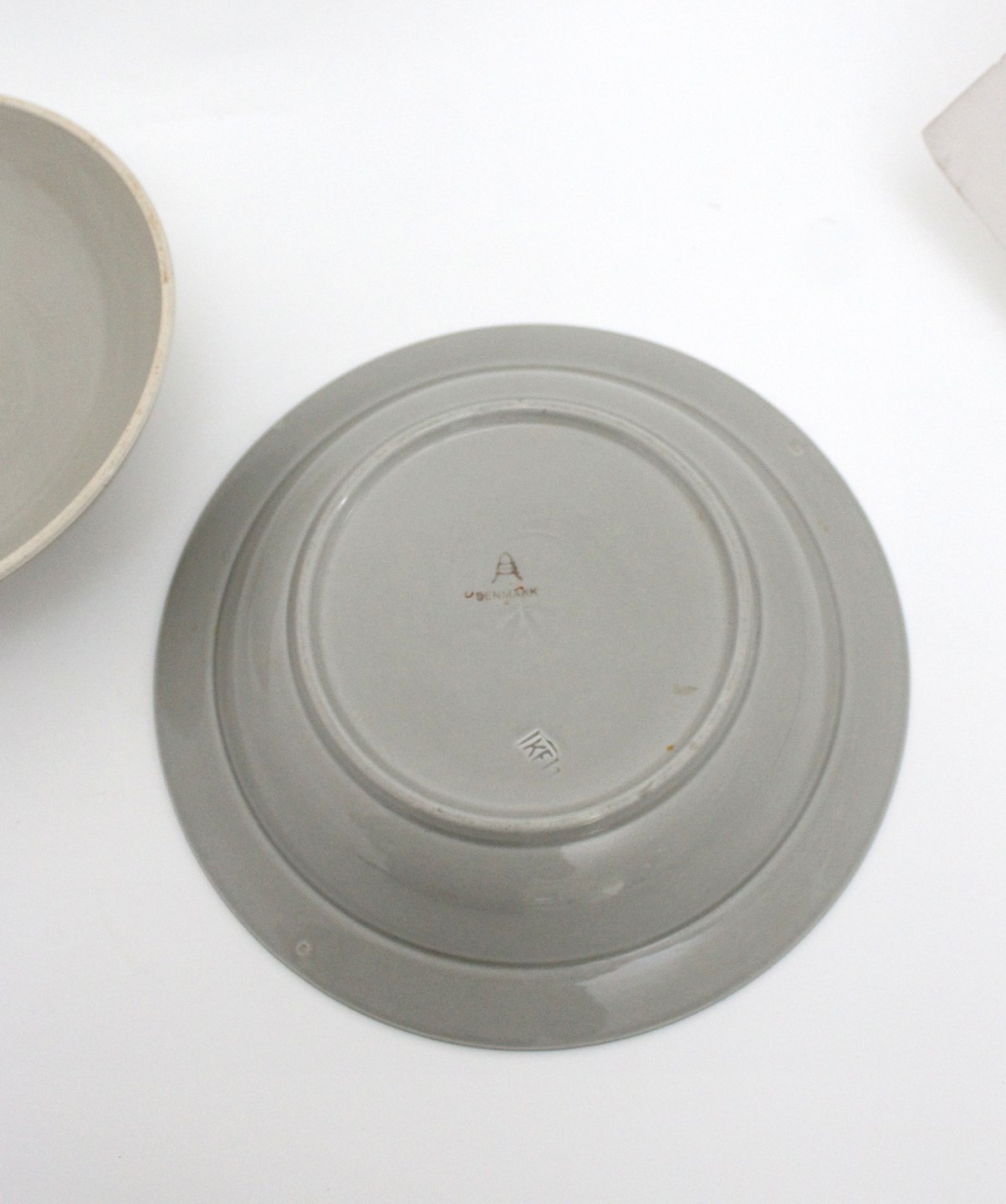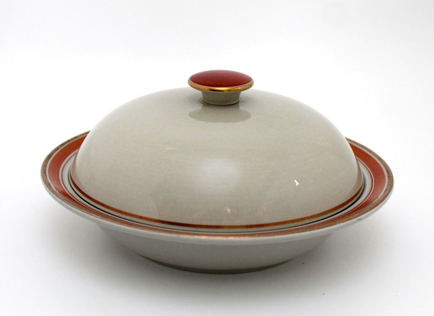 Aluminia, Tureby, grå fajance med orange fane samt guldkant. Designet af Nils Thorsson 1934-1968. Lågskål eller kompotskål, sjælden. Diameter 21 cm. Højde uden låg 4 cm. Med låg 11 cm. Fin stand. Pris: 350 kr. stk. Lager: 1