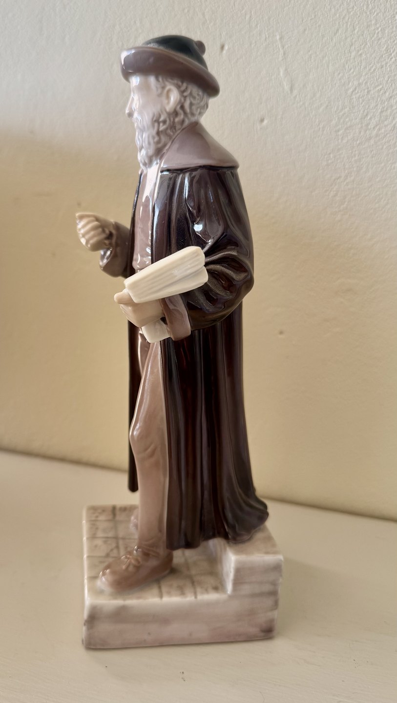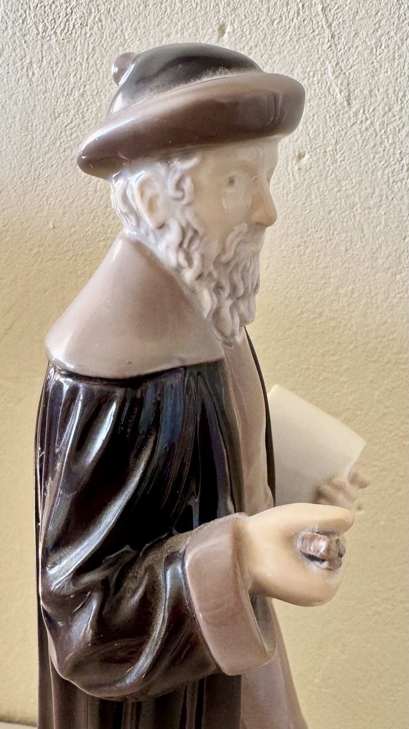 Figur i porcelæn fra Bing og Grøndahl. Forestillende Johann Gutenberg (1397-1468), der opfandt bogtrykkerkunsten, eller forenklet sagt, maskinen der kunne masseproducere tryksager og bøger. Derfor denne figur, der er fremstillet i et mindre oplag på 50 stk. til Dansk Typograf-Forbund. Figuren er brugt som hædersgave fra forbundet.