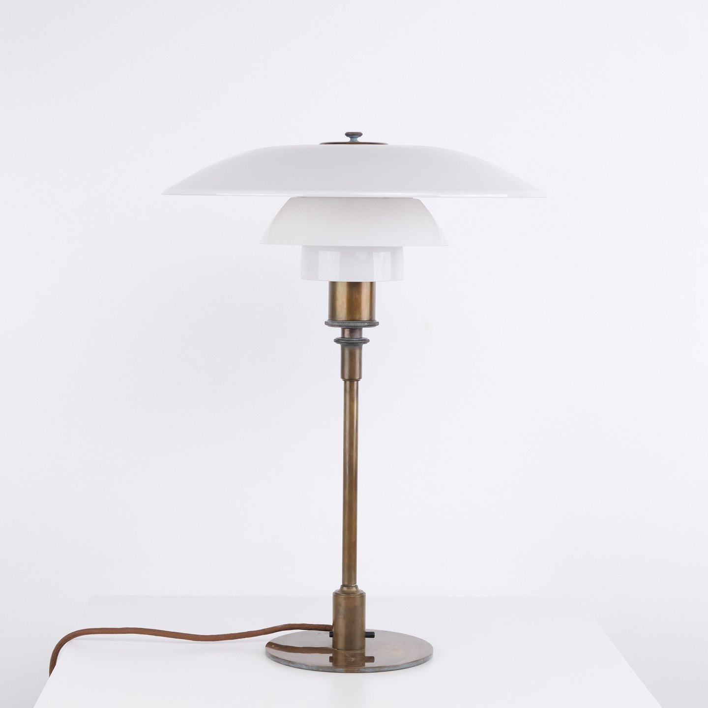 PH 4/3 Tischlampe, entworfen von Poul Henningsen und hergestellt von Louis Poulsen in den 1930er Jahren. Die Lampe ist aus brüniertem Messing gefertigt und mit Schirmen aus weißem Opalglas ausgestattet, die ein angenehmes und diffuses Licht erzeugen.— Herkunft: Dänemark