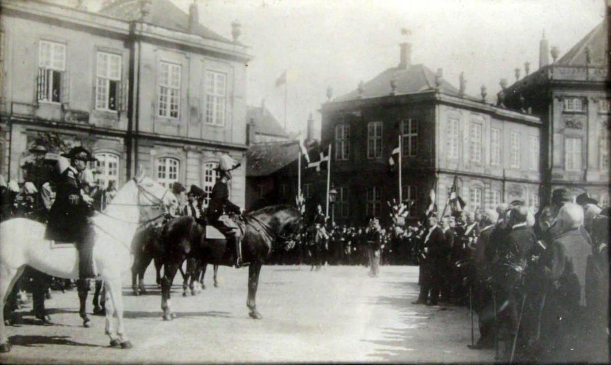 Foto vom Schloss Amalienborg, Kopenhagen. Die Veteranen aus dem Ersten Weltkrieg im Jahr 1914 auf Amalinborg Platz. Unter anderem sieht mann König Christian X, Prinz Valdemar und Peter Andreas Heiberg Jürgensen. 14 x 22 cm.Bestellnummer: 5984