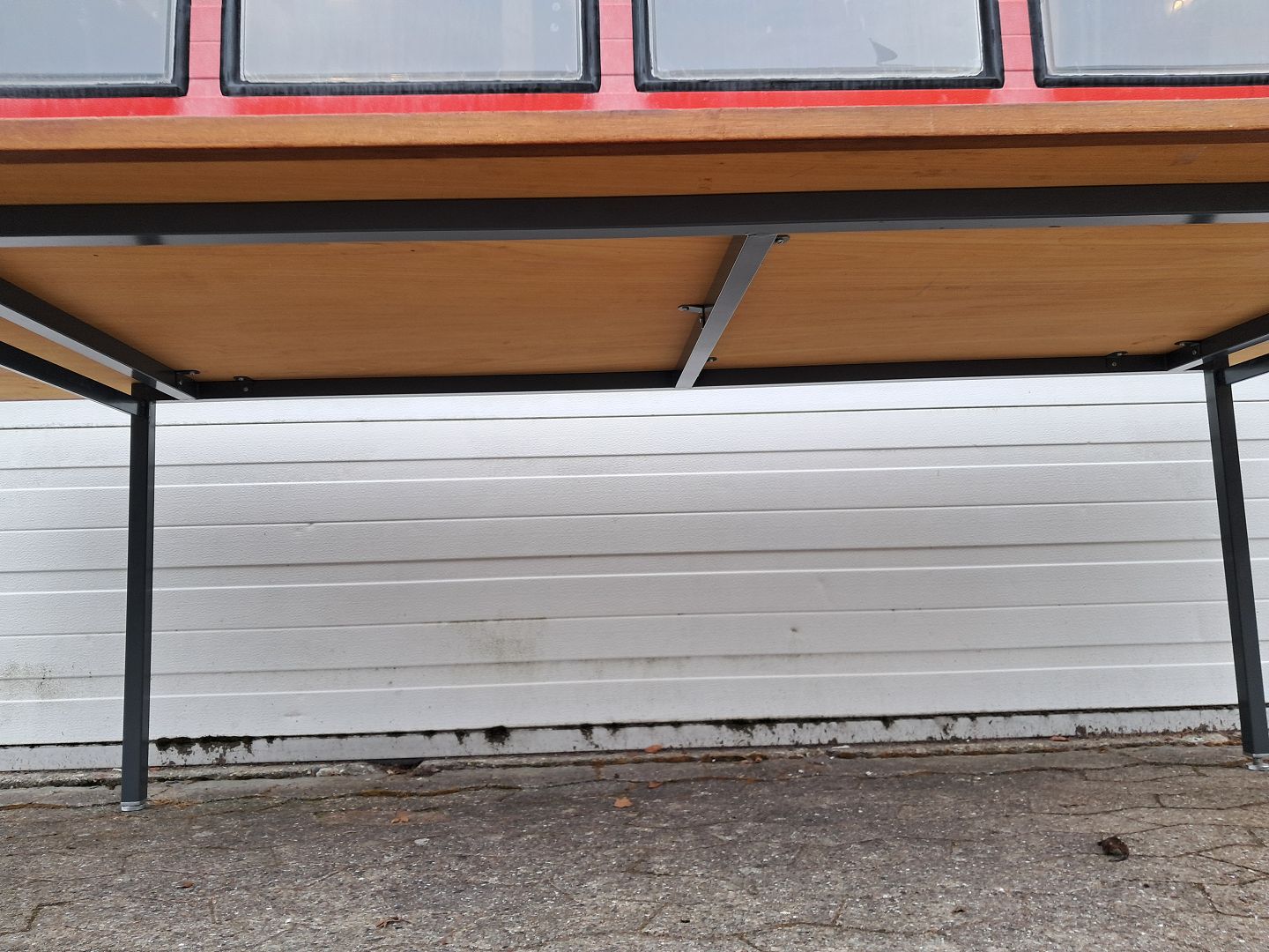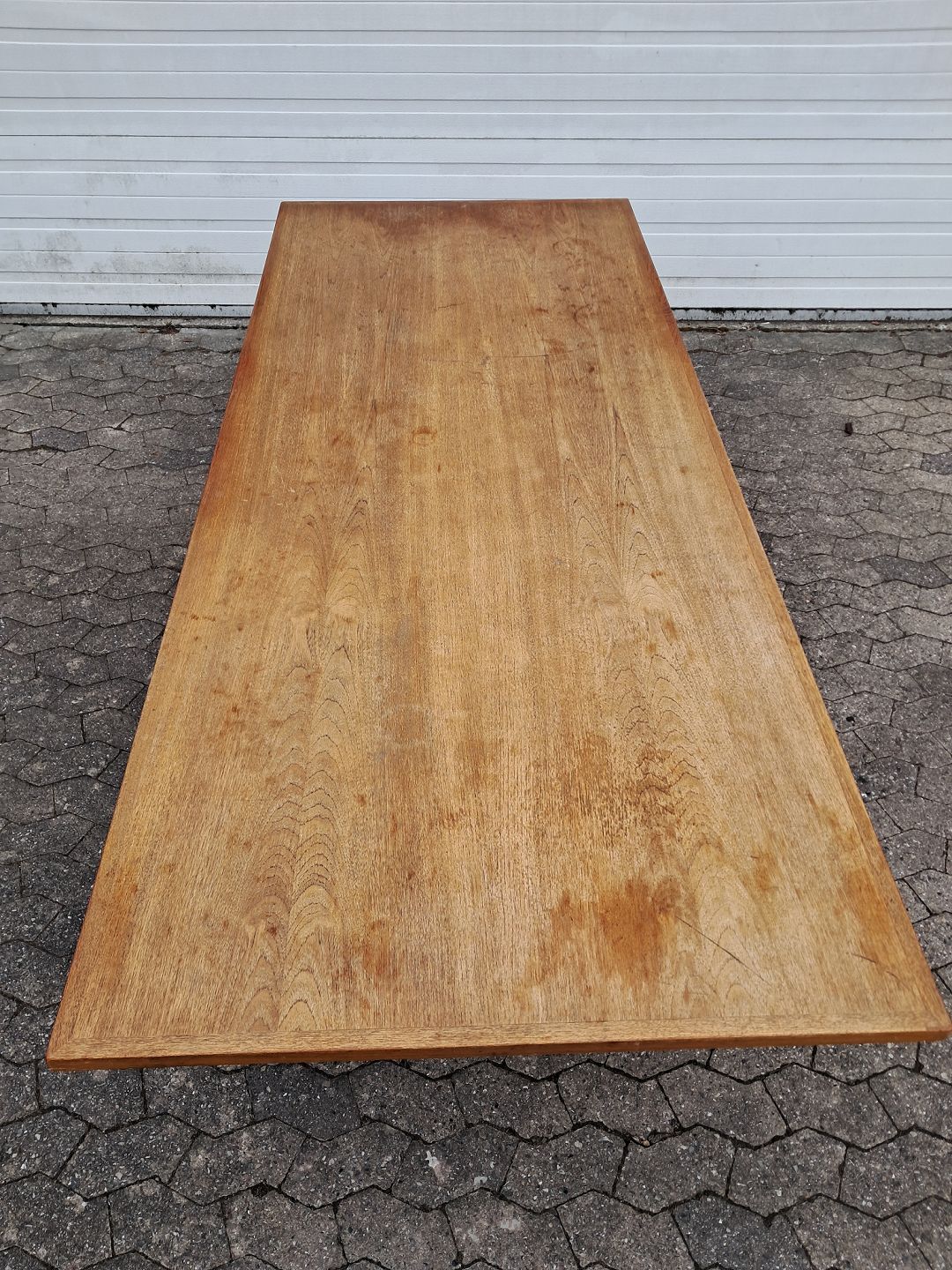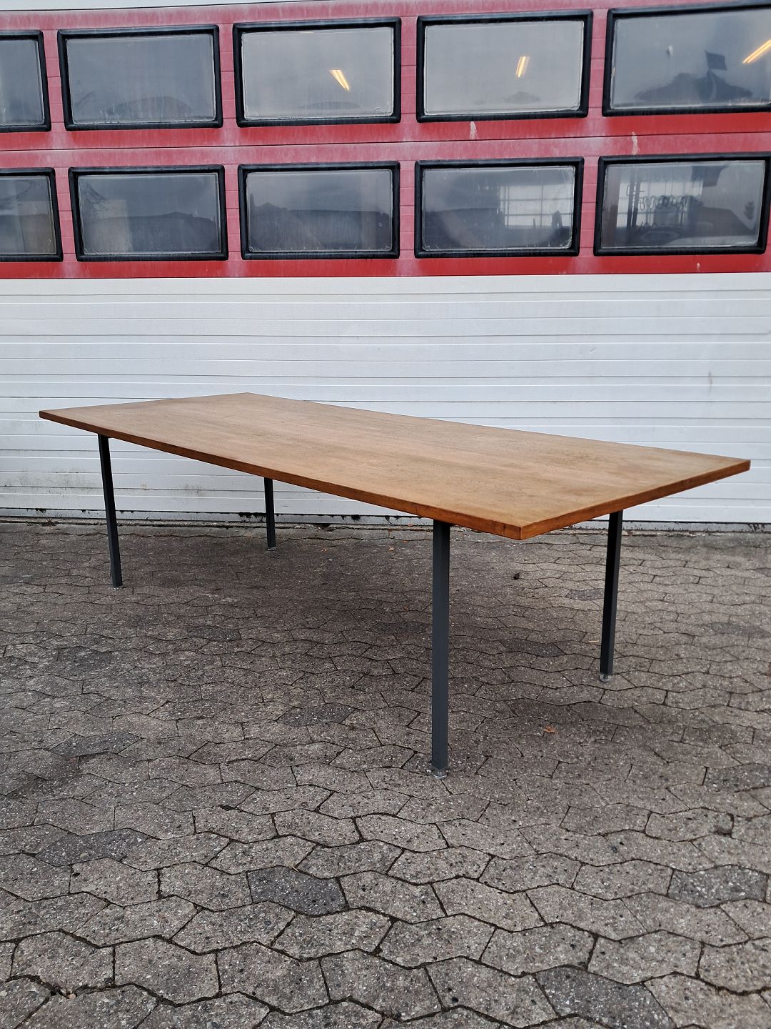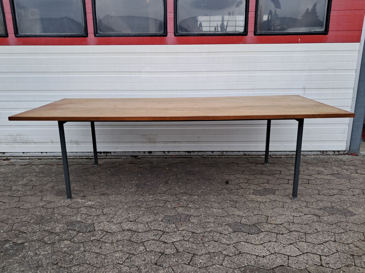 Konferencebord i fineret teaktræ med metal understel, fra 1970erne.Det har brugsspor.