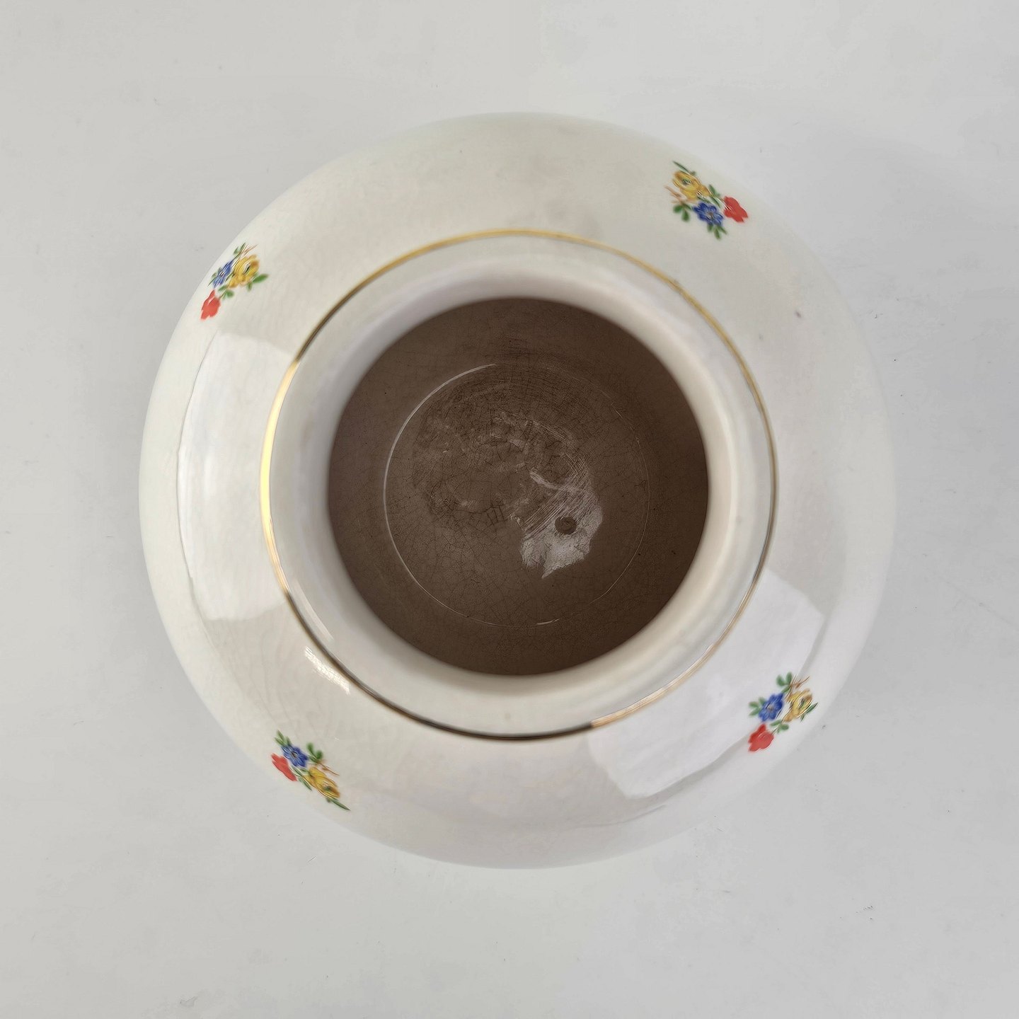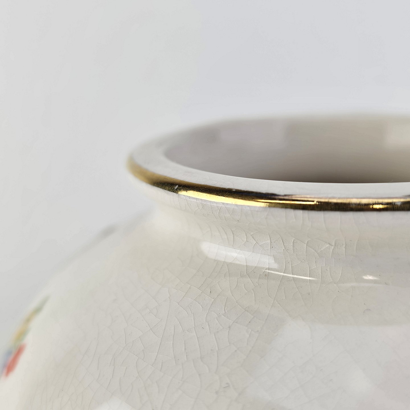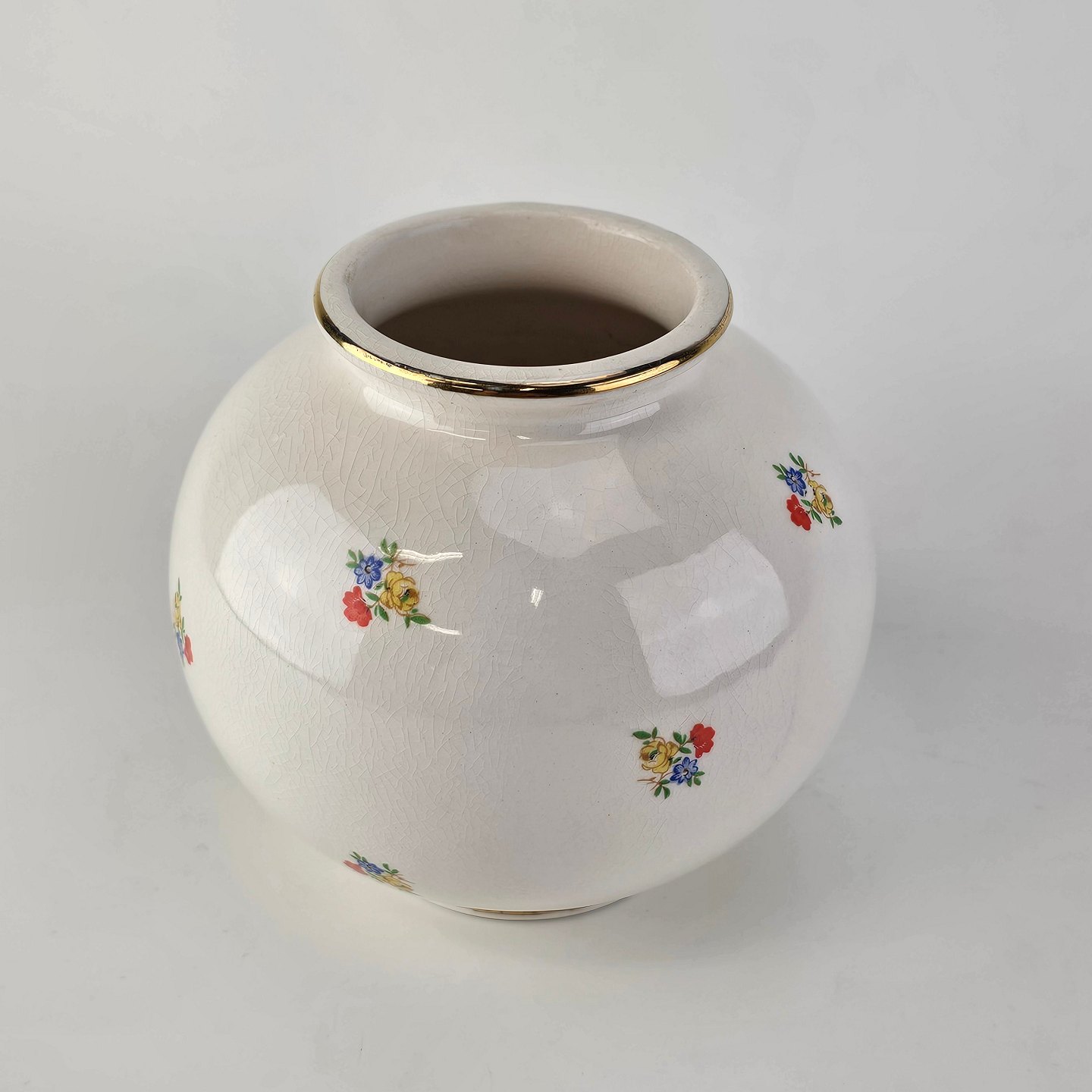 Rund vase i hvid fajance med blomsterdekoration og guldkant