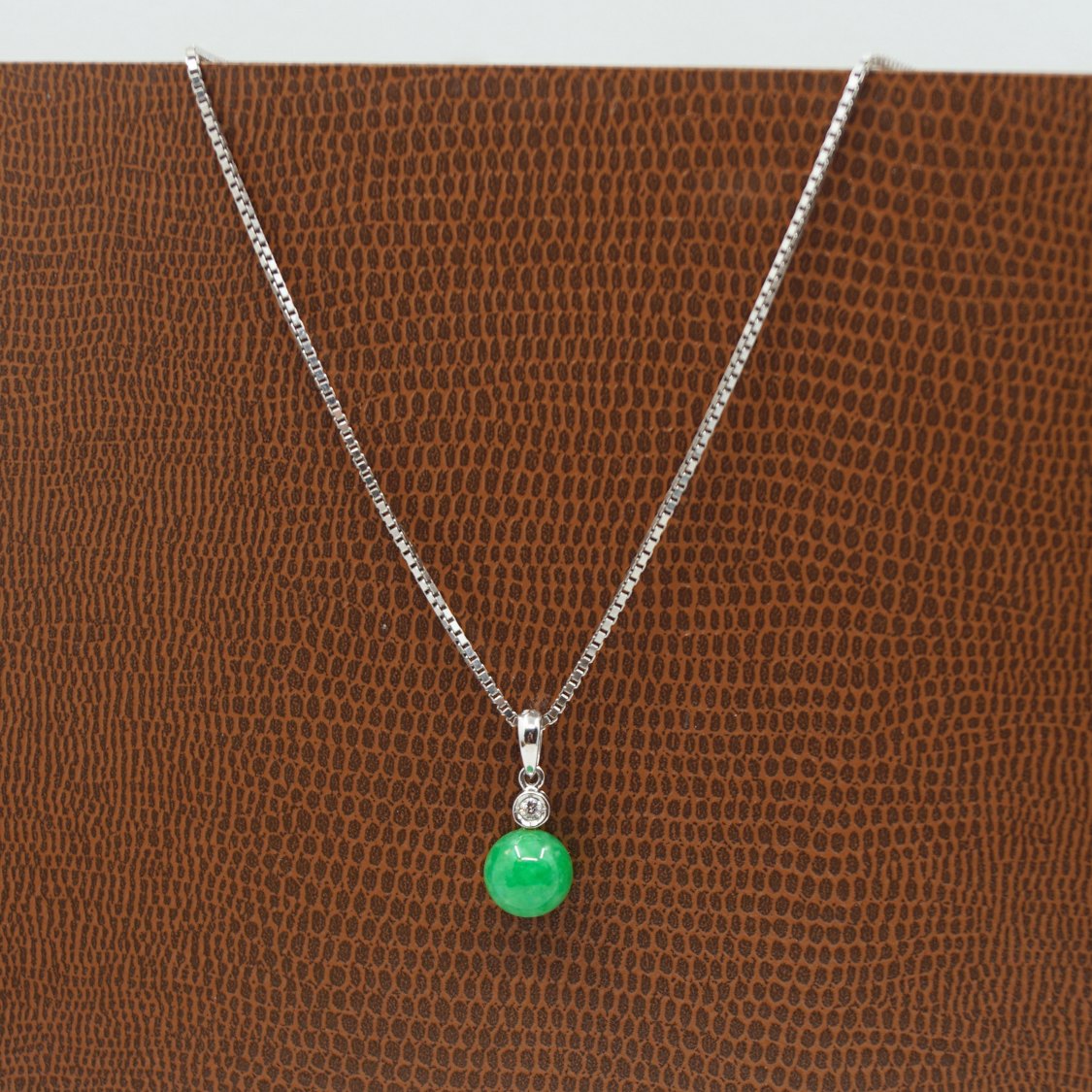 Hvidguldshalskæde af 14 kt. hvidguld med vedhæng i 18 kt. hvidguld prydet med jadeit og diamant, 0.07 ct.Kæde l. 50 cm.