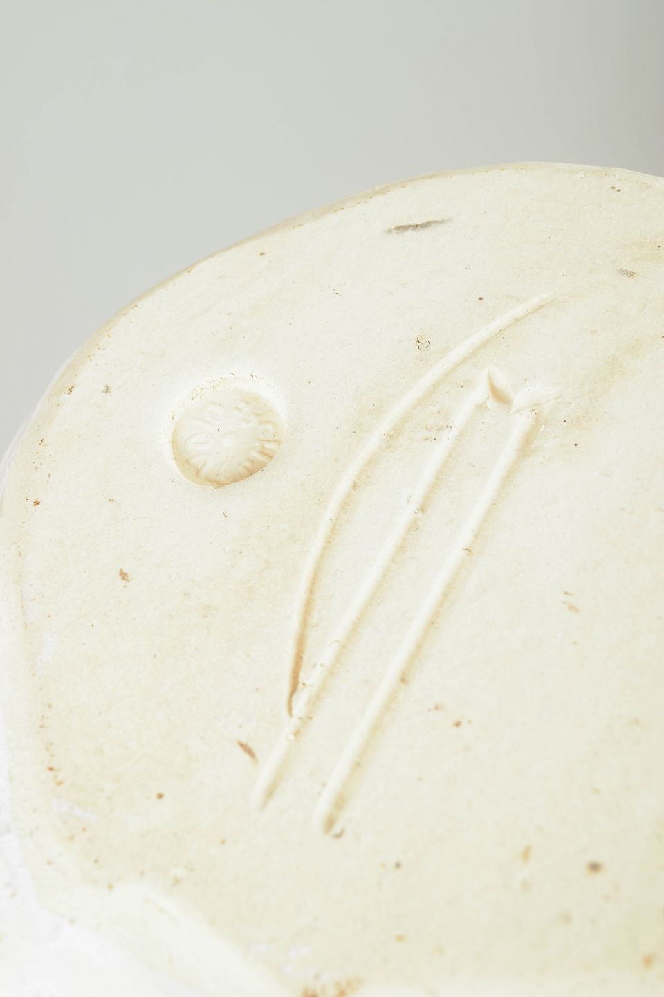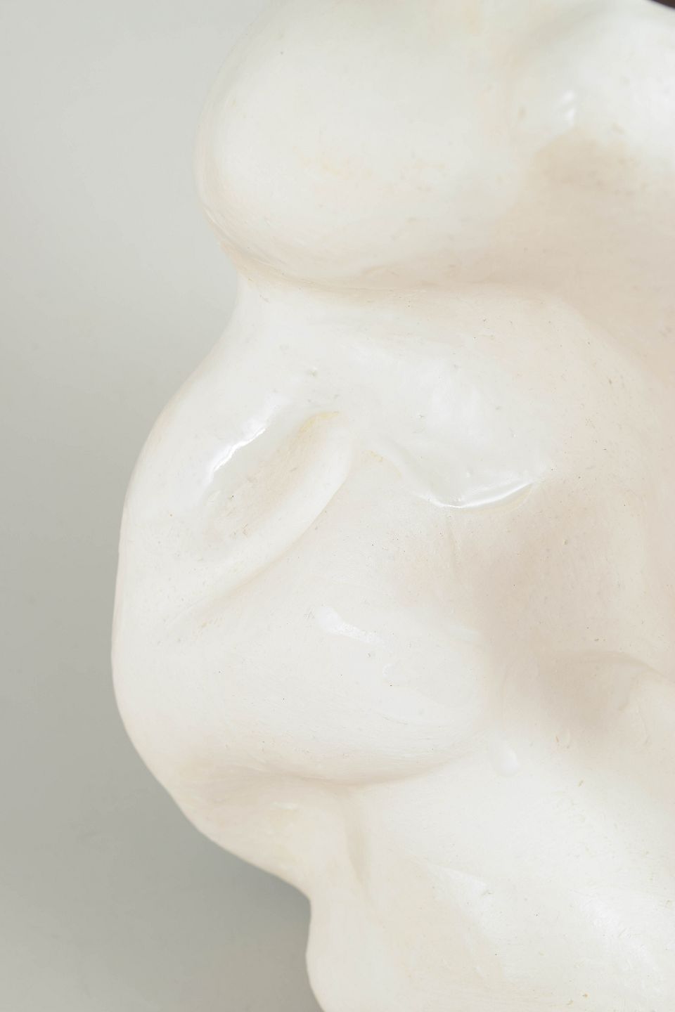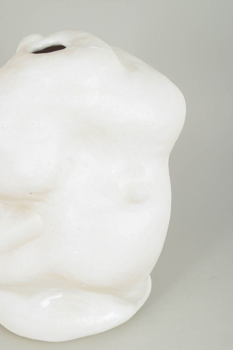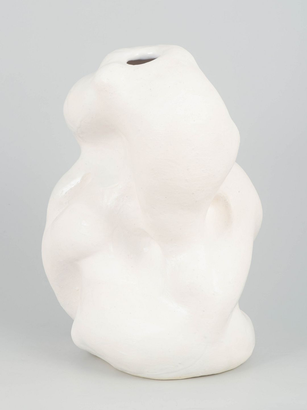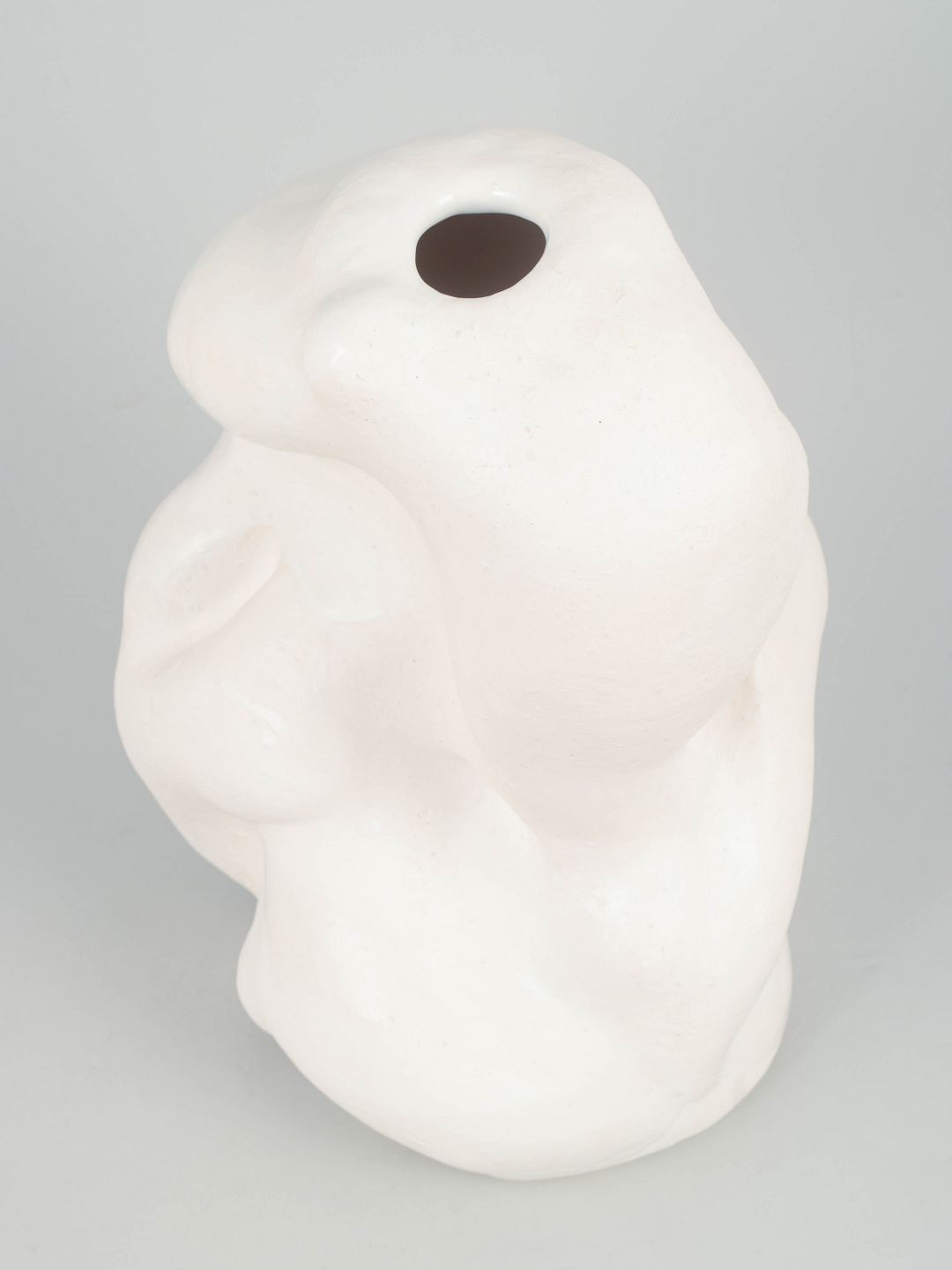 Christina Muff, dansk samtidskeramiker (f. 1971). Unika stentøjsvase, organisk formet. Værket er dækket af et tyndt lag mat hvid porcelæn og pletvist penselglaseret med hvid, blank glasur.