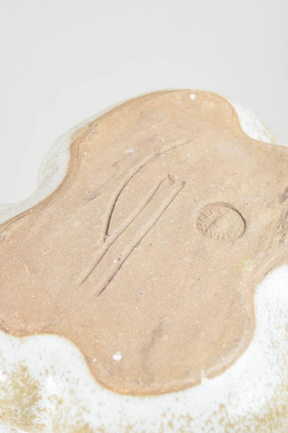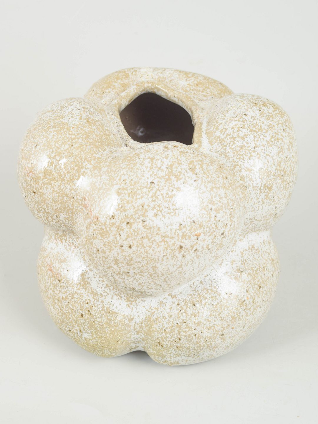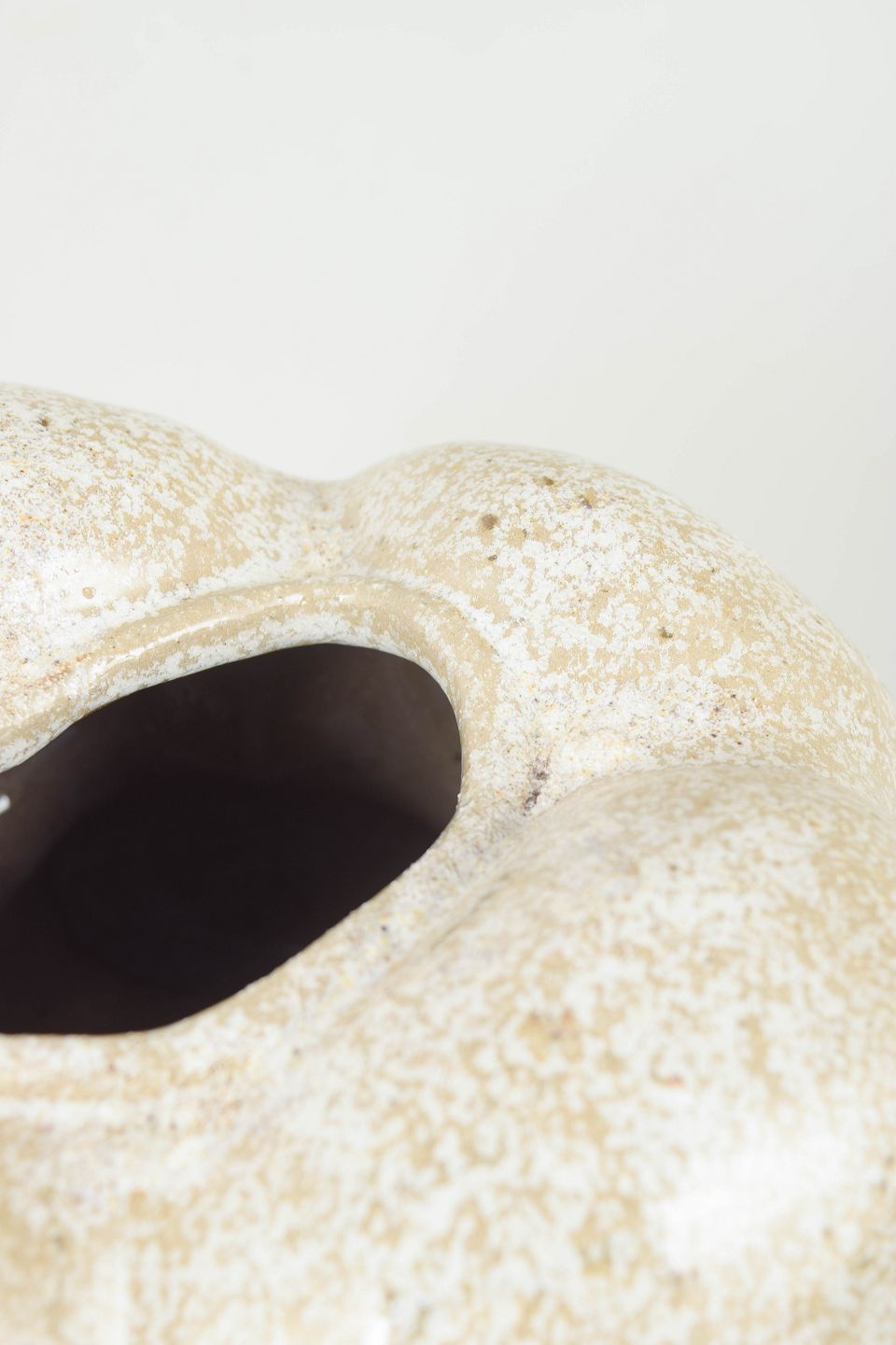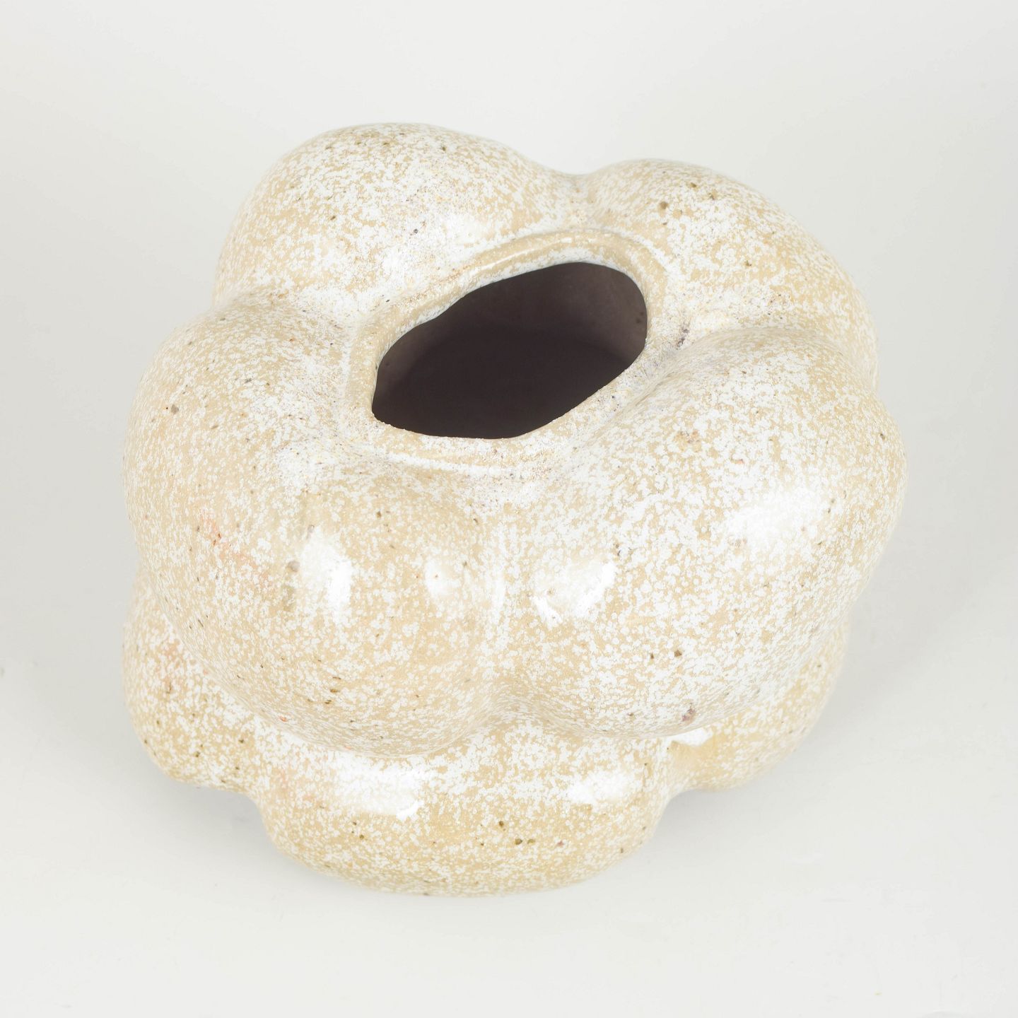 Christina Muff, dansk samtidskeramiker (f. 1971). Unika stentøjsskulptur, organisk formet. Glasuren der dækker vasen er snowflake glasur, en glasur der er klar med bittesmå hvide krystaller der minder om snefnug.