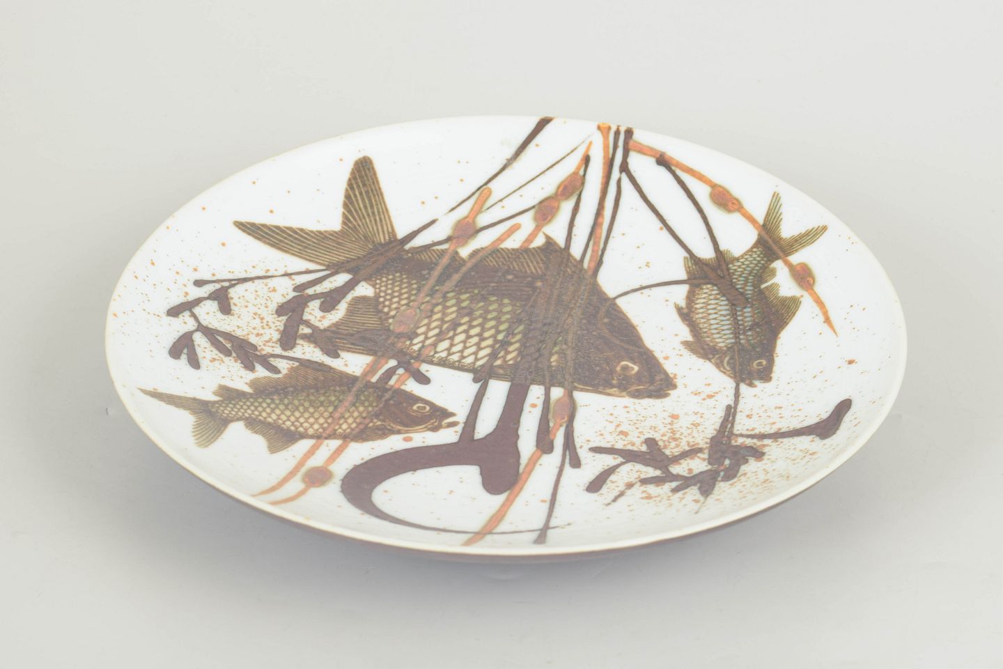 Cirkulært porcelænsfad med detaljeret dekoration af fisk og undervandsmotiver i brune og gyldne nuancer på hvid bund. Model 1078/5404, fra 1965, første sortering.