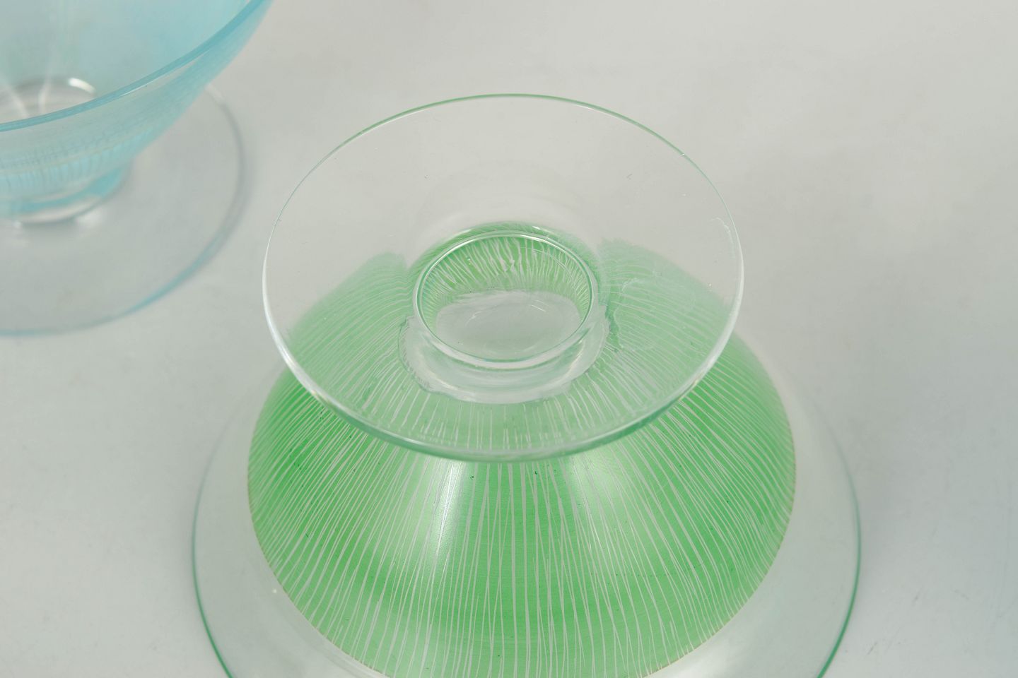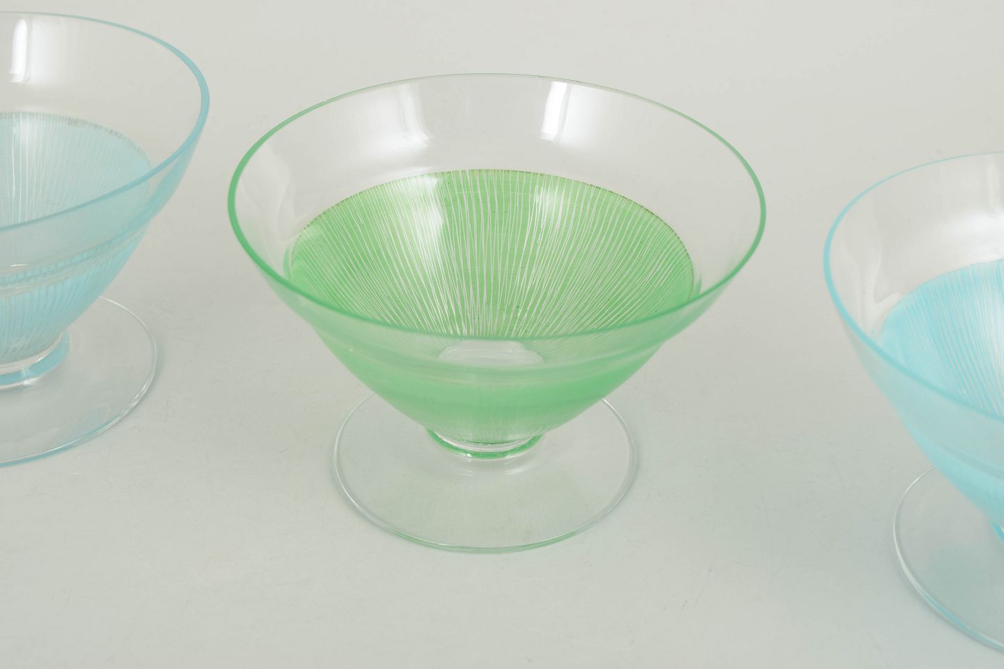 Kosta Boda, sæt af tre cocktailglas/dessertskåle.Elegante glas i klart glas med fine indfarvede ribbede strukturer i blå og grønne nuancer. Lette og dekorative former fra 1960’erne, velegnede som både cocktailglas og dessertskåle.