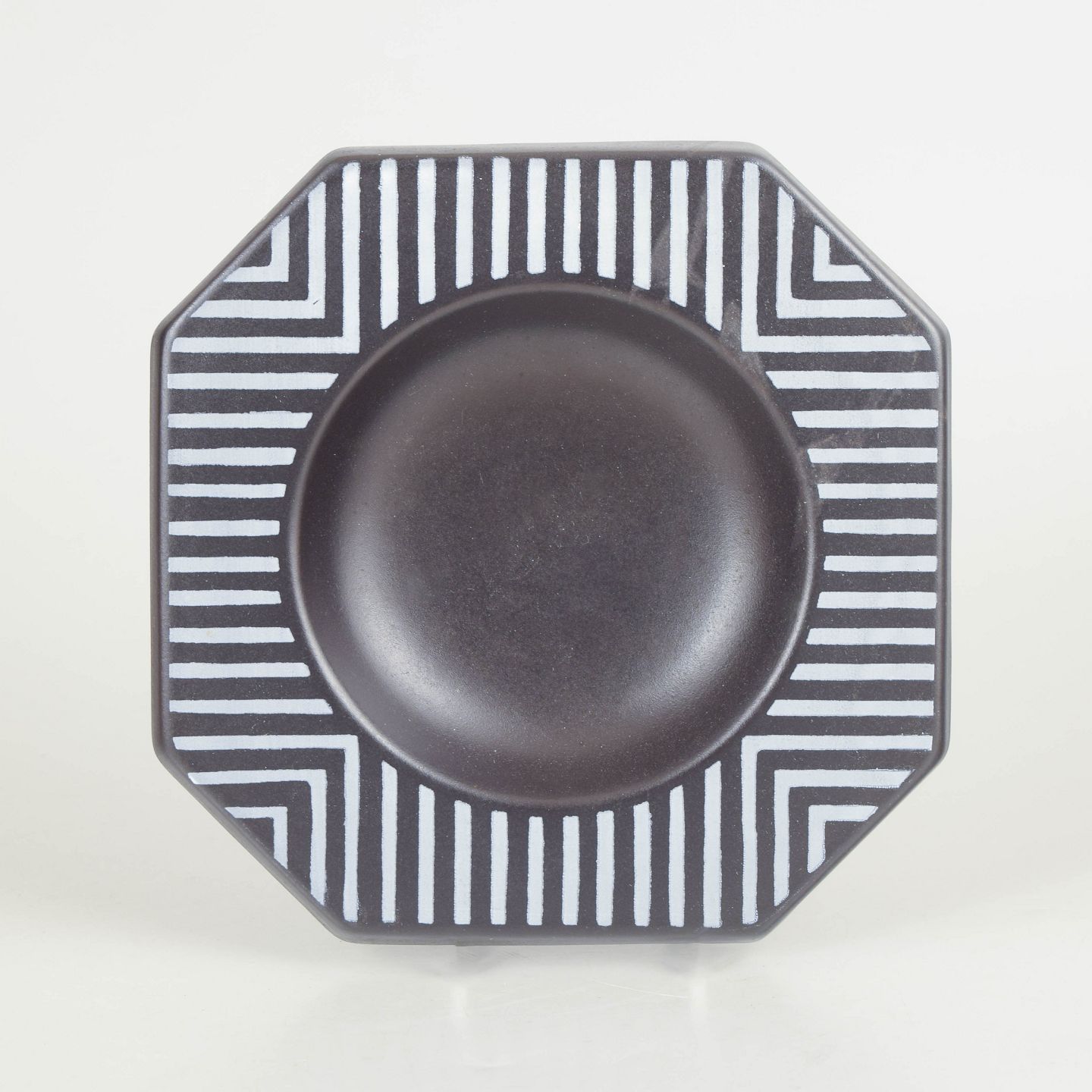Mari Simmulson for Upsala Ekeby, fad.Dekorativt ottekantet fad i stentøj med grafisk dekoration i sort og hvid med stribede felter og geometrisk mønster. Model 4254.