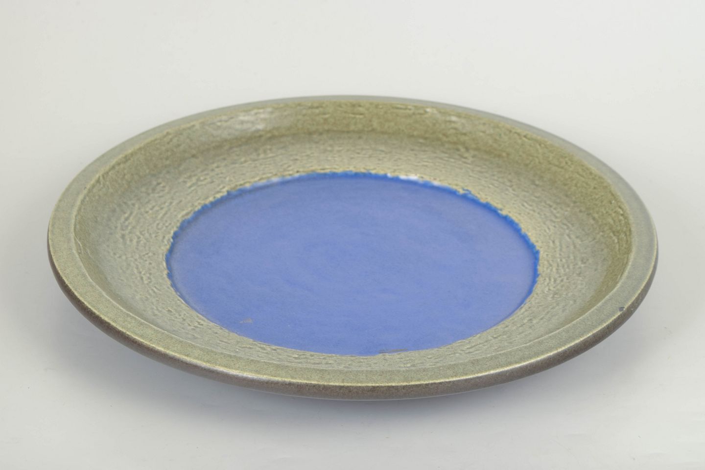 Mari Simmulson for Upsala Ekeby, stort fad.Stort dekorativt fad i stentøj med bred rand i grøn glasur og centralt felt i klar blå tone. Let struktureret overflade med karakteristisk farvekontrast. Model 6001M.
