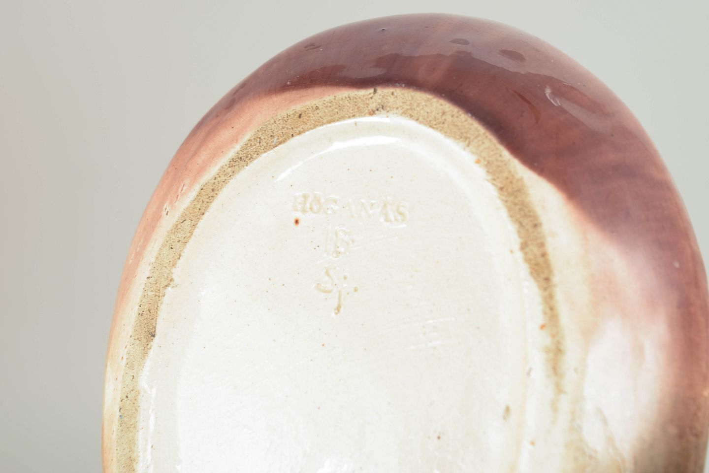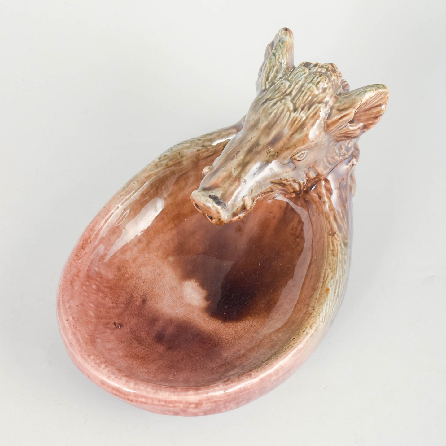 Höganäs, skål med vildsvin.Skål i stentøj udformet som et vildsvinehoved med naturalistiske detaljer og glaseret i varme brunlige og rosa nuancer. Dekorativ og funktionel genstand med karakteristisk tidlig 1900-tals formsprog.