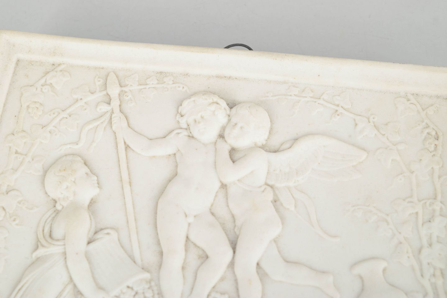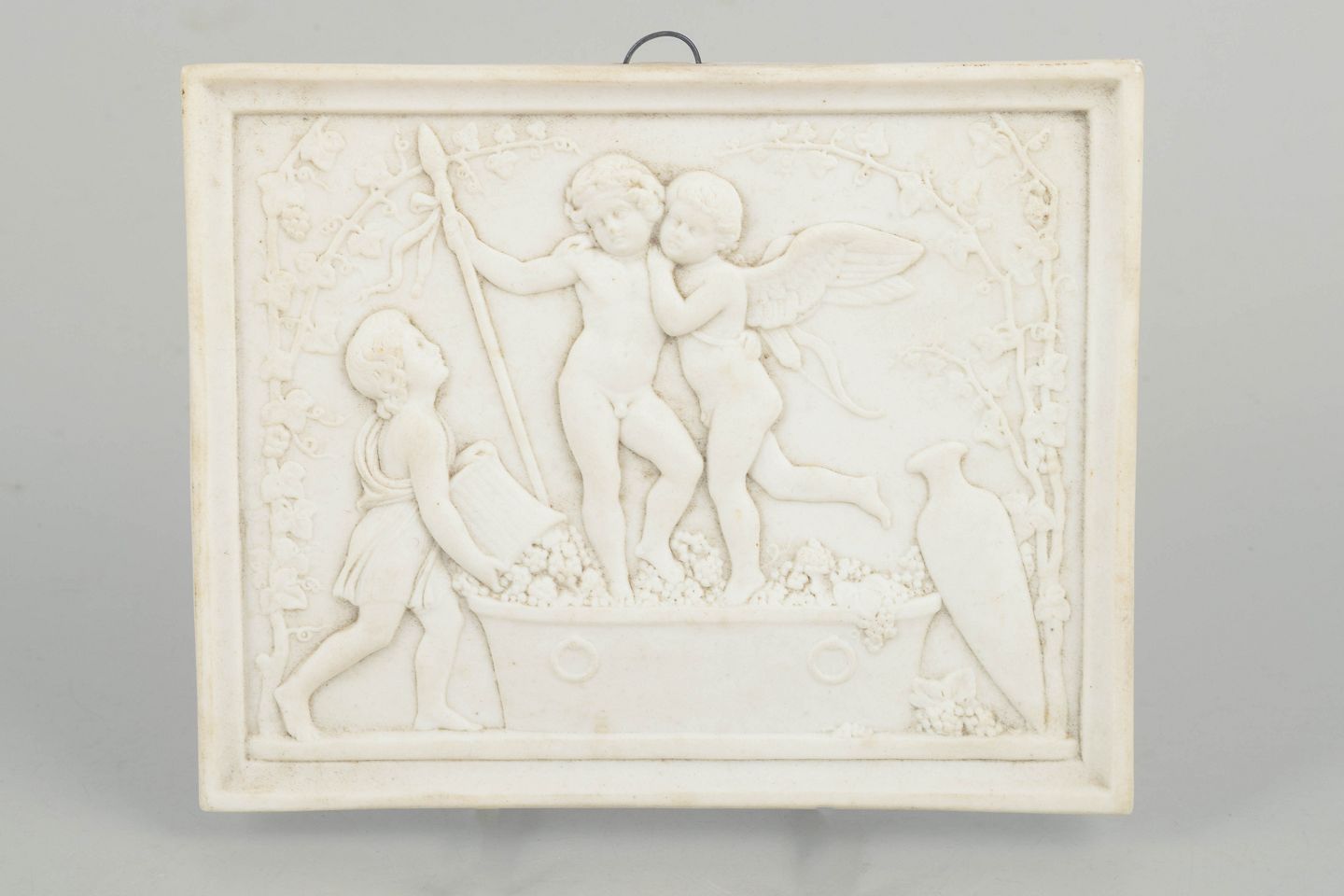 Bing & Grøndahl bisquit relief efter Thorvaldsen, vægrelief.Rektangulært vægrelief i hvidt bisquitporcelæn med klassicistisk motiv af putti i figurkomposition efter Bertel Thorvaldsen, udført med fine detaljer og blød modellering i nyklassicistisk stil.