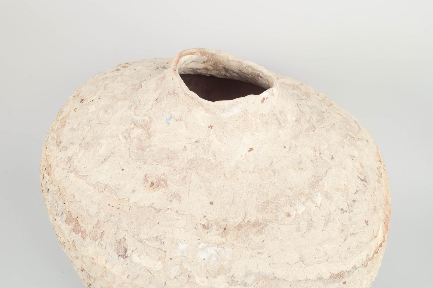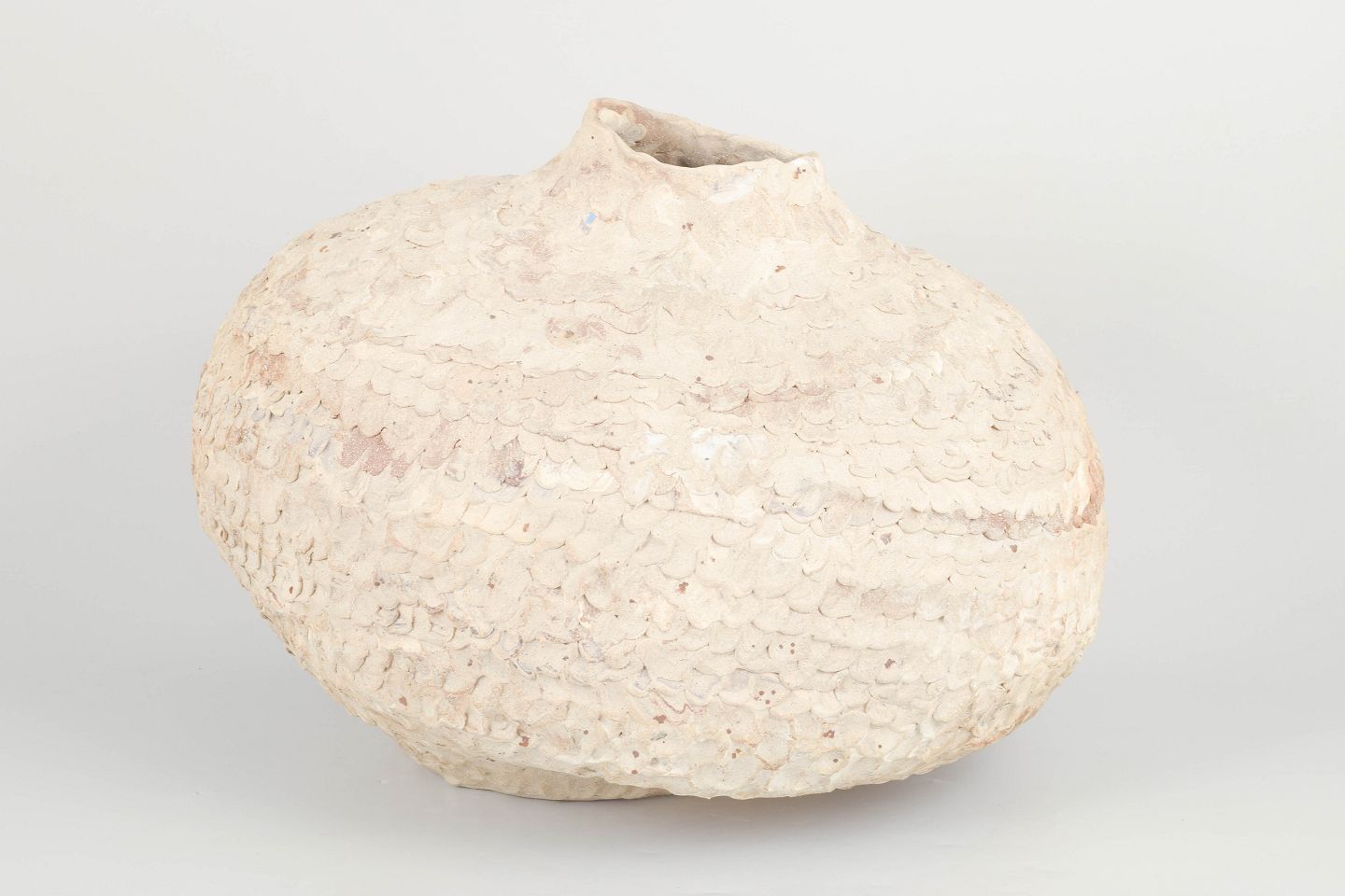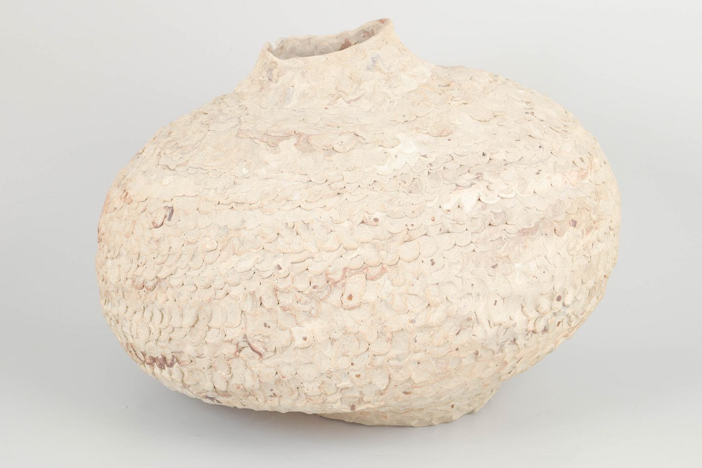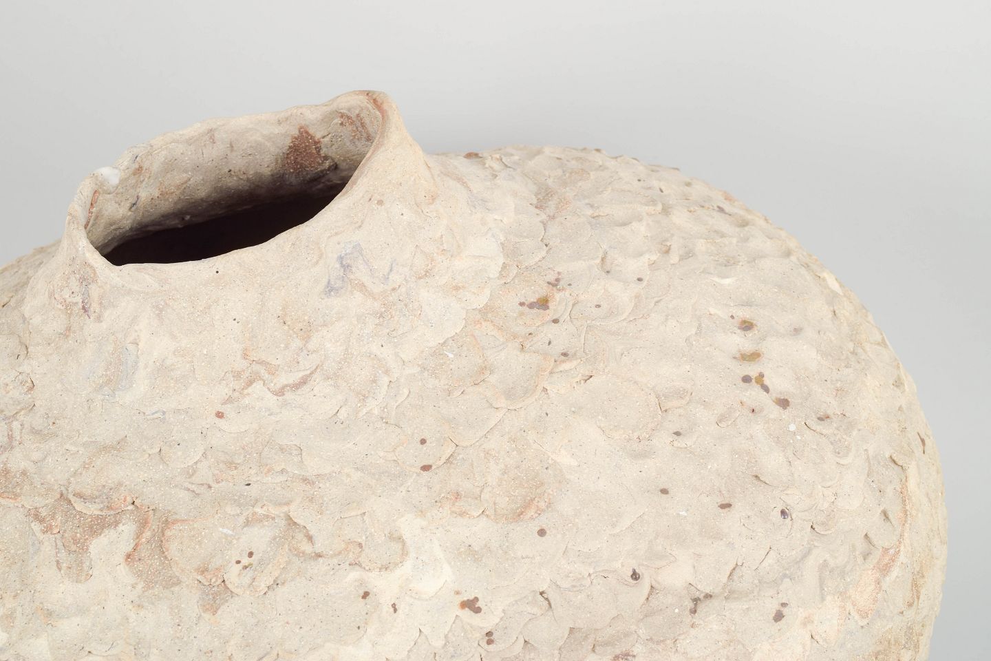 Christina Muff, dansk samtidskeramiker (f. 1971). Stor unika rund stentøjsvase. Værket er uglaseret i kunstnerens signaturstil med blandede lertyper. Leret er genbrugsler, der er sammensat med tusindvis af kunstnerens tryk med fingrene, dette giver værket et taktilt, organisk og blødt udtryk. Kan ikke holde væske.