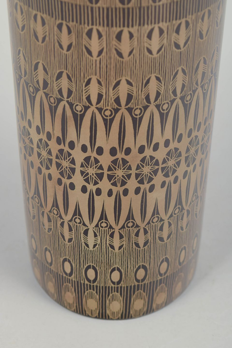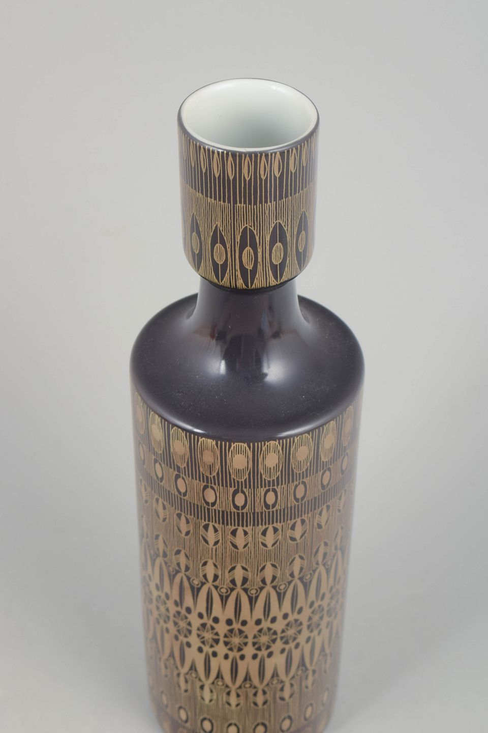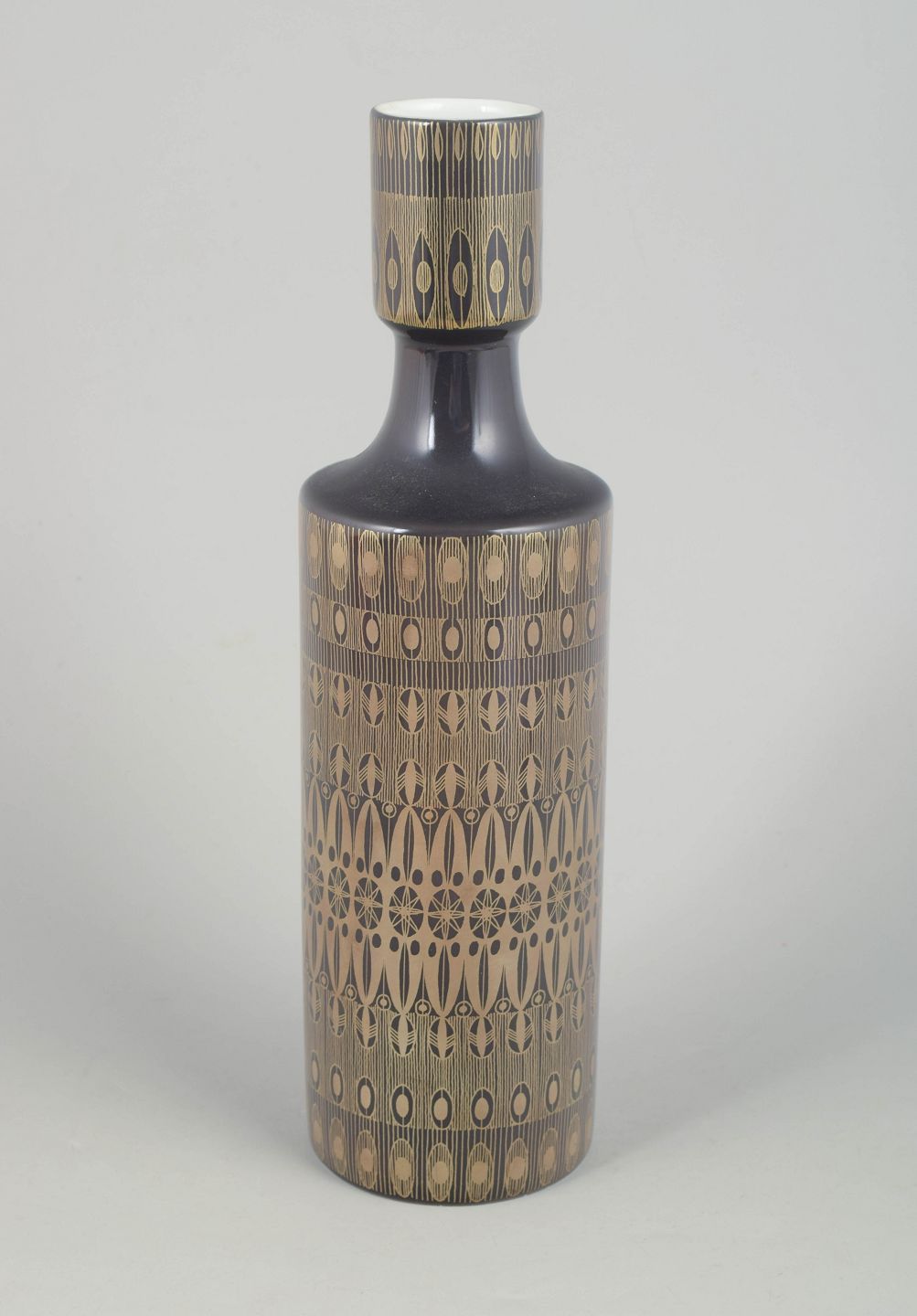 Baumann for Rosenthal, stor vase.Slank porcelænsvase med høj hals og rig gulddekoration i geometrisk mønster på mørk baggrund, typisk for Rosenthals dekorative produktion i slutningen af det 20. århundrede.