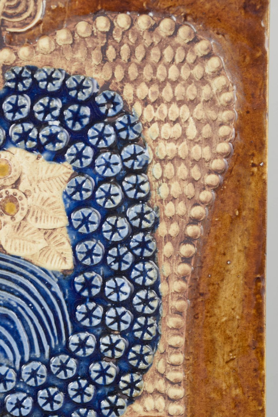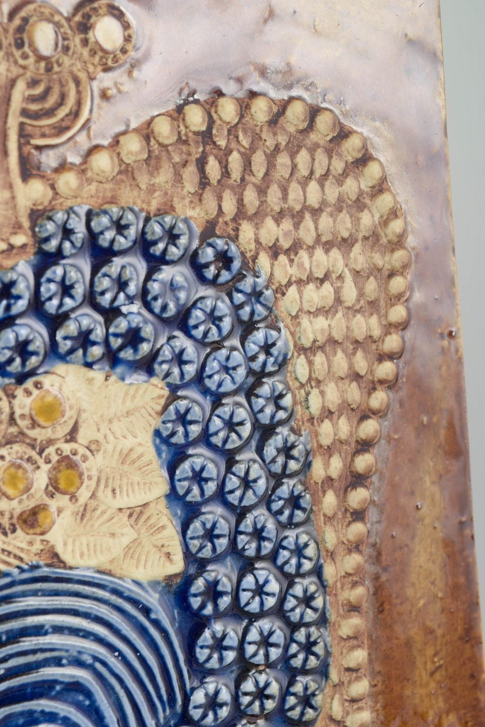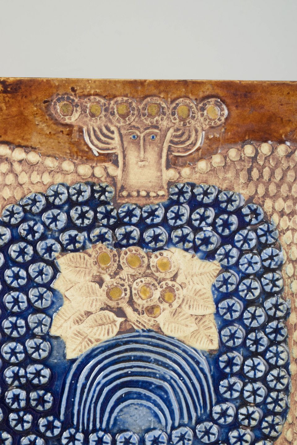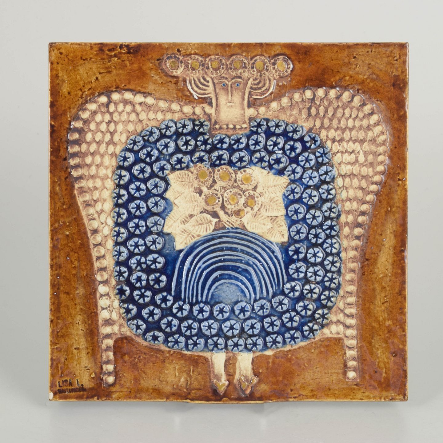 Dekorativt vægrelief i stentøj med stiliseret fuglemotiv i relief, udført i varme brune og blå nuancer med karakteristisk hånddekoreret mønster. Typisk for Lisa Larssons grafiske og folkloristiske formsprog fra 1970’erne.