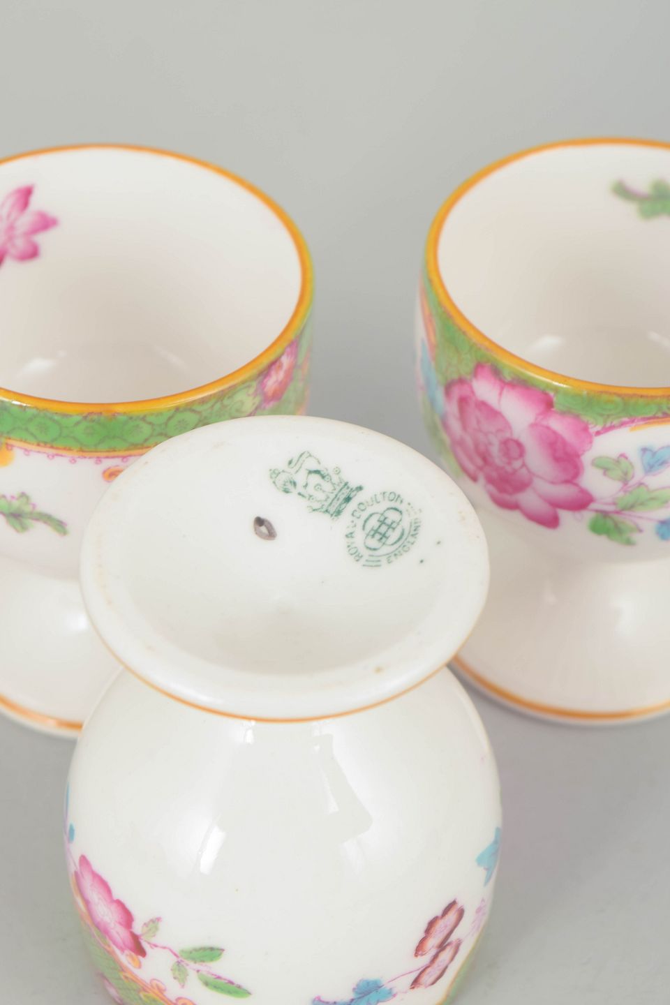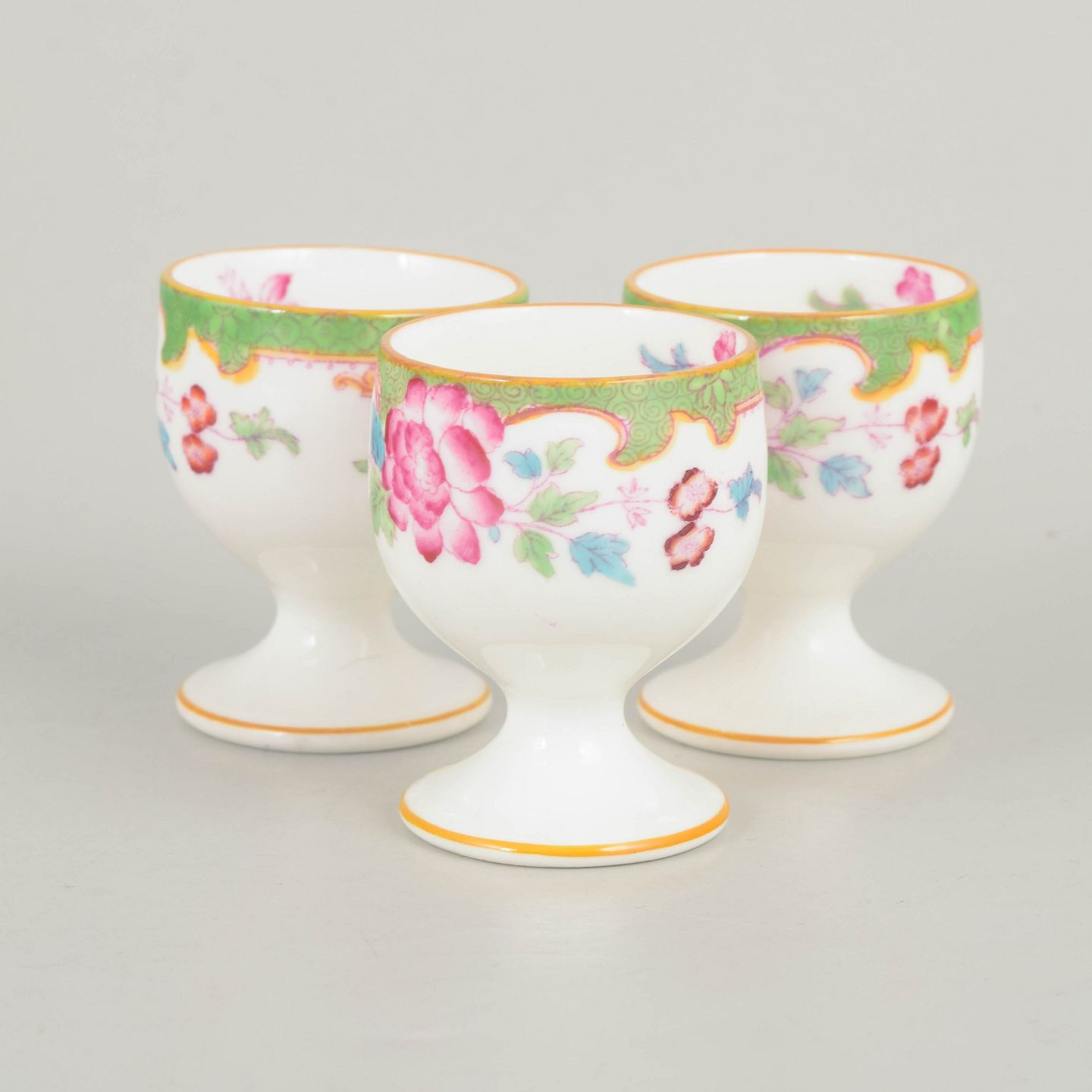 Royal Doulton "Temple", sæt af tre æggebægre.Dekorative æggebægre i porcelæn med farverig blomsterdekoration i Temple mønster og karakteristisk grøn bort.