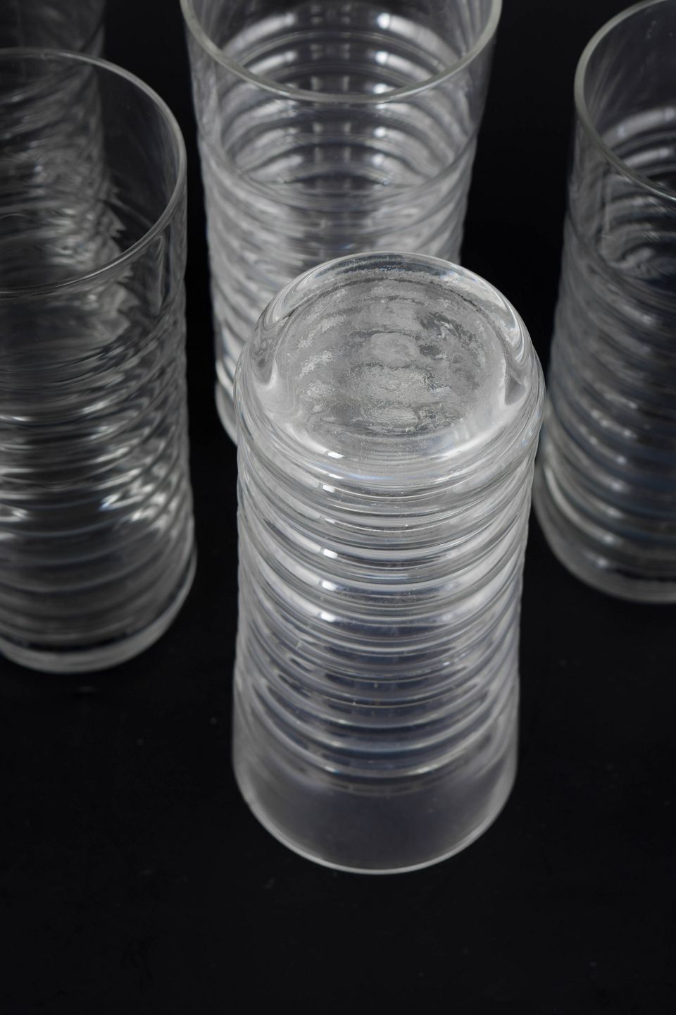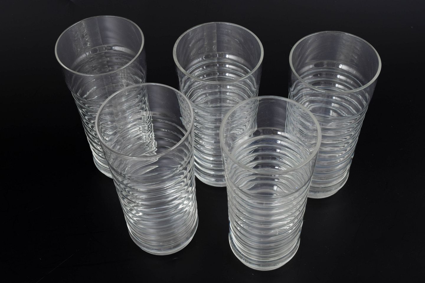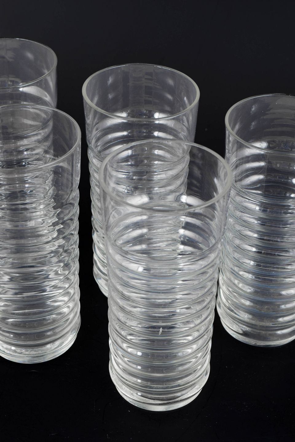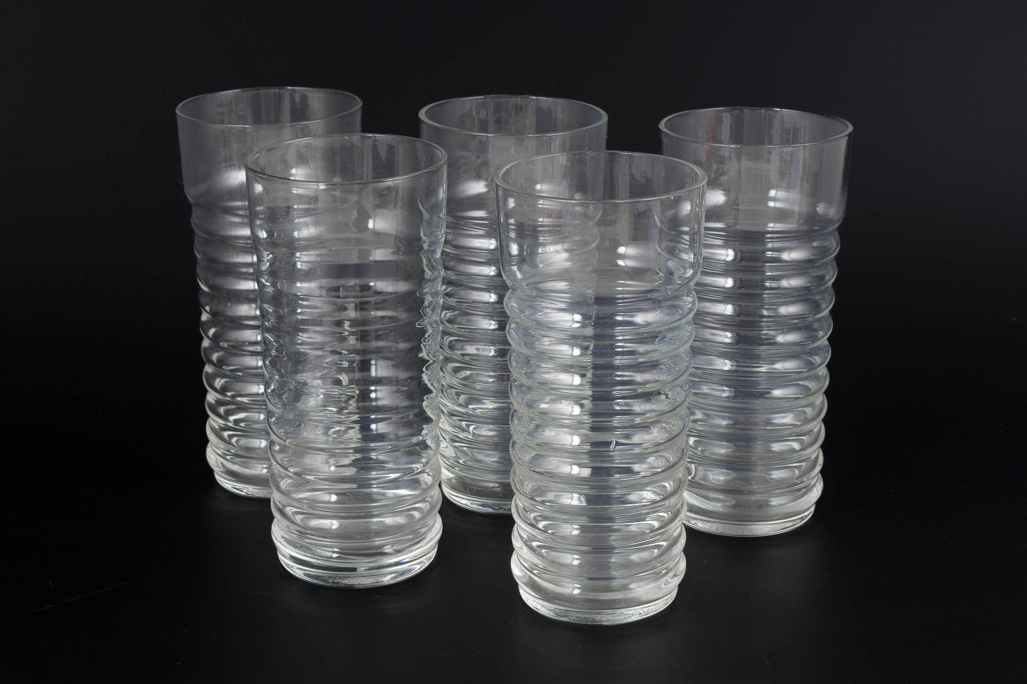 Nanny Still for Riihimäen Lasi, sæt af fem drikkeglas.Klar glas i Perpetum Mobile serien med karakteristisk rillet struktur og cylindrisk form.