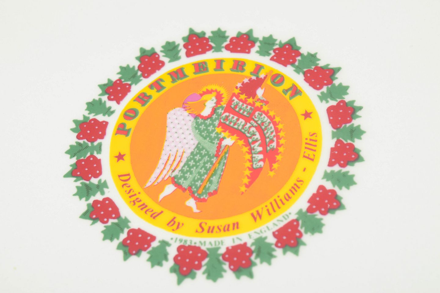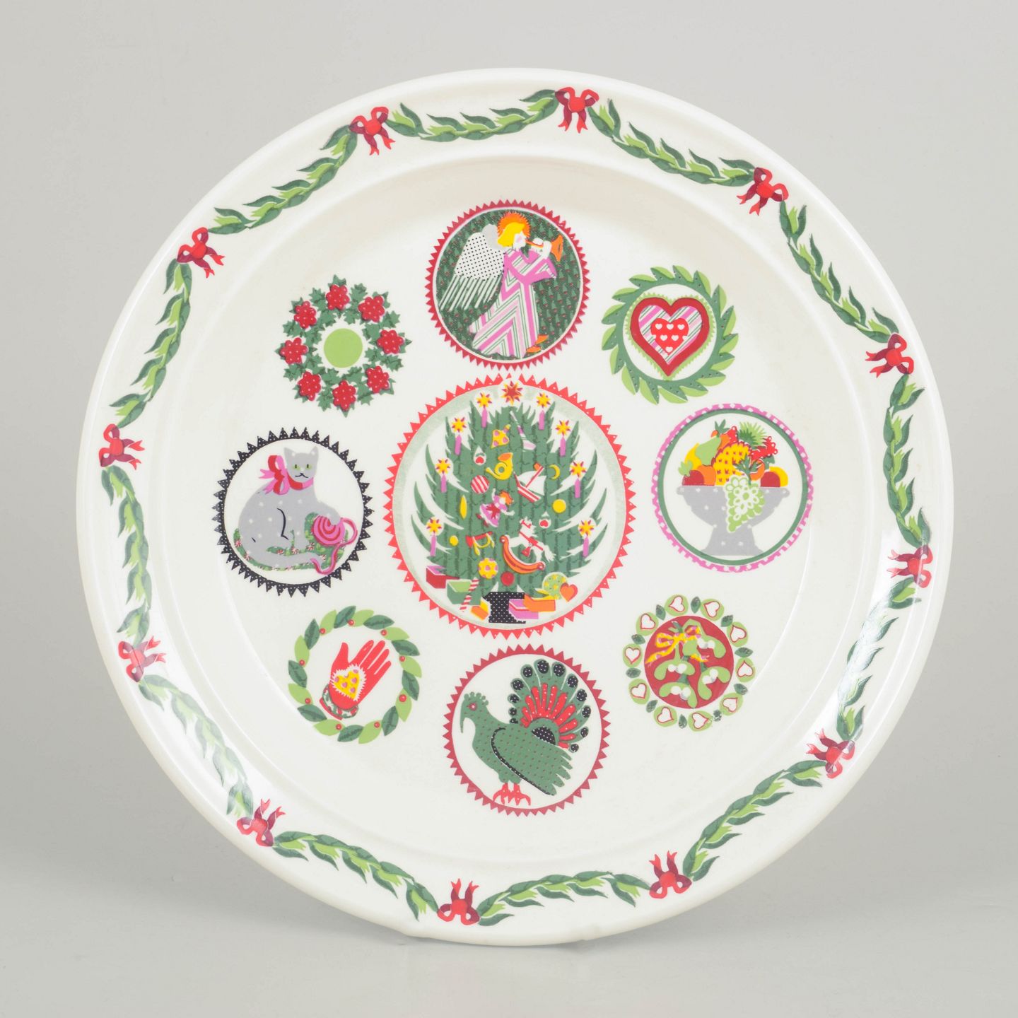 Susan Williams for Portmeirion, fad.Dekorativt porcelænsfad med flerfarvet motiv bestående af stiliserede figurer og ornamentale elementer arrangeret i cirkulære felter. Rigt dekoreret kant med grøn guirlande og røde sløjfer. Fremstår som et karakteristisk eksempel på britisk design fra 1980’erne.