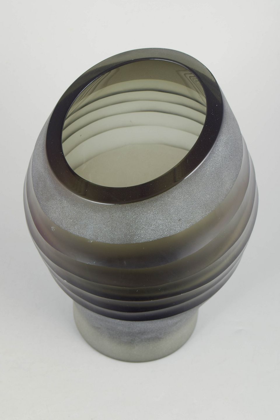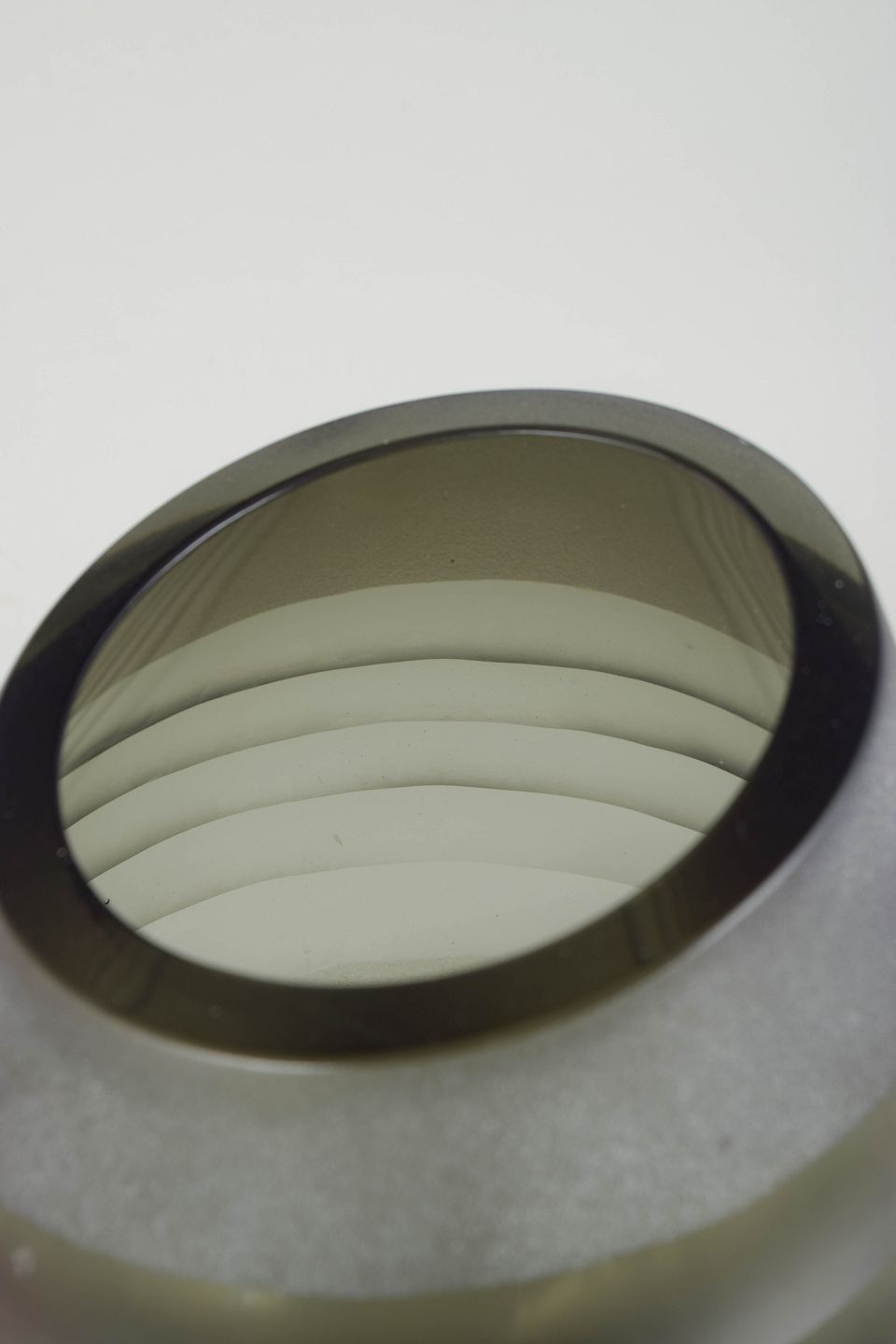 Carlo Scarpa (tilskrevet) for Venini, vase.Skulpturel mundblæst glasvase med matteret overflade og lagdelte horisontale bånd i røggrønne og grå nuancer. Elegant organisk form med karakteristisk venetiansk glasbearbejdning.