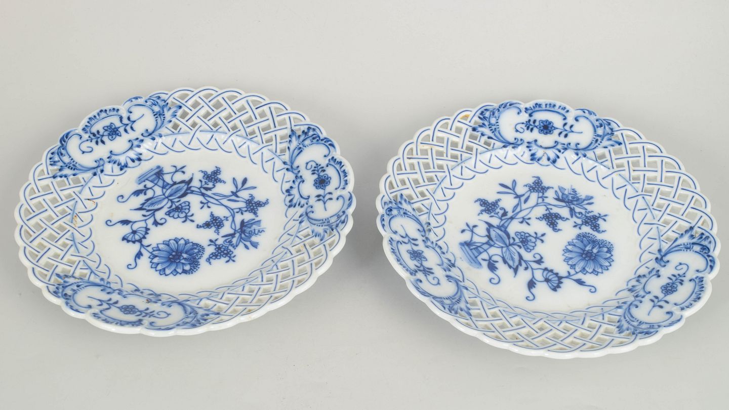 Stadt Meissen, to middagstallerkener.Klassiske middagstallerkener i porcelæn med gennembrudt fane og blå løgmønstret dekoration i underglasur. Elegant håndmalet udtryk med fin detaljering.