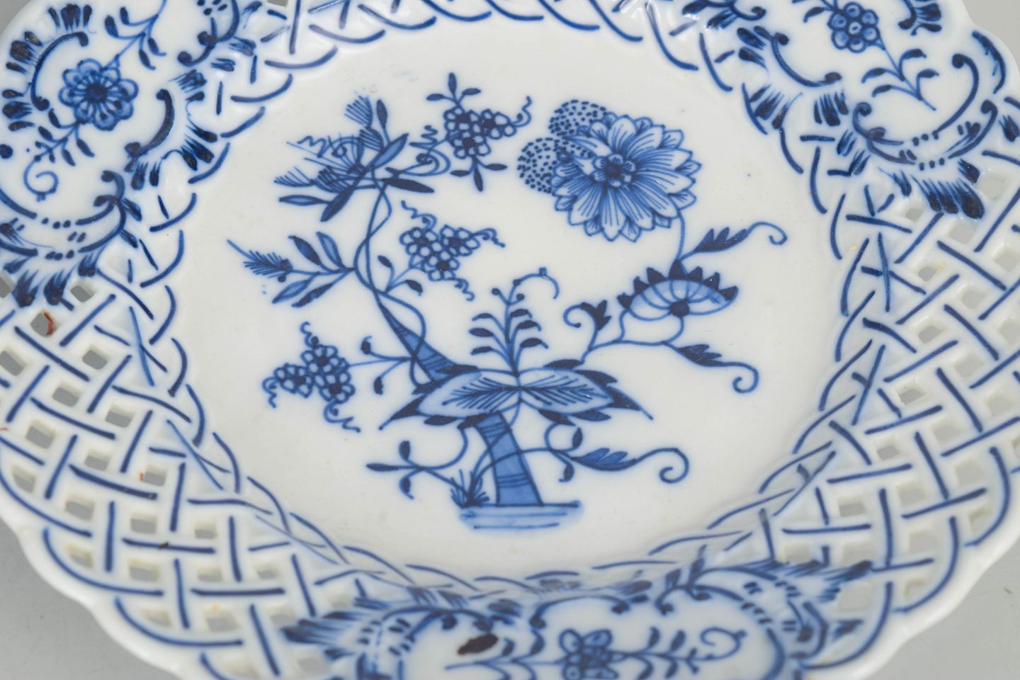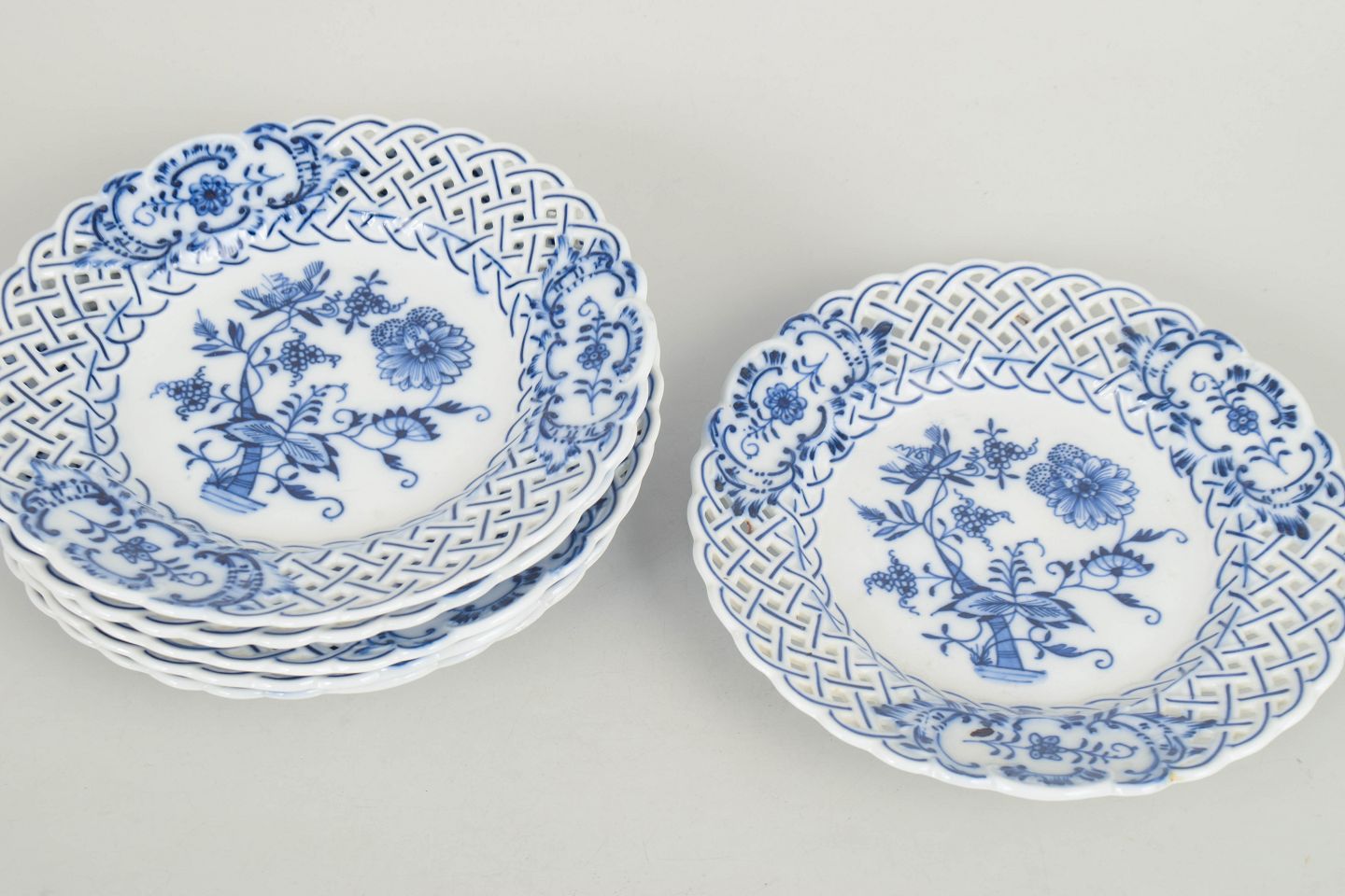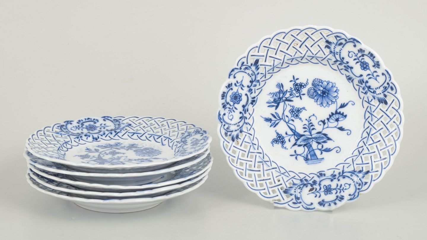 Stadt Meissen, sæt med seks salattallerkener.Klassiske salattallerkener i porcelæn med gennembrudt fane og blå løgmønstret dekoration i underglasur. Traditionelt håndmalet udtryk med fin detaljering.