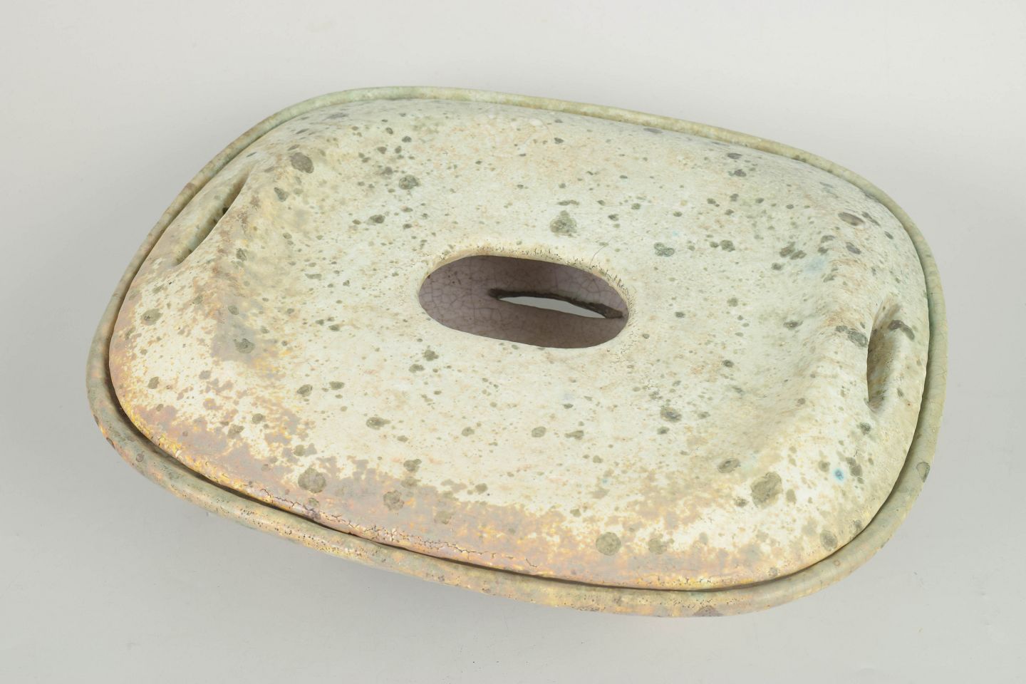 Hans Hedberg for Biot, lågskål.Organisk formet lågskål i stentøj med karakteristisk plettet glasur i lyse, jordnære toner. Skulpturel form med bløde linjer og låg med åbning, typisk for Hans Hedbergs keramiske arbejder fra Biot.