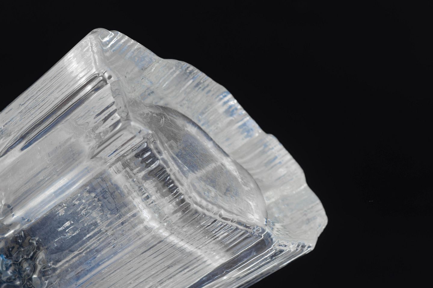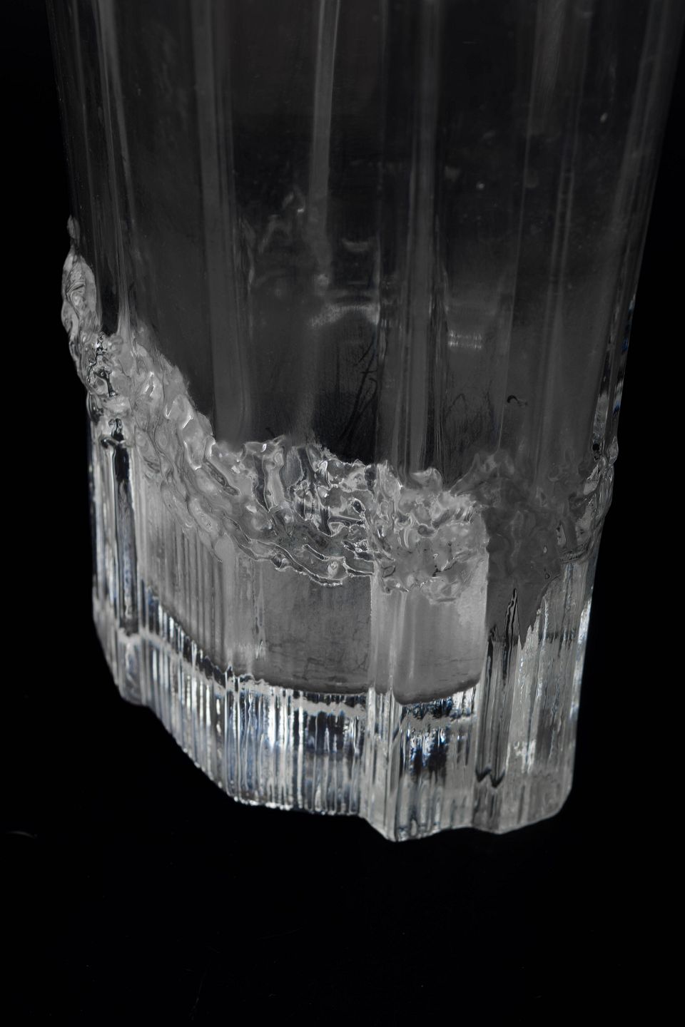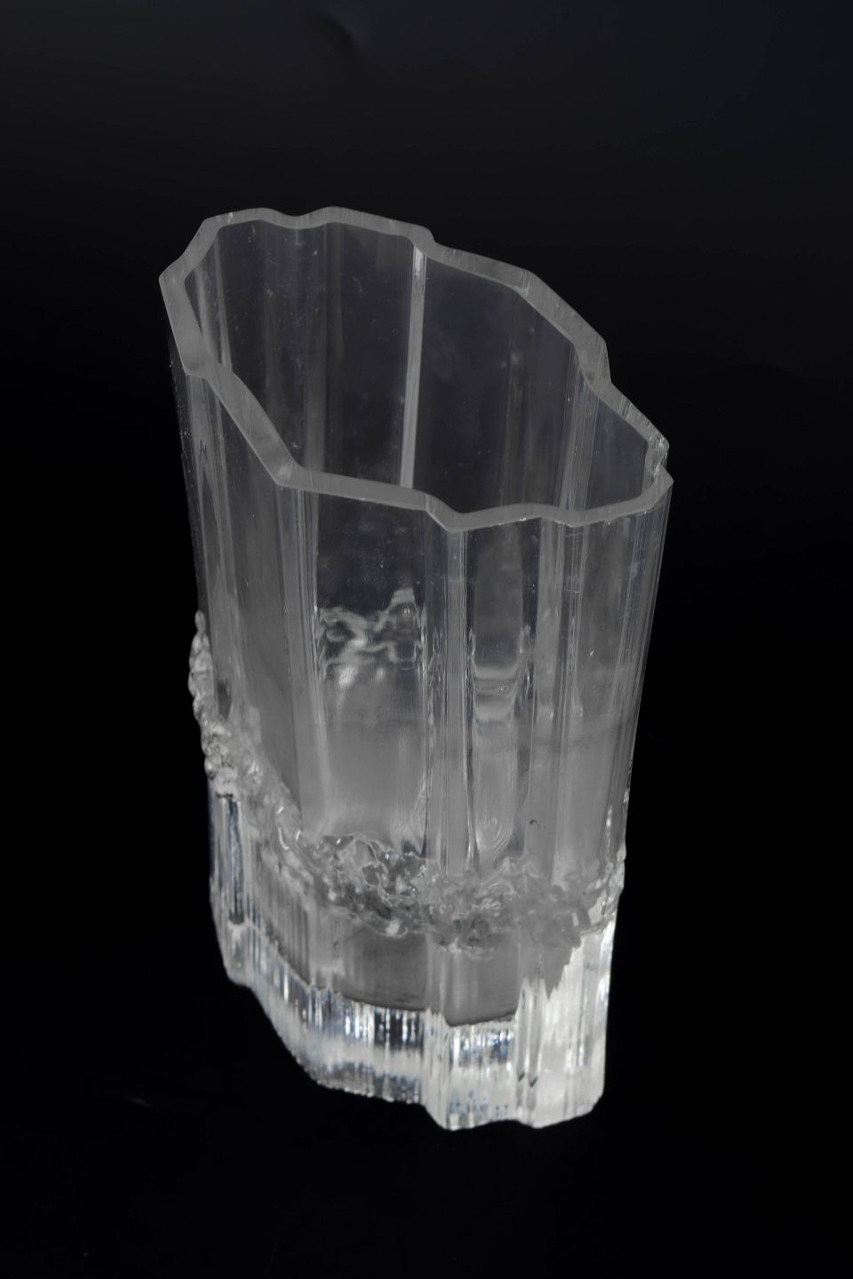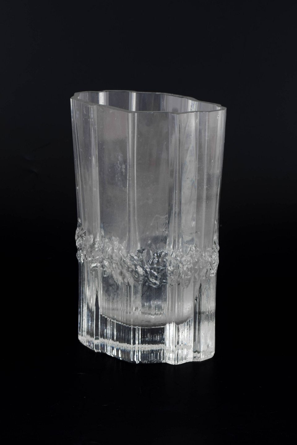 Tapio Wirkkala for Iittala, vase.Klar glasvase med karakteristisk is-struktureret bælte omkring midten og lodrette slebne flader. Organisk form med let bølget kant.