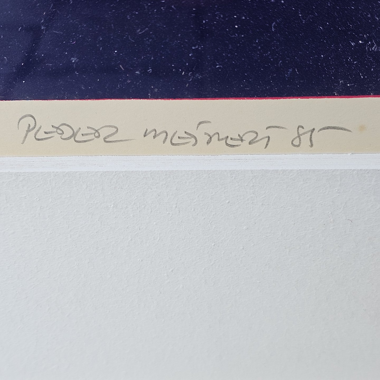 Litografi i rød og mørkeblå med baggrund af brosten i metal ramme. 13/45